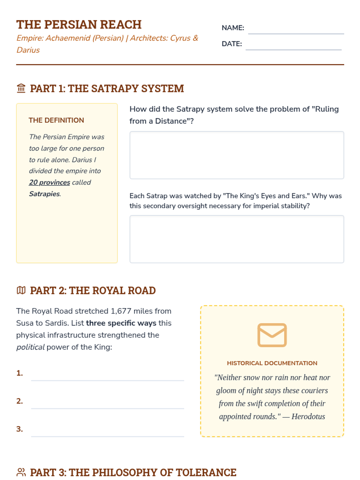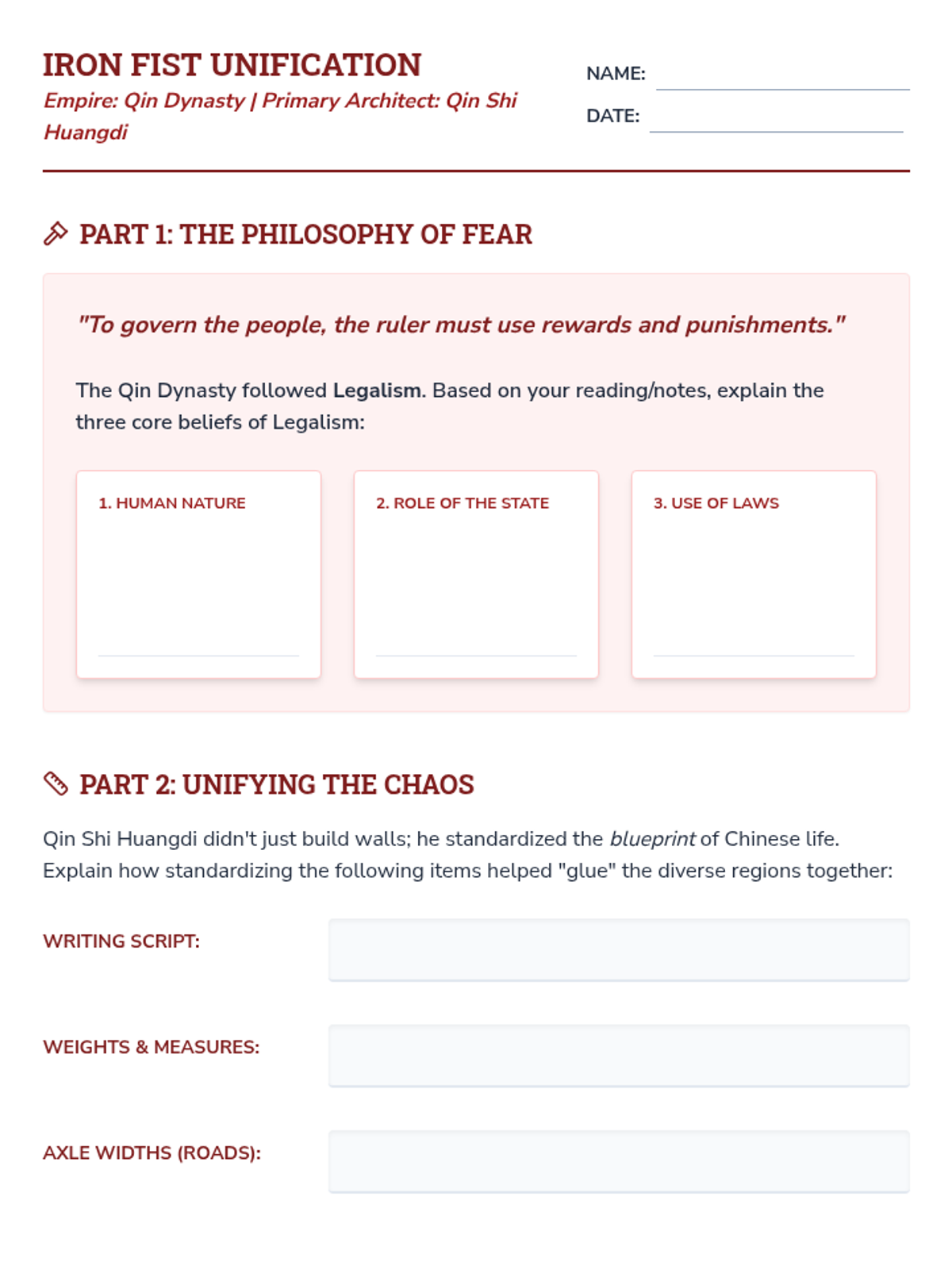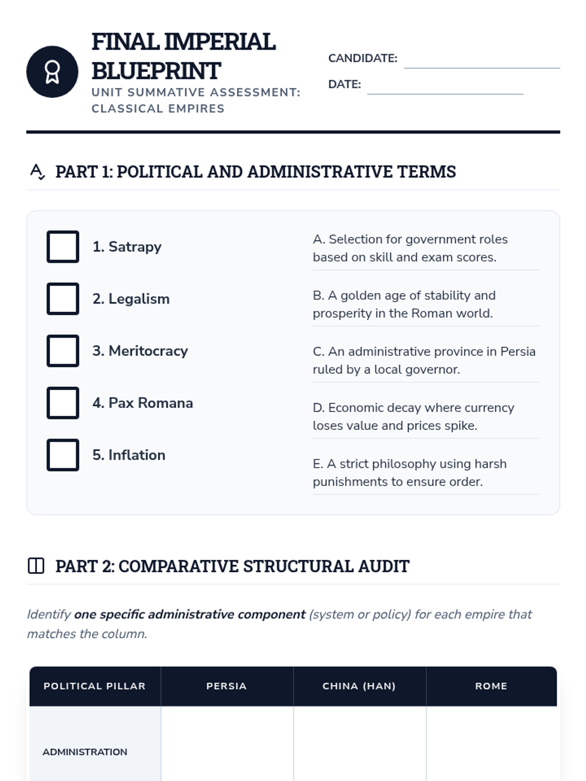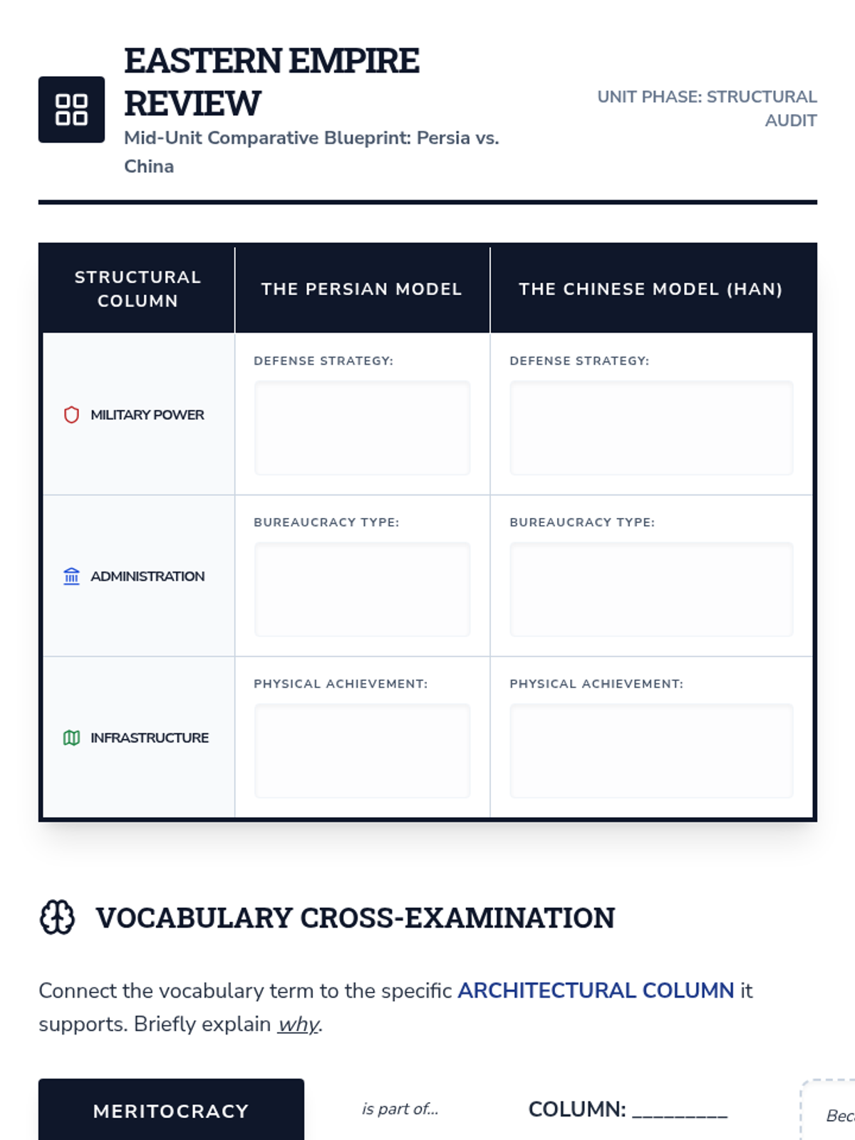 An intensive two-week exploration of the Classical Period's greatest powers—Persia, China, and Rome. Students act as 'Imperial Architects,' analyzing the structural components that allowed these empires to rise, flourish, and eventually crumble.
