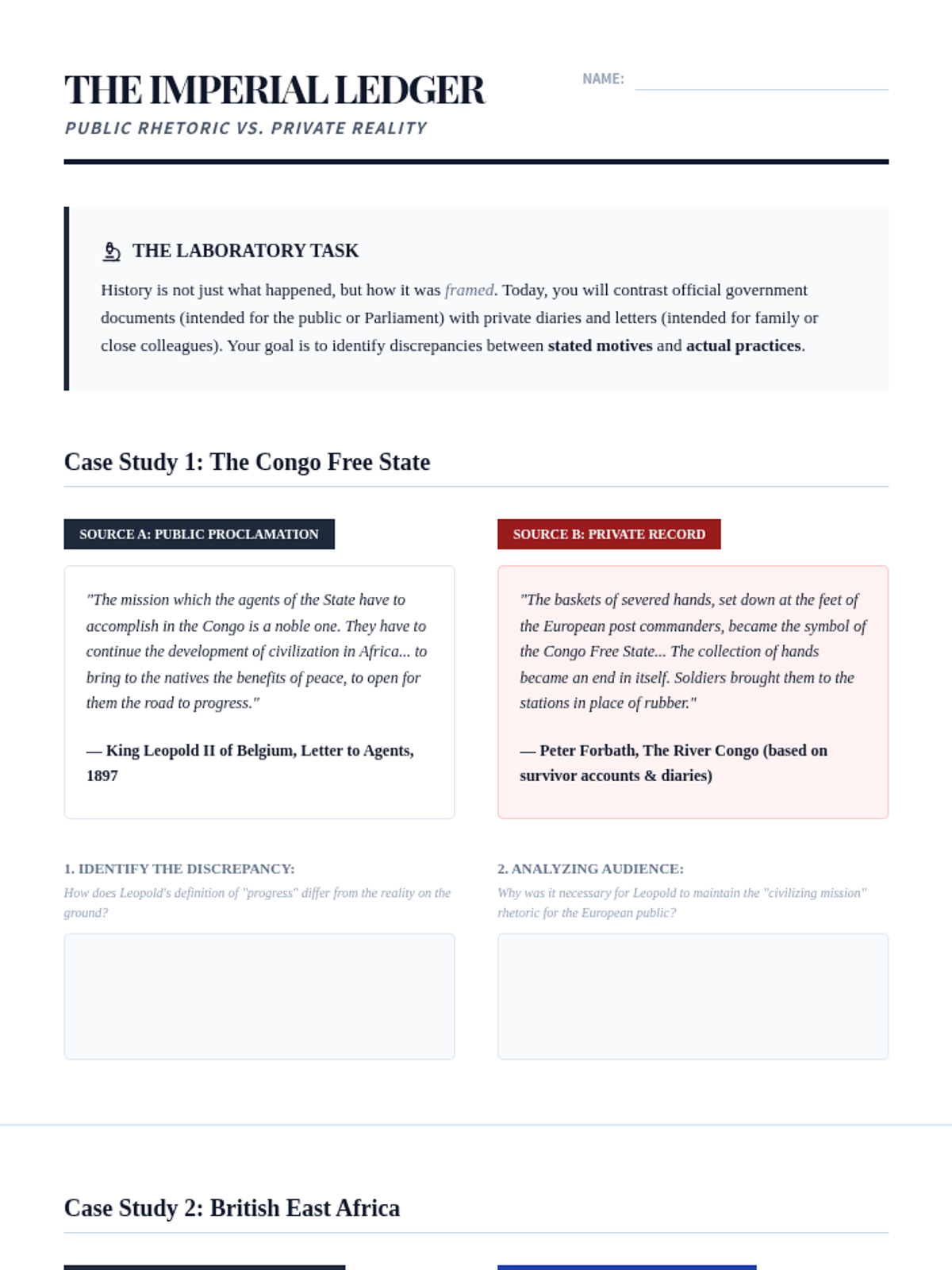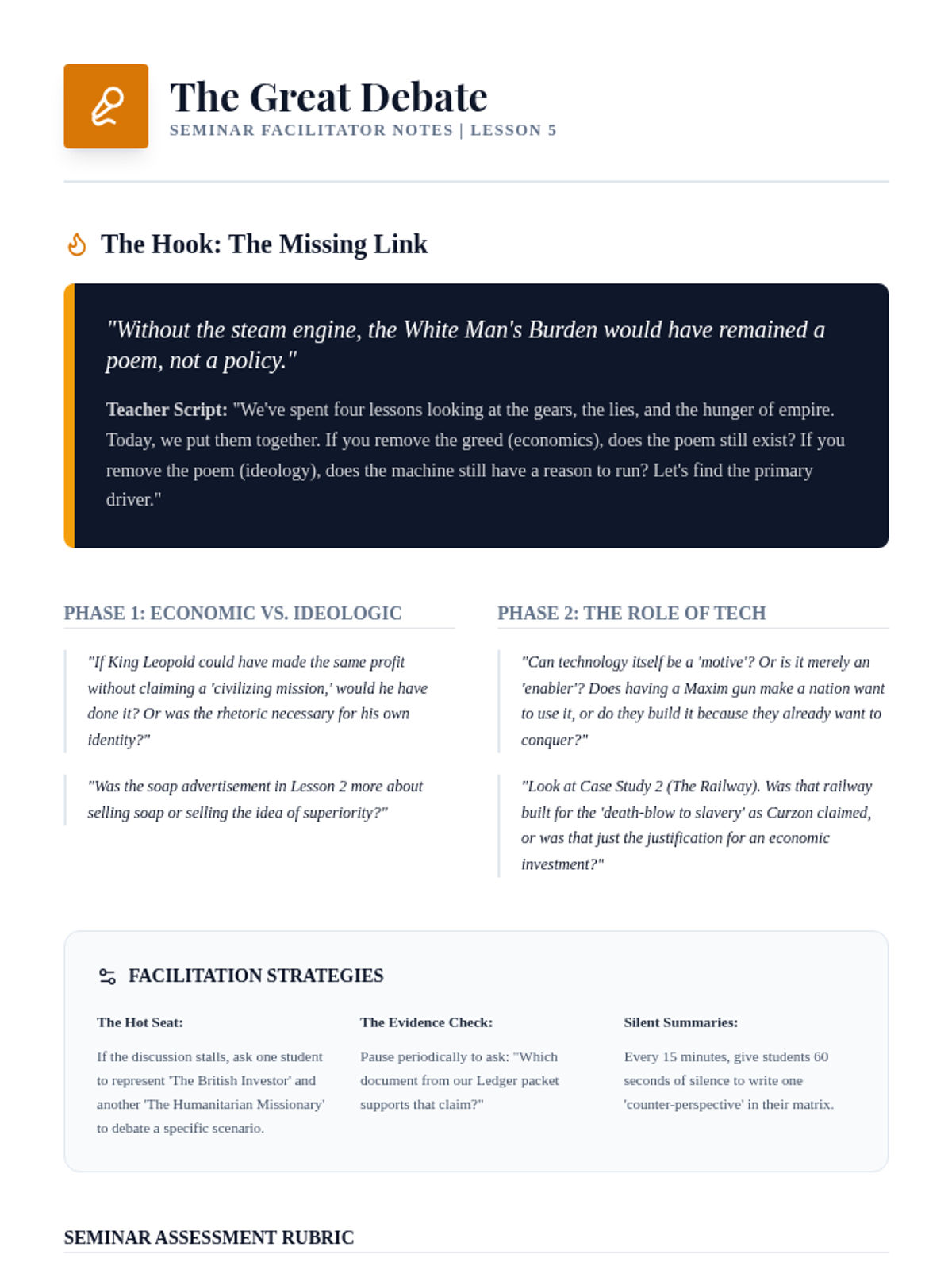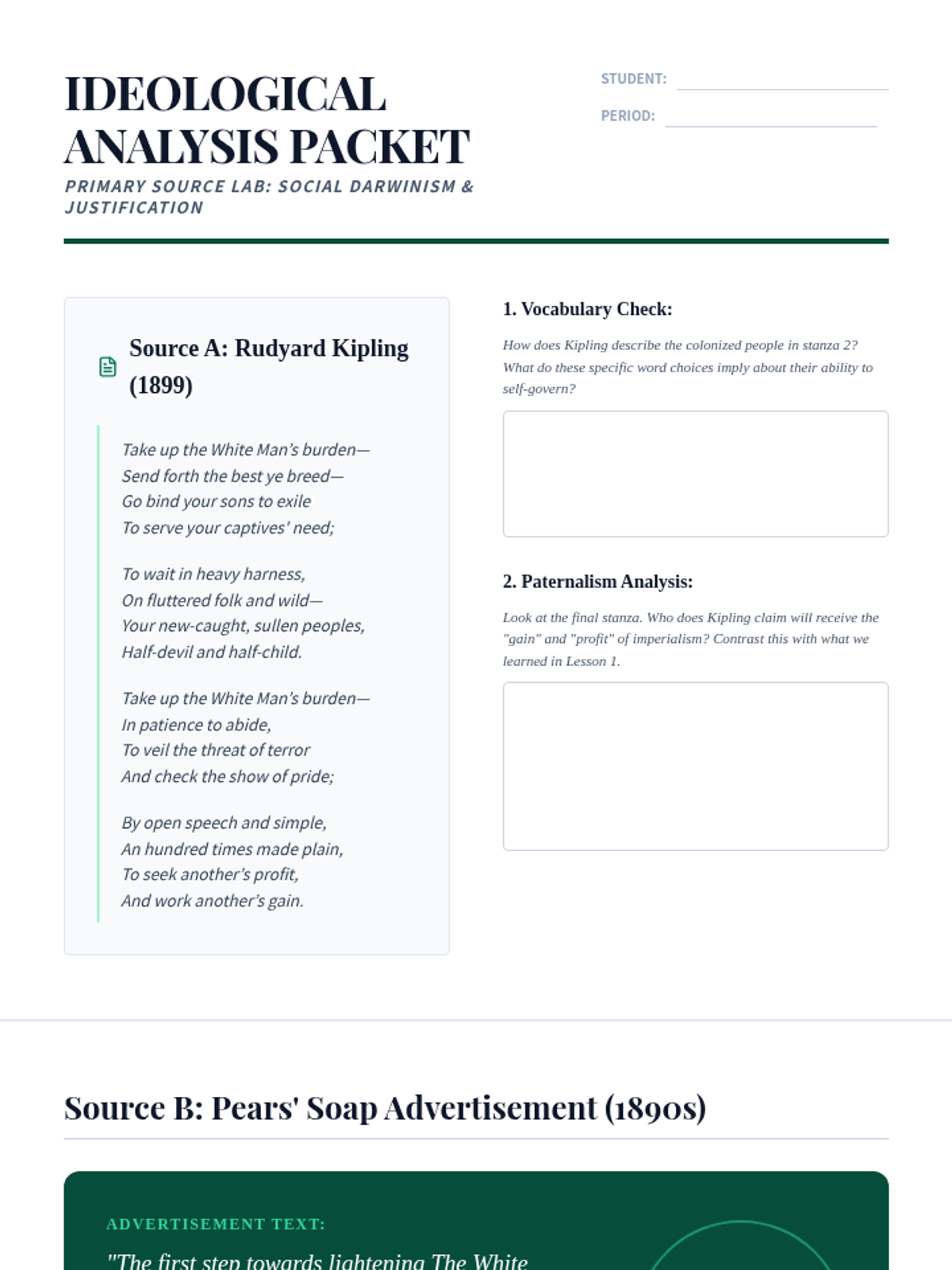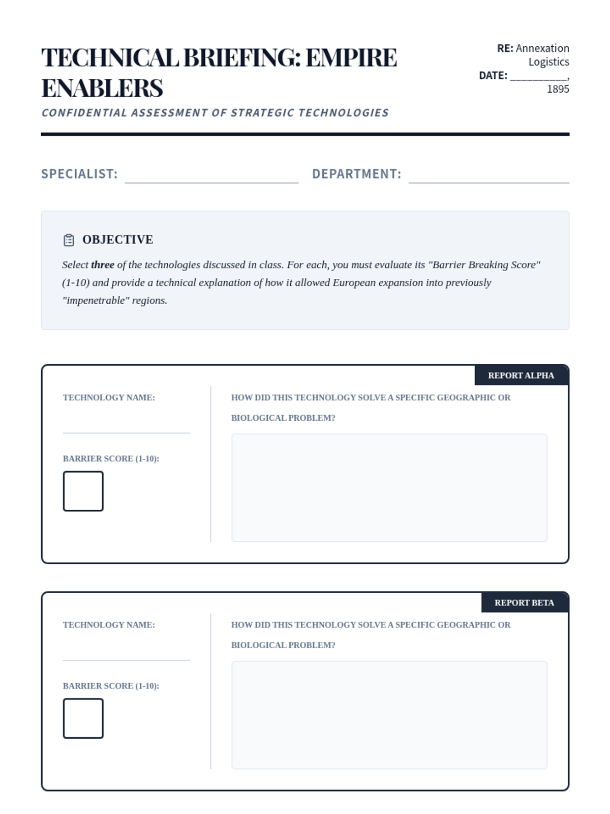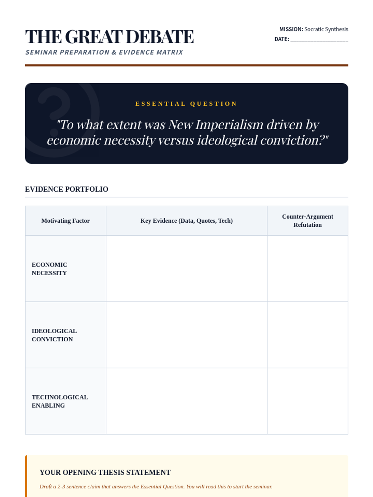 This sequence explores the economic, ideological, and technological drivers of 19th-century New Imperialism. Students analyze how the Industrial Revolution, Social Darwinism, and modern inventions combined to facilitate global expansion, concluding with a formal seminar on the primary motivations for empire.