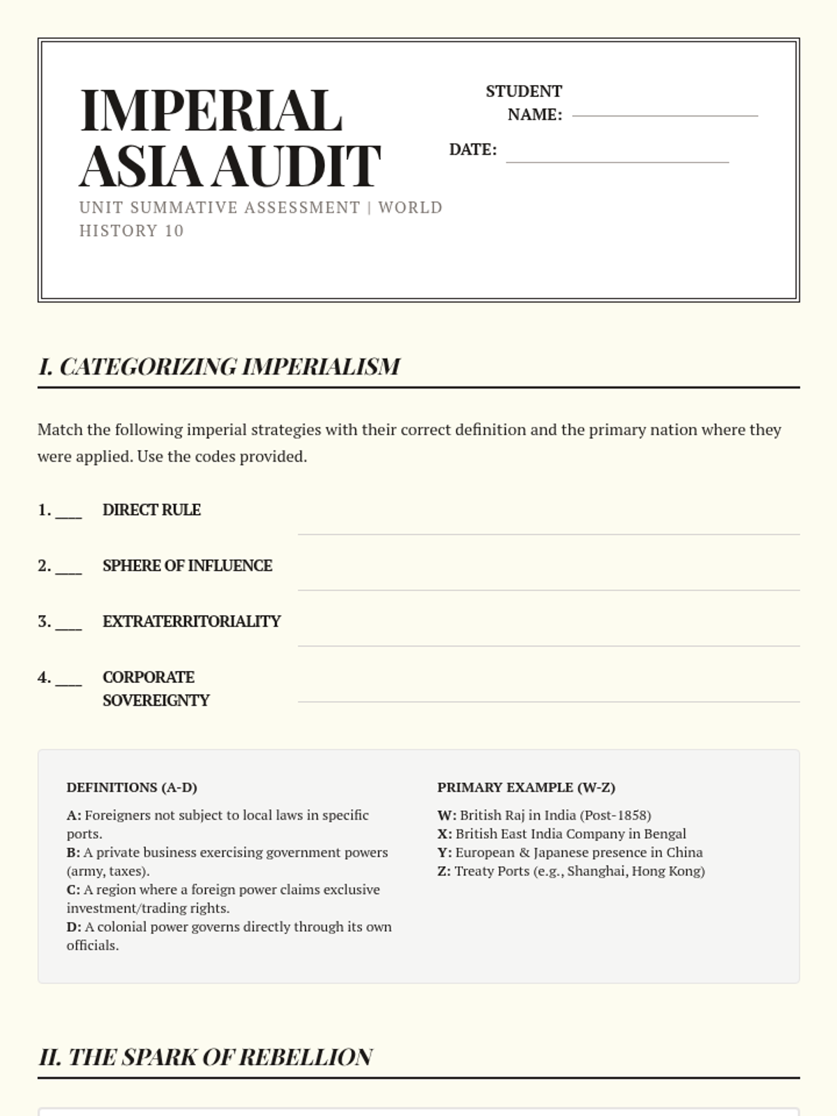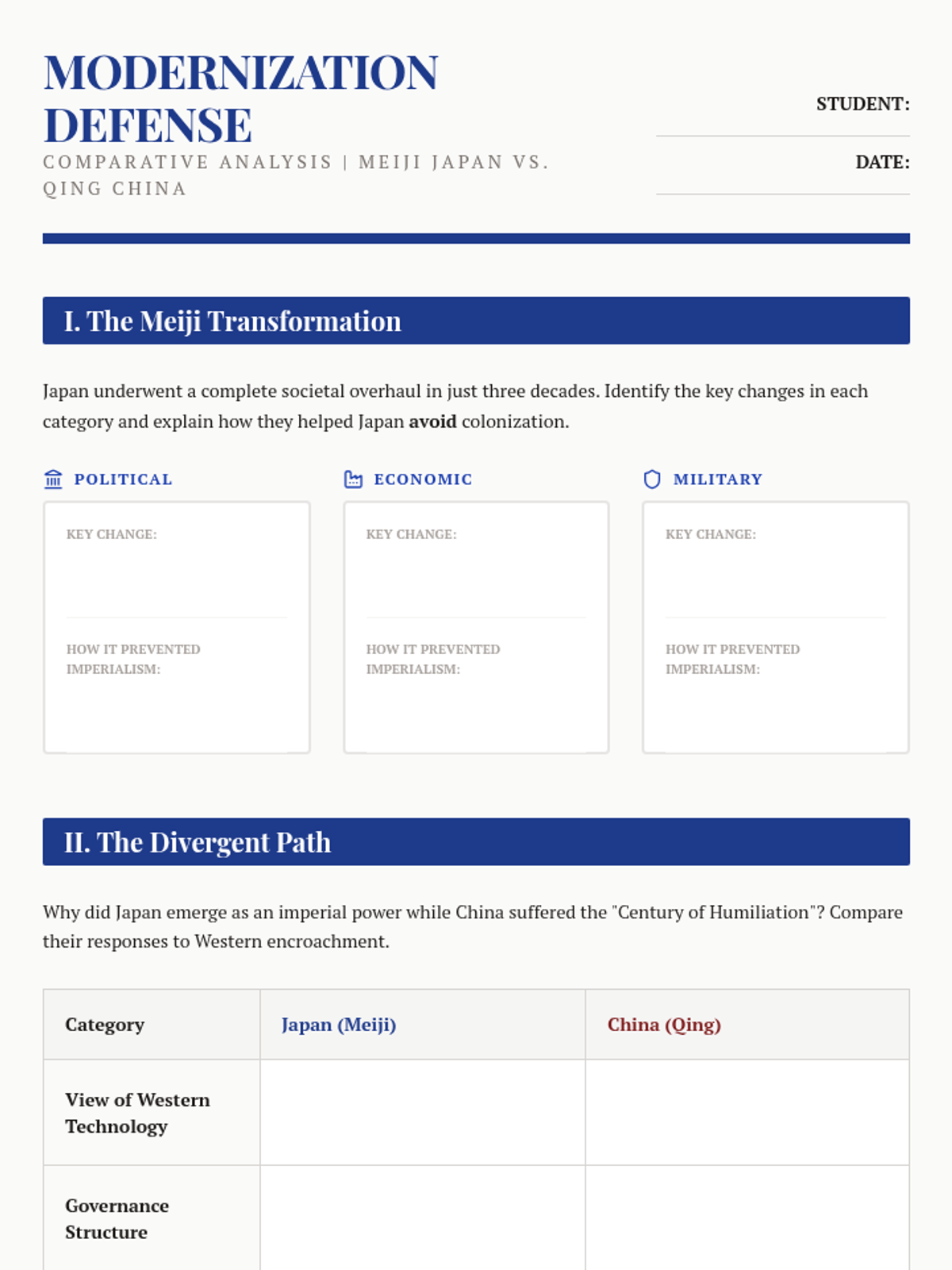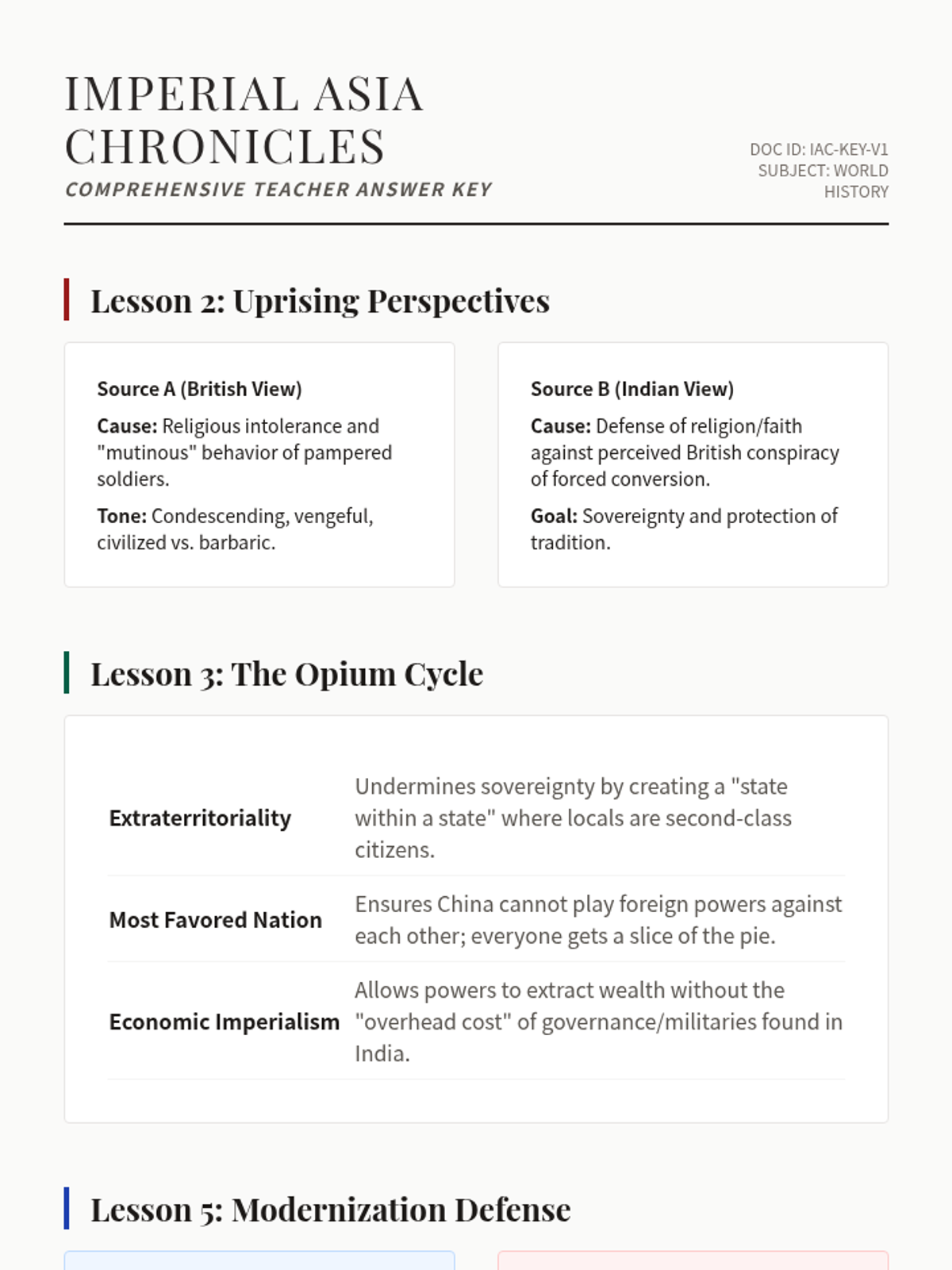 A comprehensive unit for 10th-grade students comparing imperialist strategies in India, China, and Japan. The sequence examines the transition from trade to direct rule, the role of economic imperialism, and the diverse indigenous responses ranging from rebellion to rapid modernization.