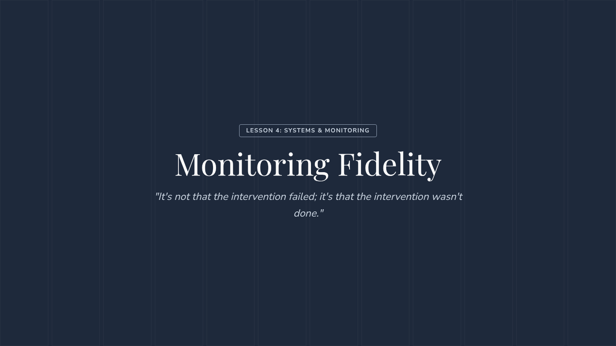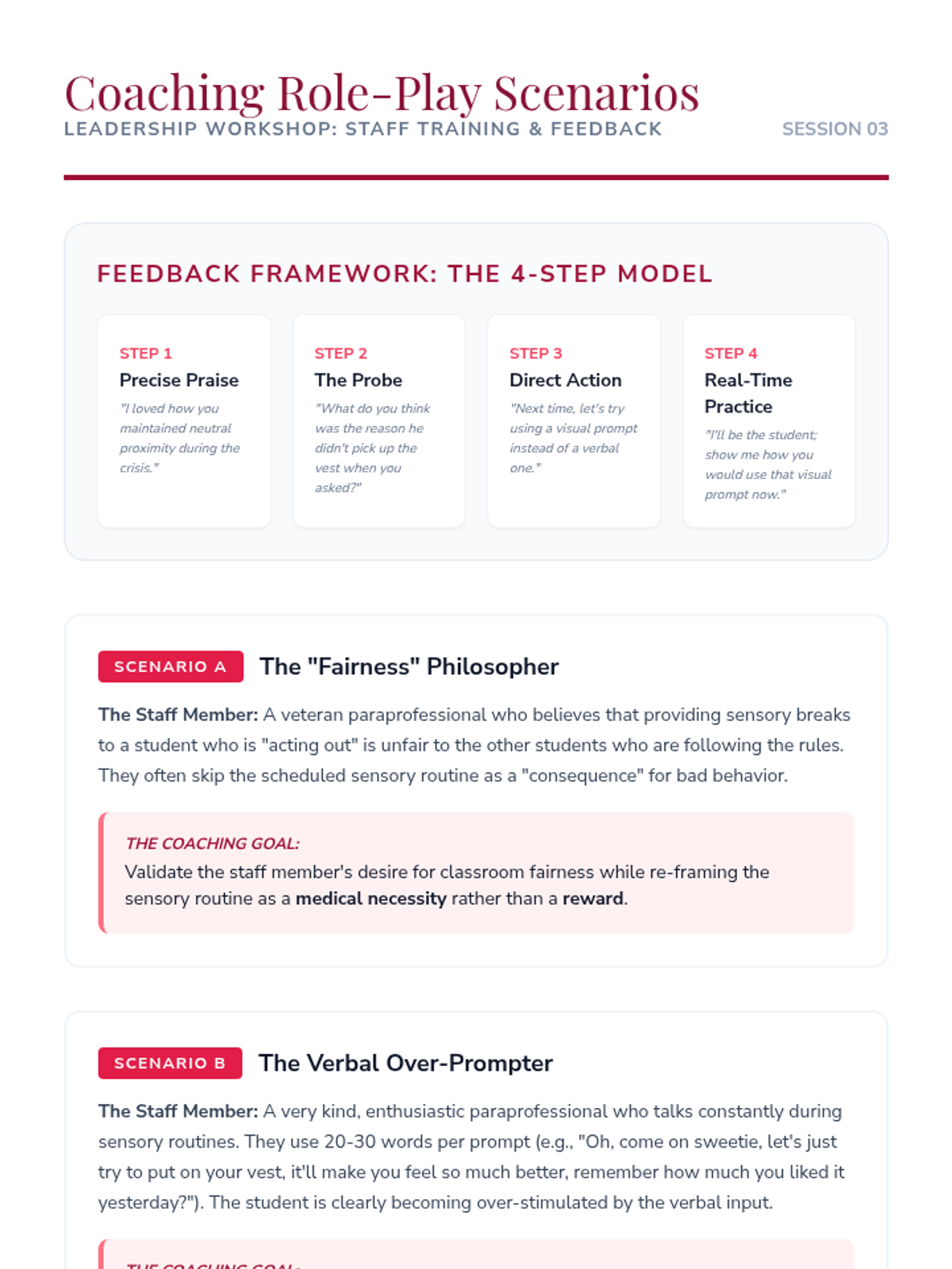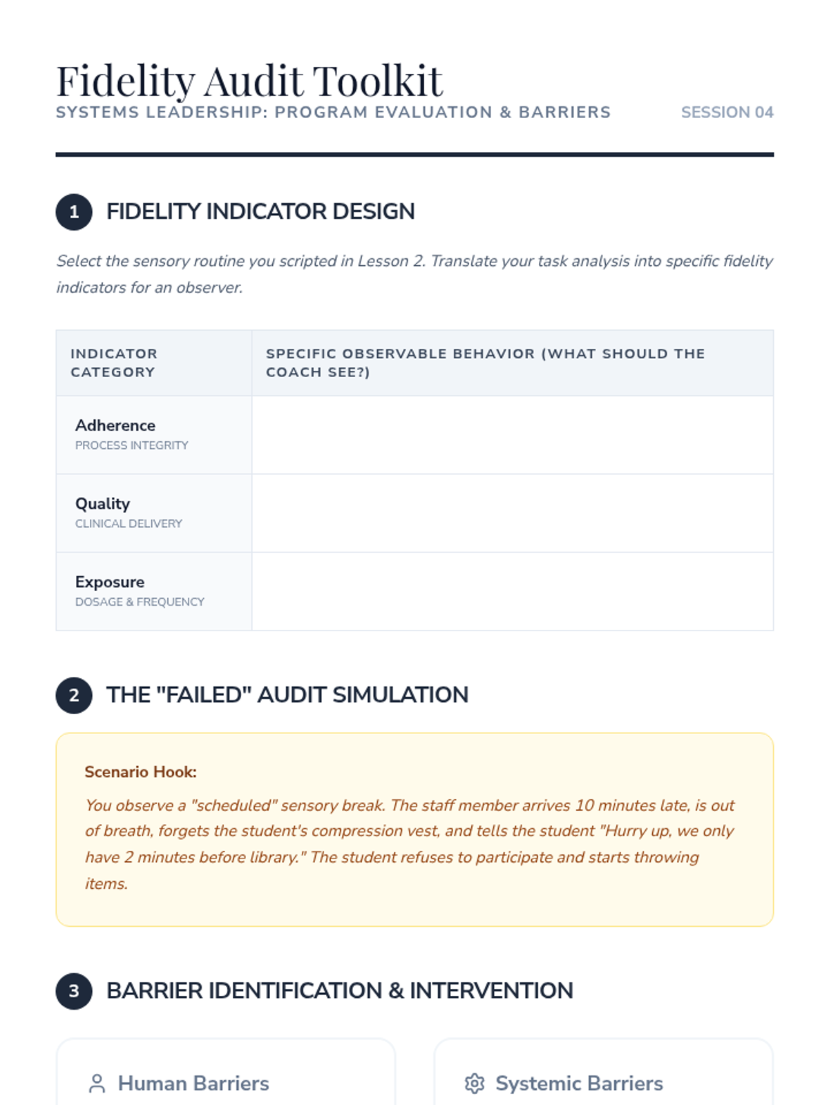 A graduate-level sequence focused on the practical implementation, staff coaching, and ethical management of sensory regulation routines in special education settings. Students move from personal co-regulation skills to system-wide leadership and fidelity monitoring.