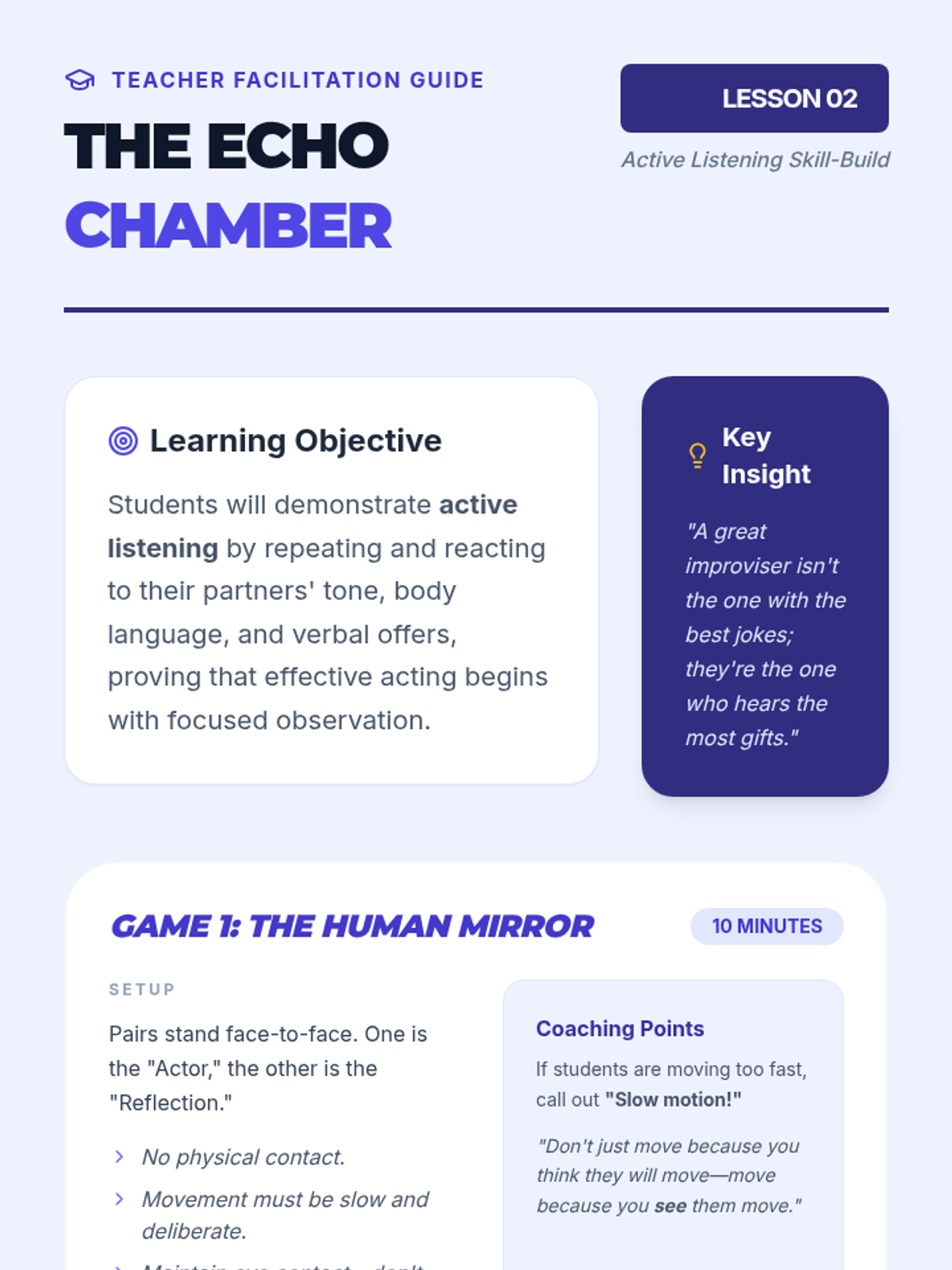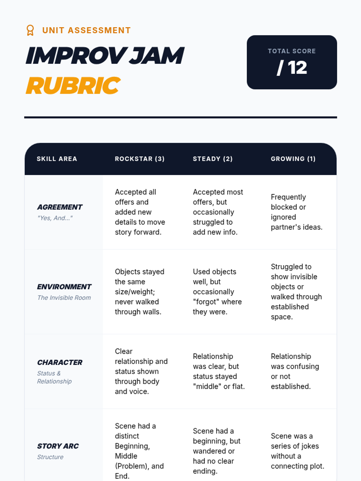A 5-lesson unit for 4th-grade theater students focusing on the core principles of improvisation: agreement, active listening, environment building, character relationships, and narrative structure. Students develop spontaneity and teamwork through game-based learning.