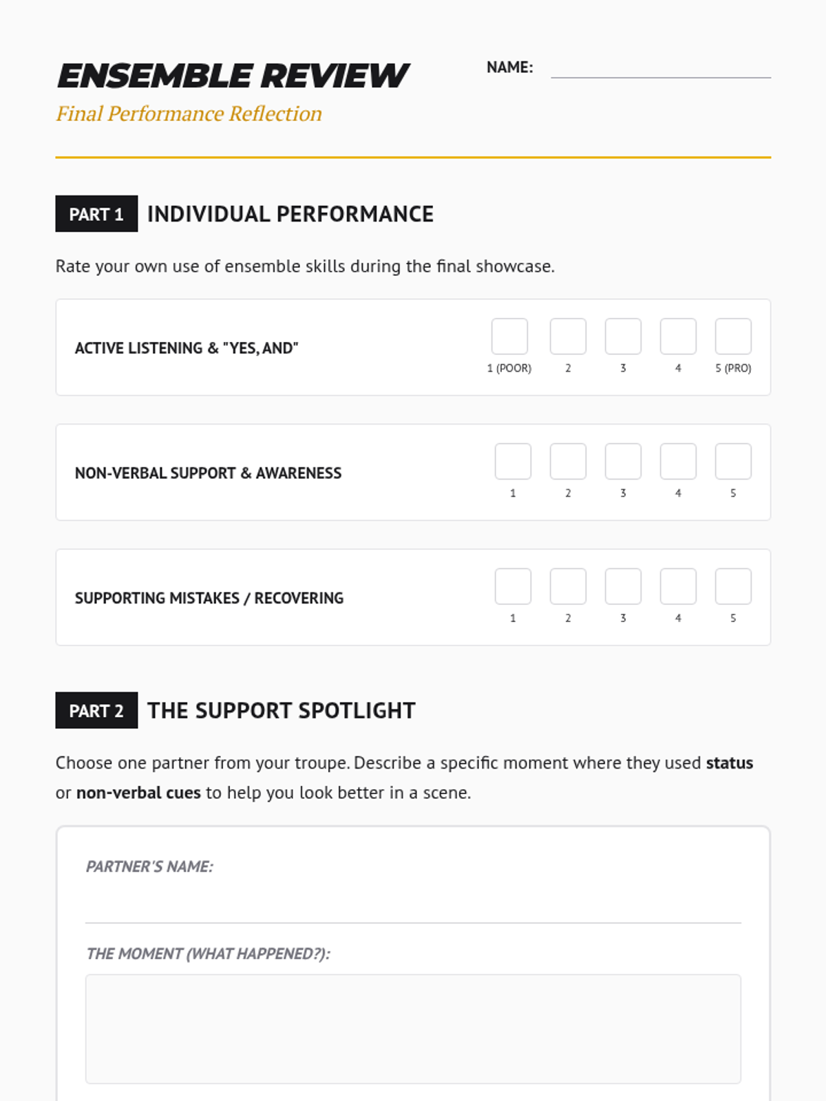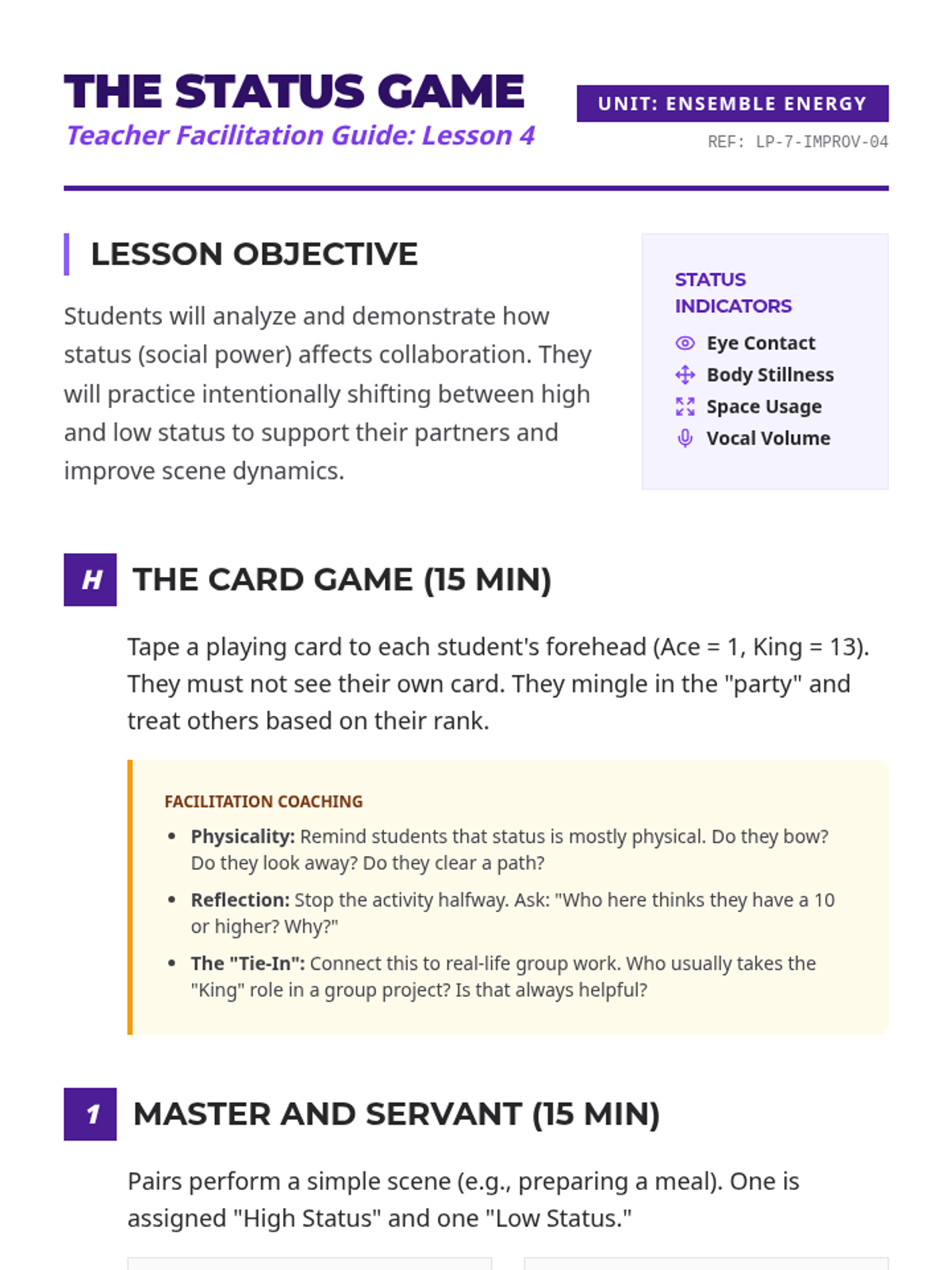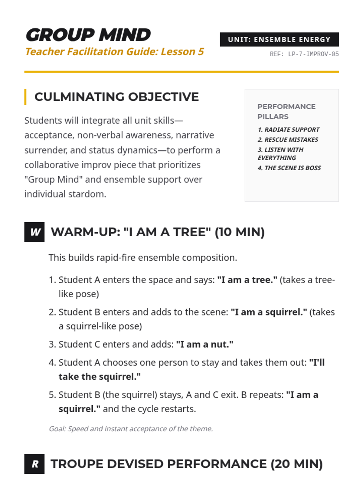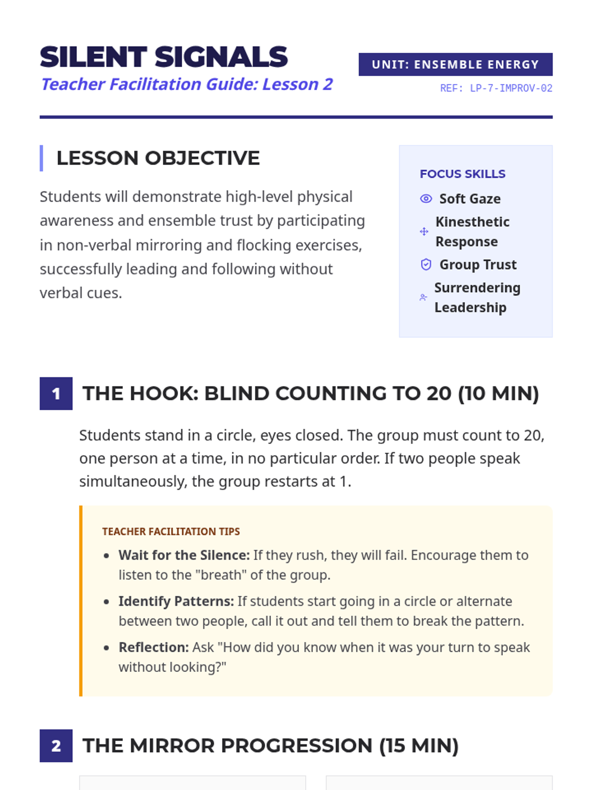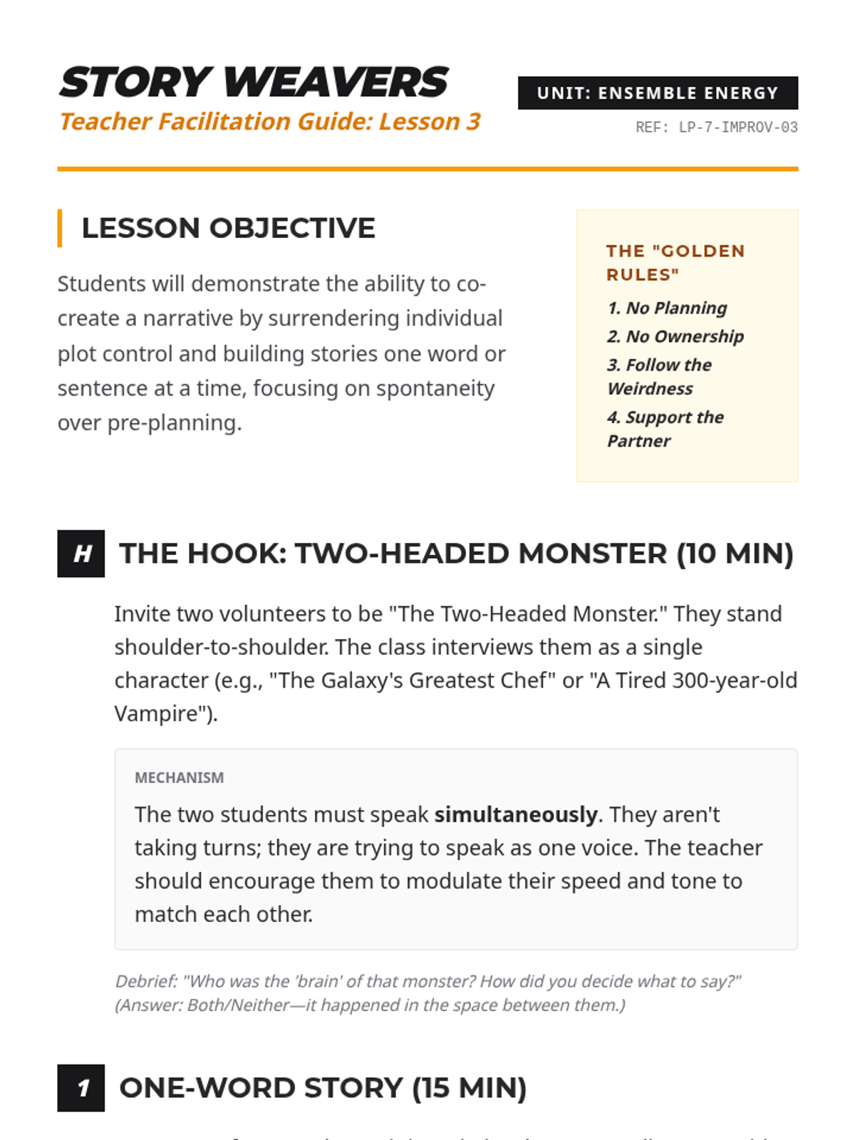 A 5-lesson sequence for 7th-grade students exploring improvisational theater techniques to build collaboration skills, focusing on active listening, adaptability, and the 'Yes, And' philosophy. Students progress from basic acceptance to complex ensemble narrative construction.