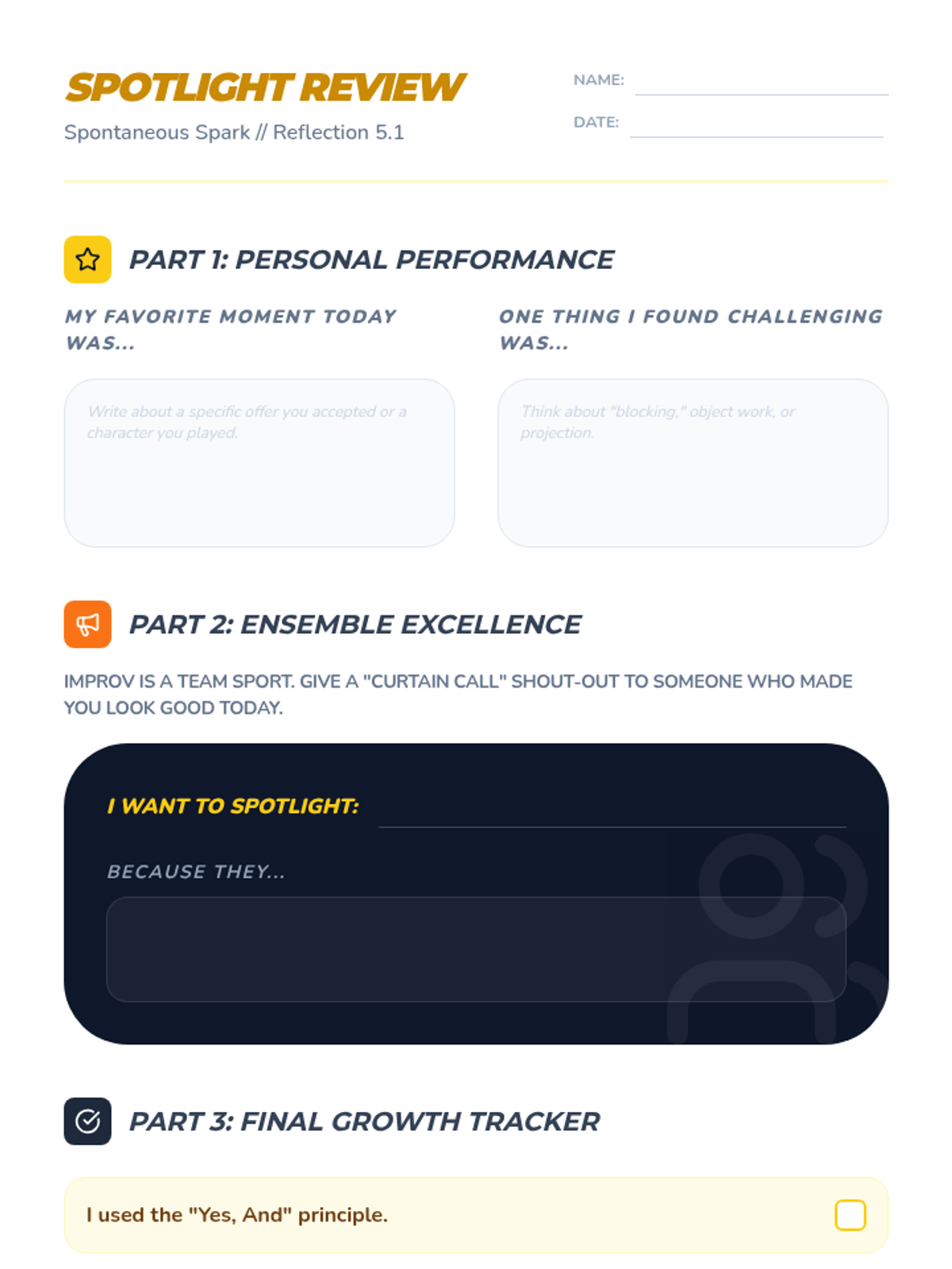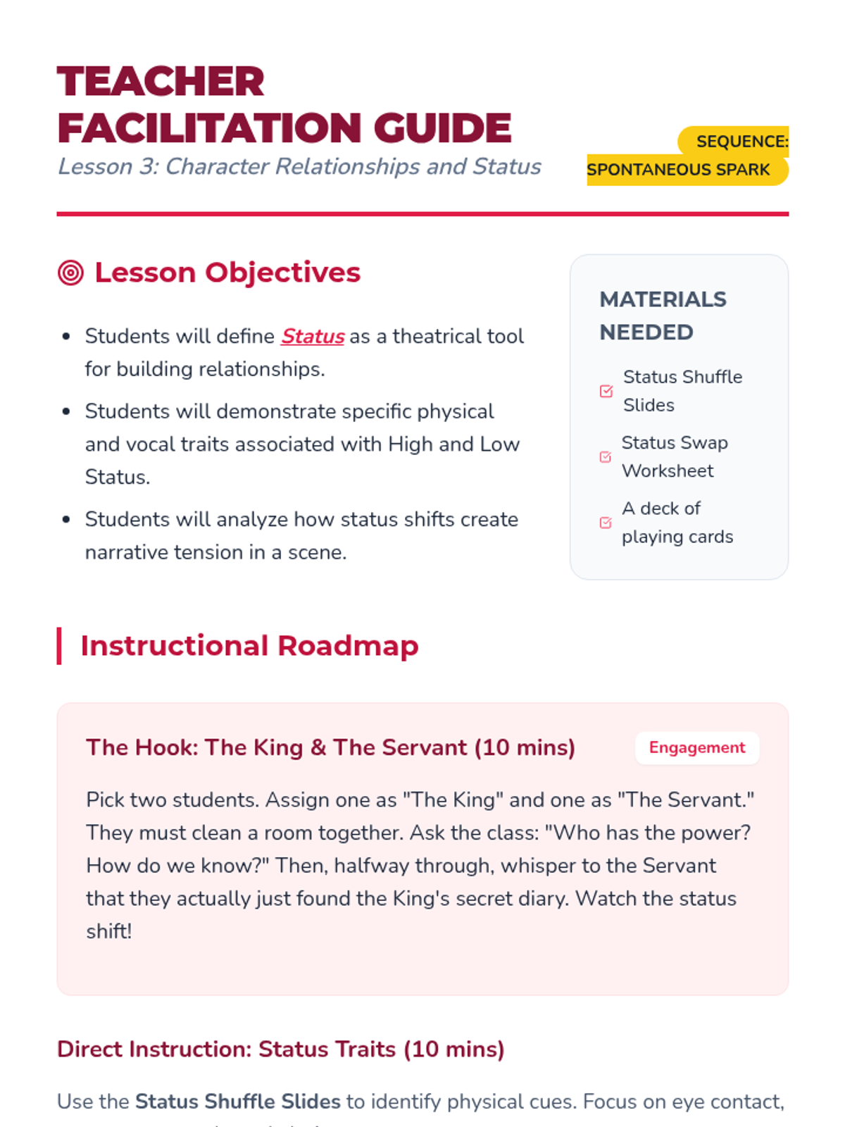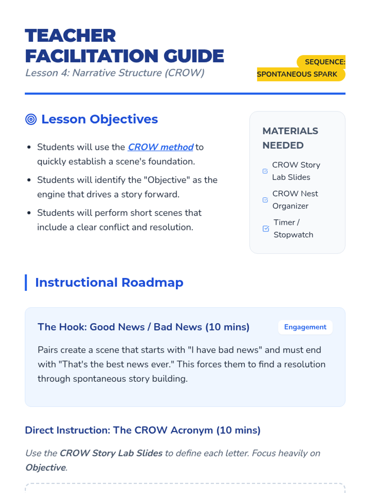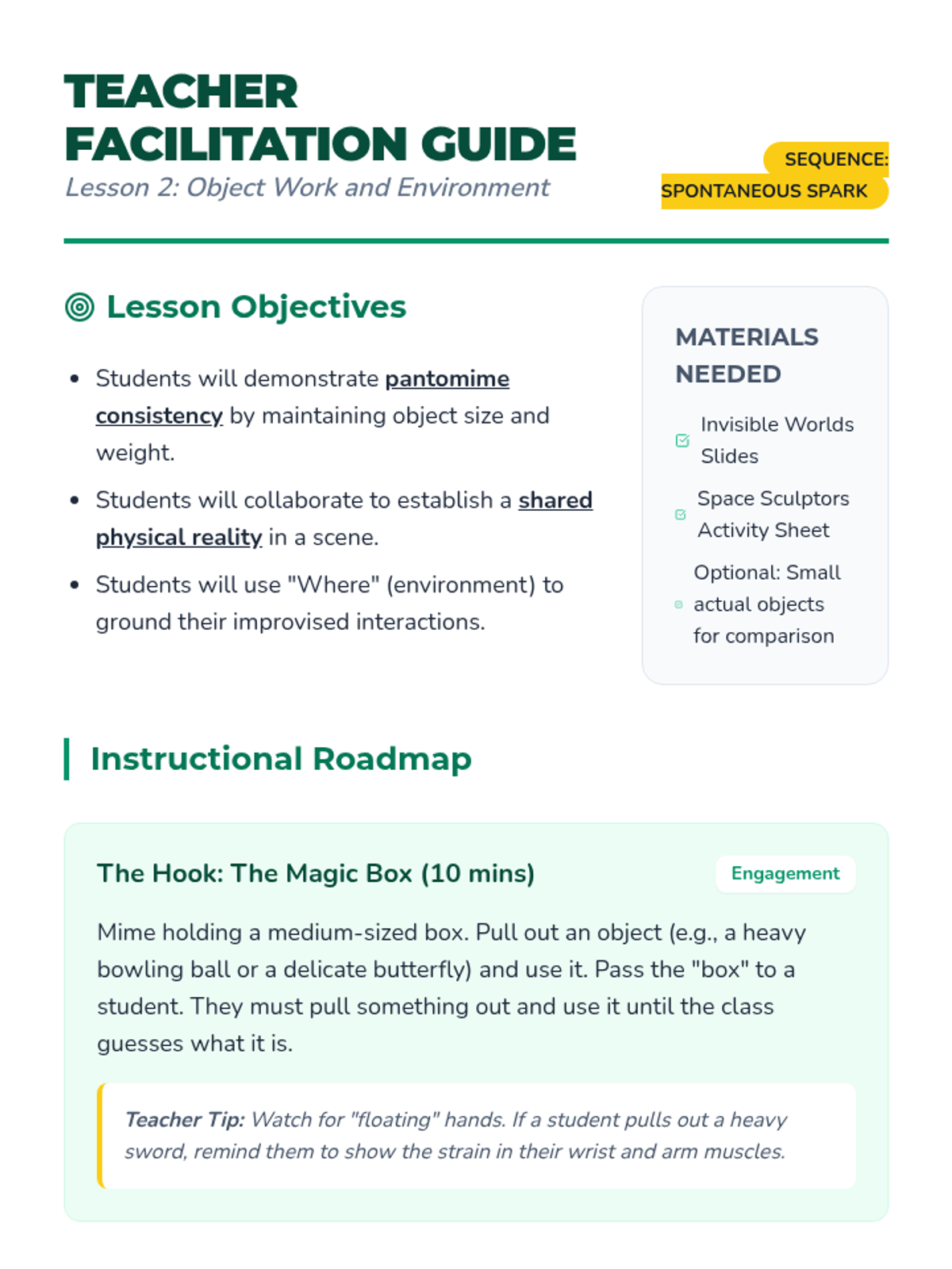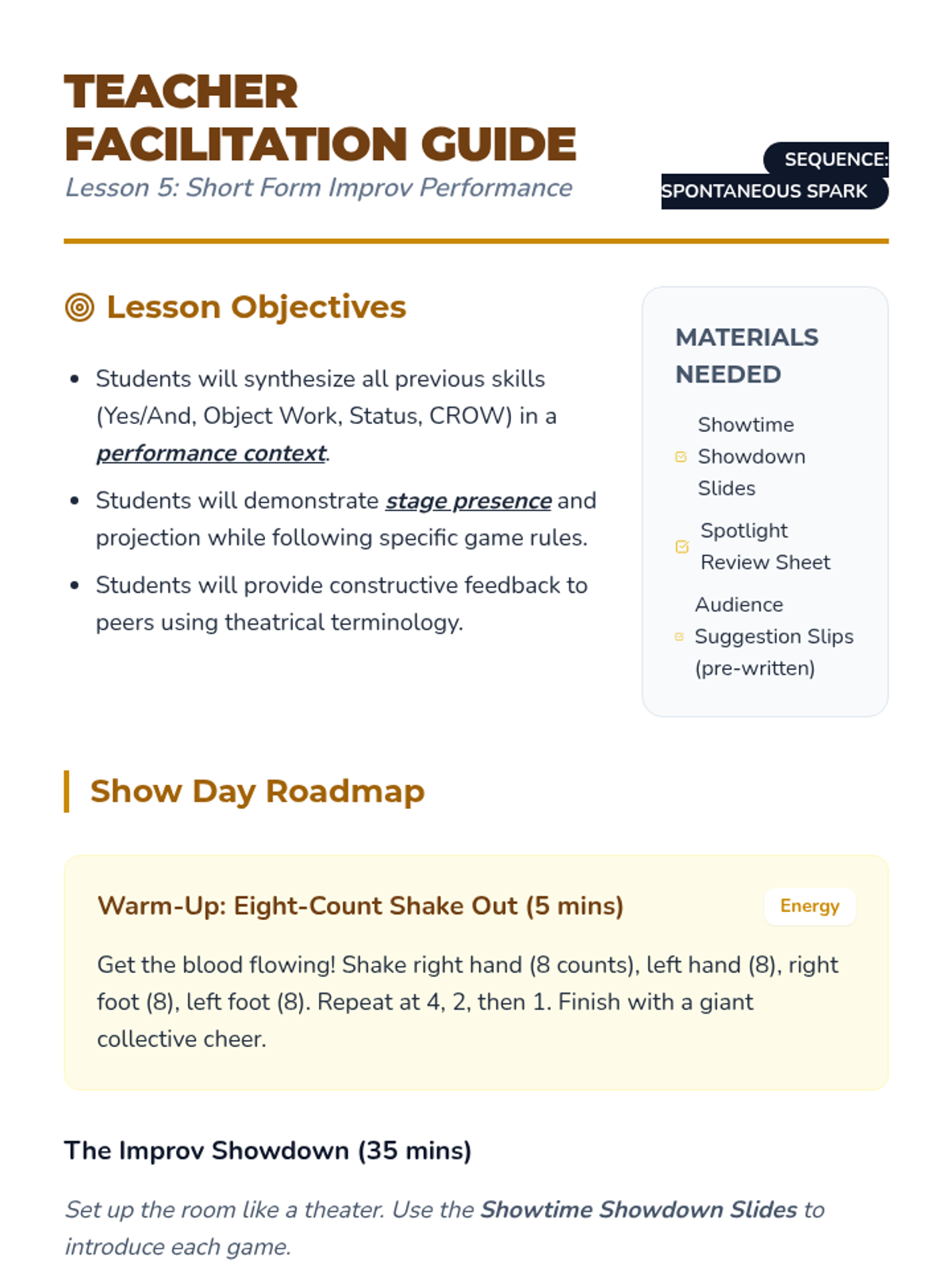 A 5-lesson sequence for 6th graders focused on the core skills of improvisation, including acceptance, object work, character dynamics, and narrative structure. Students develop collaborative creativity through the 'Yes, And' philosophy.