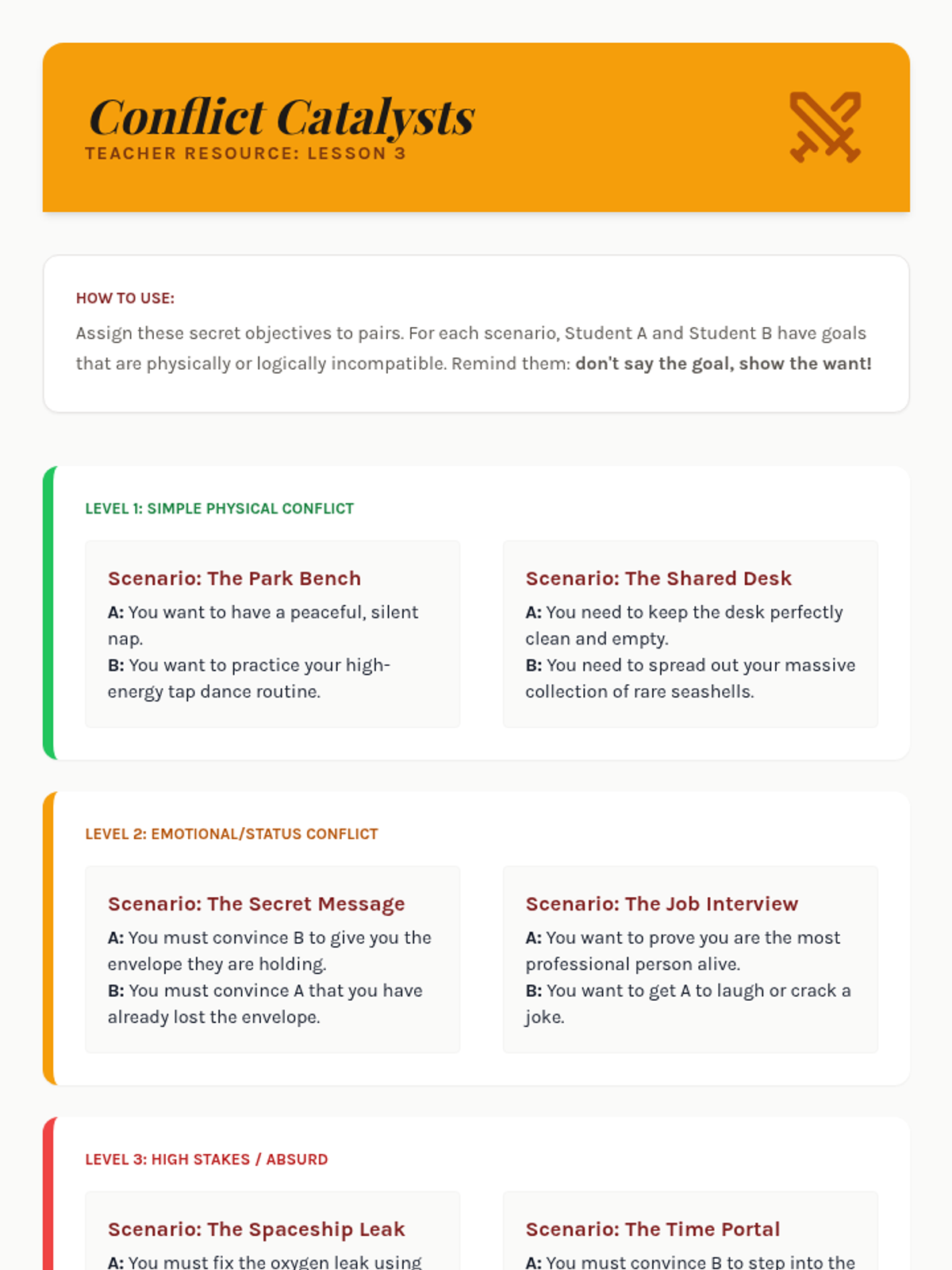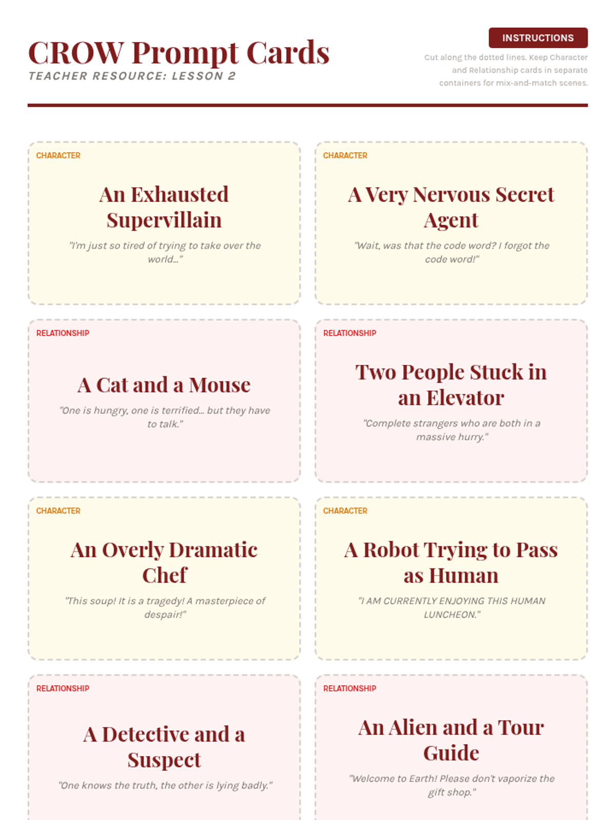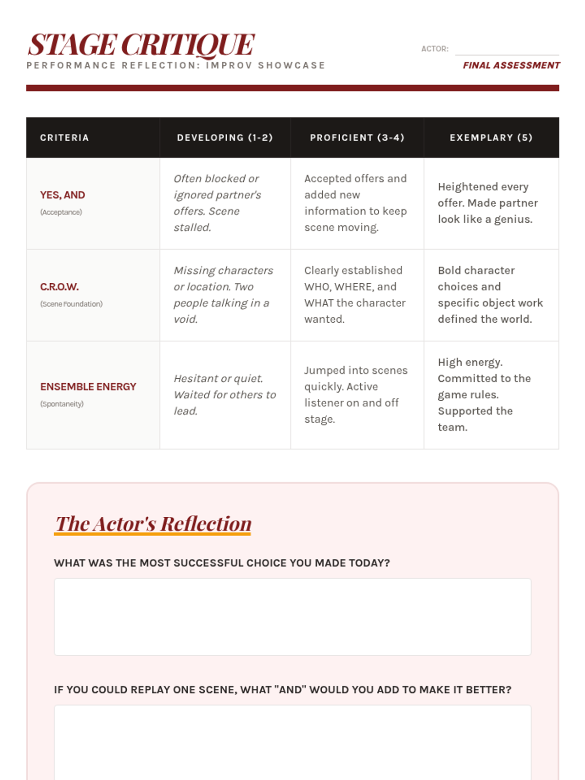 A comprehensive 7th-grade theater sequence focusing on the fundamentals of improvisation. Students progress from basic acceptance ('Yes, And') to complex scene construction using the CROW method (Character, Relationship, Objective, Where), culminating in a short-form performance showcase.