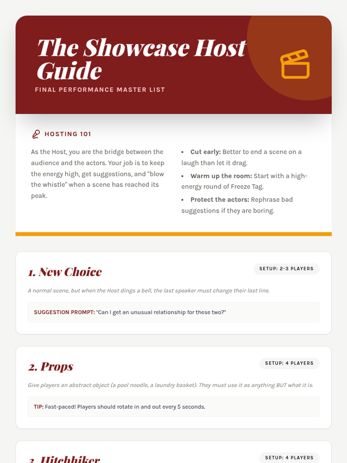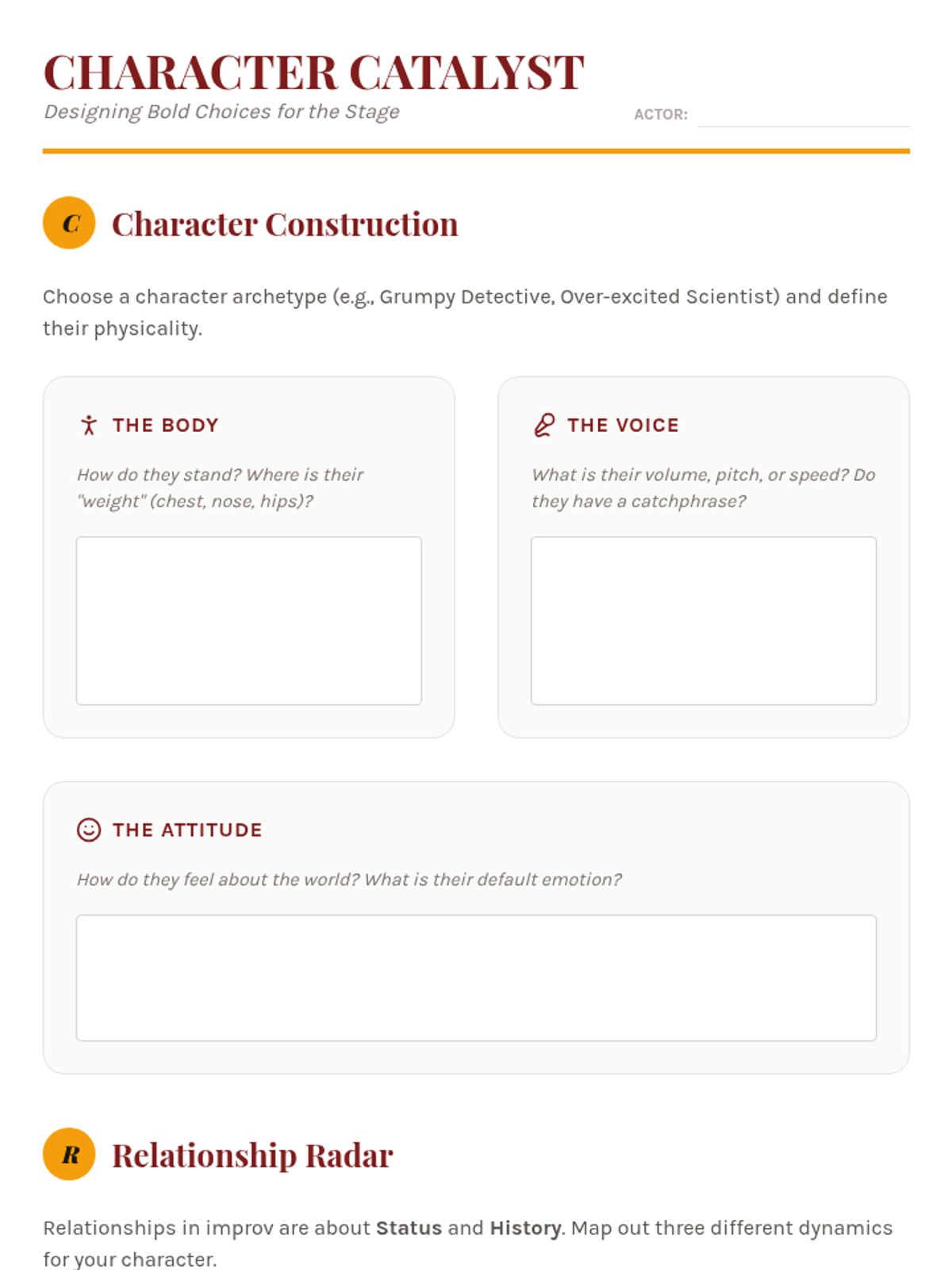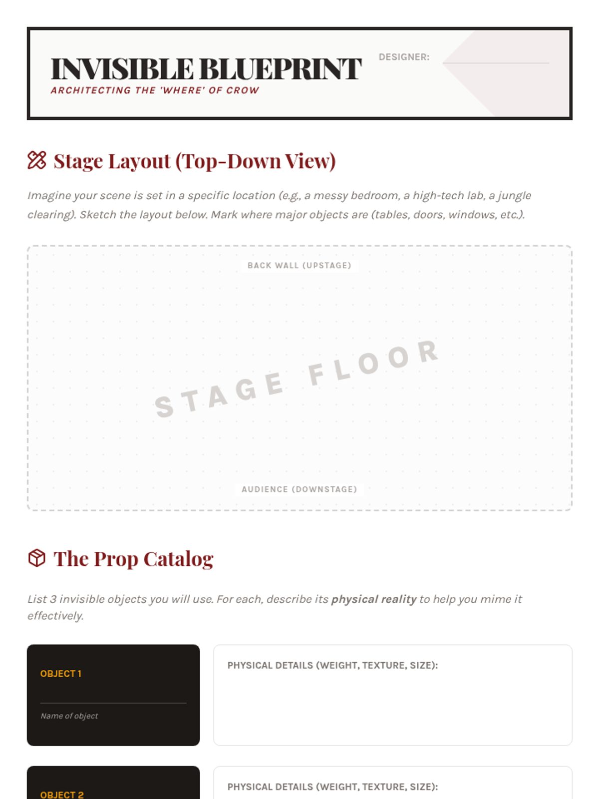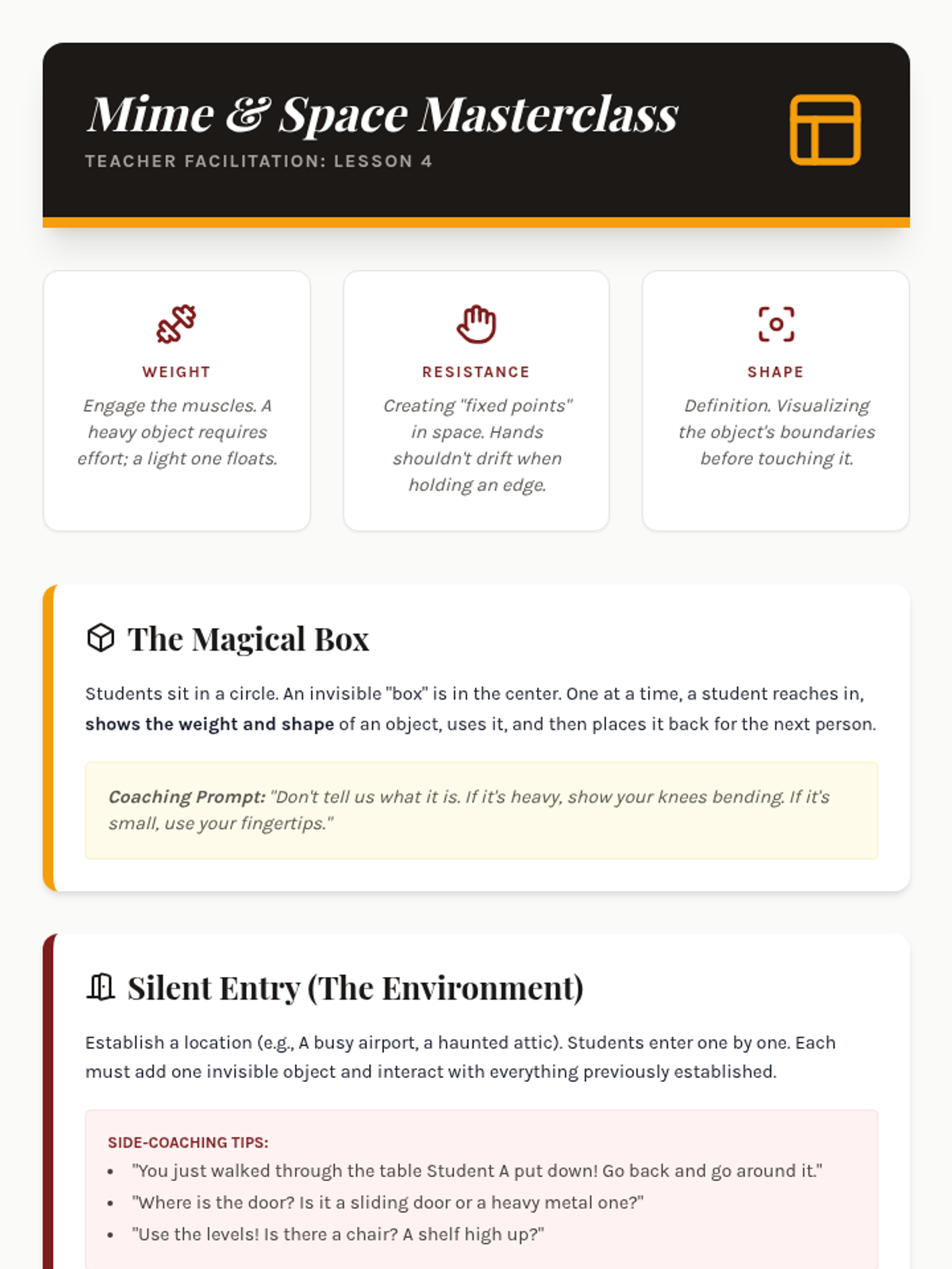 A comprehensive 7th-grade theater sequence focusing on the fundamentals of improvisation. Students progress from basic acceptance ('Yes, And') to complex scene construction using the CROW method (Character, Relationship, Objective, Where), culminating in a short-form performance showcase.