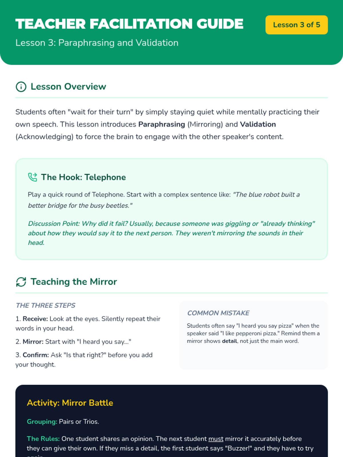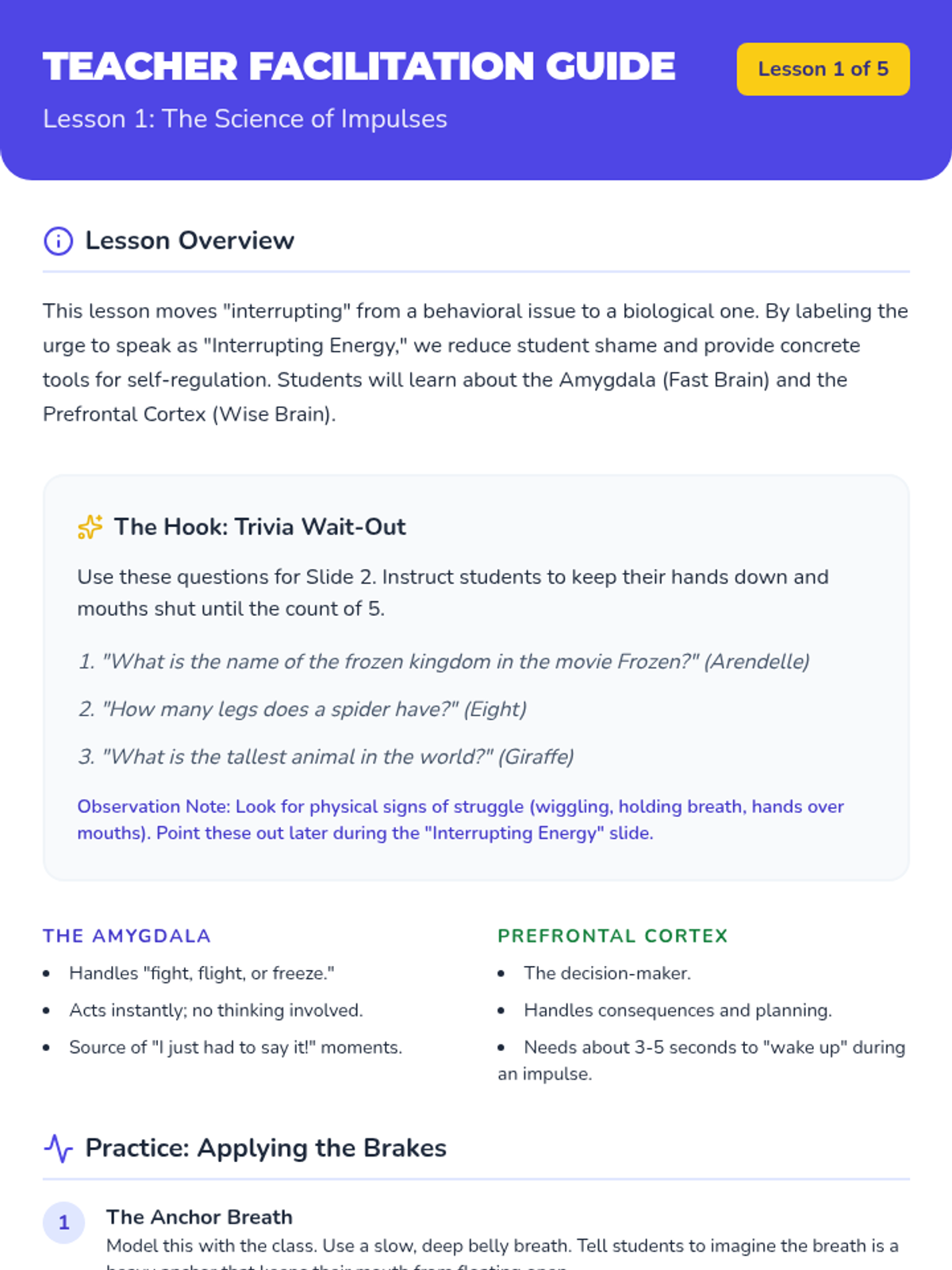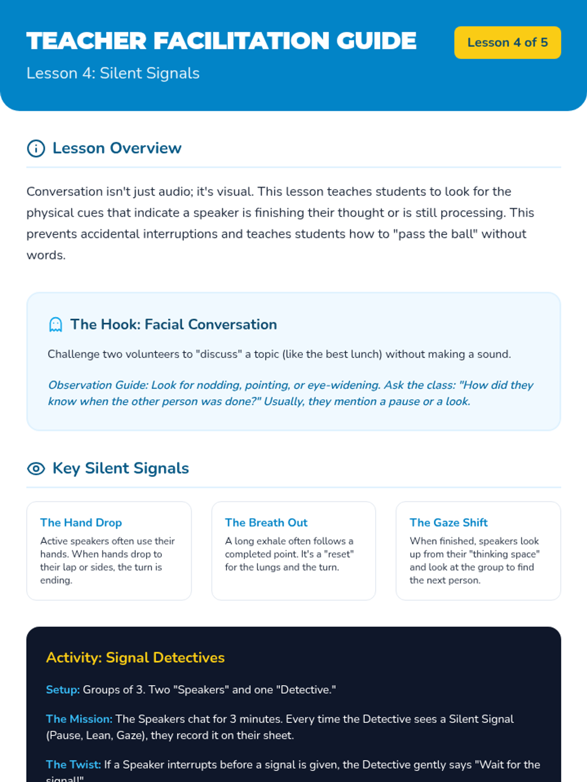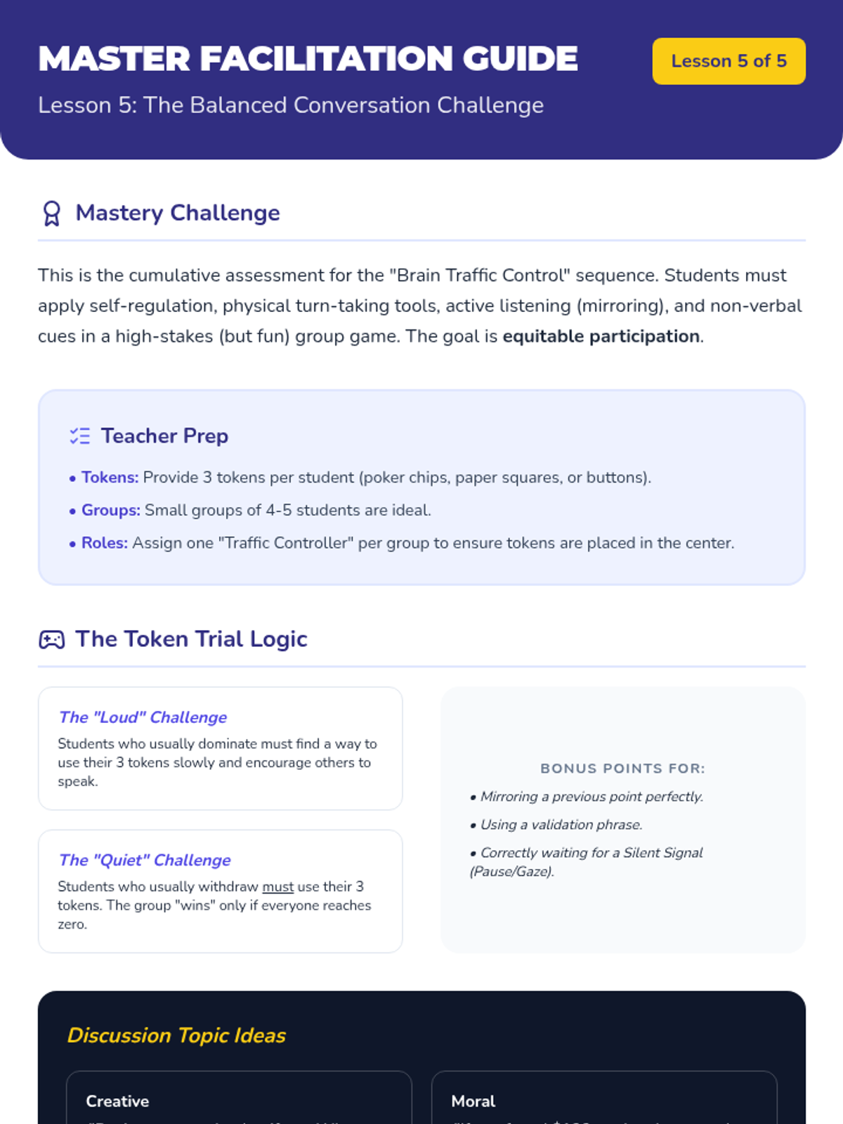 A 5-lesson sequence for 4th-grade students focusing on impulse control, active listening, and equitable participation in group settings. Students transition from understanding brain science to practicing sophisticated conversational turn-taking techniques.