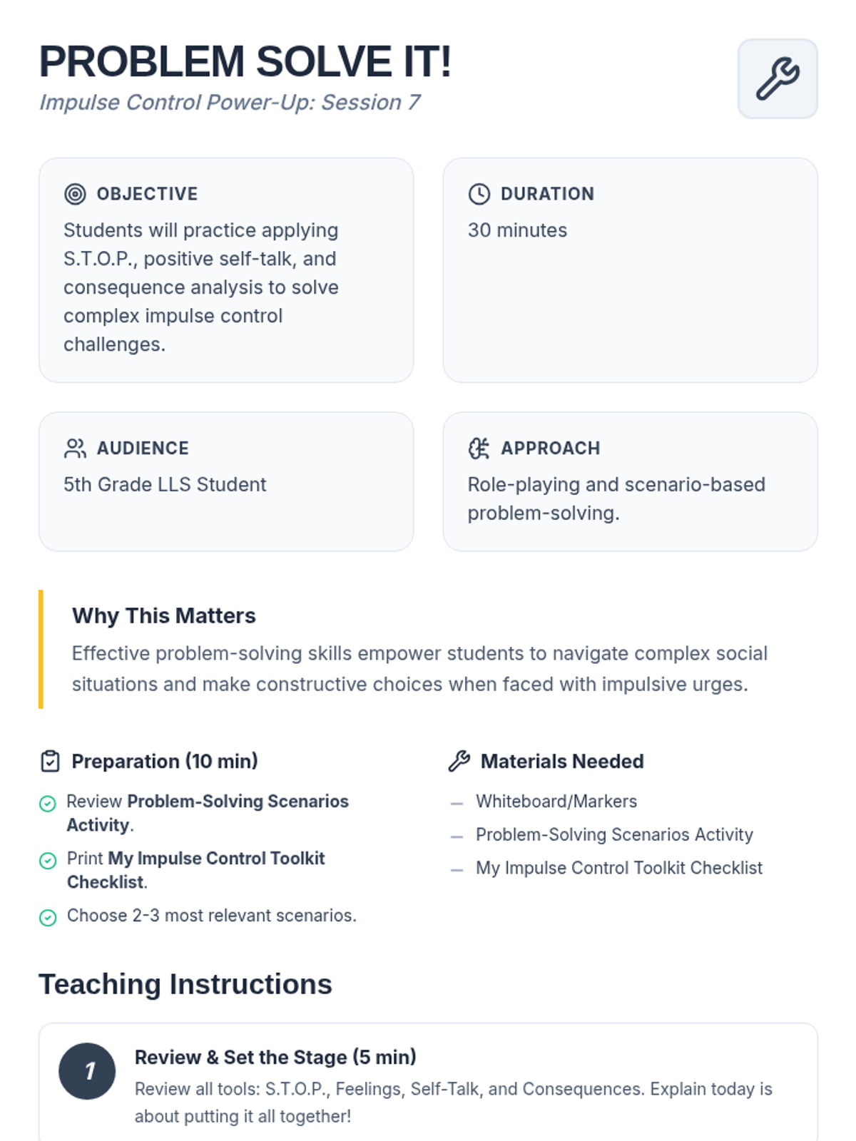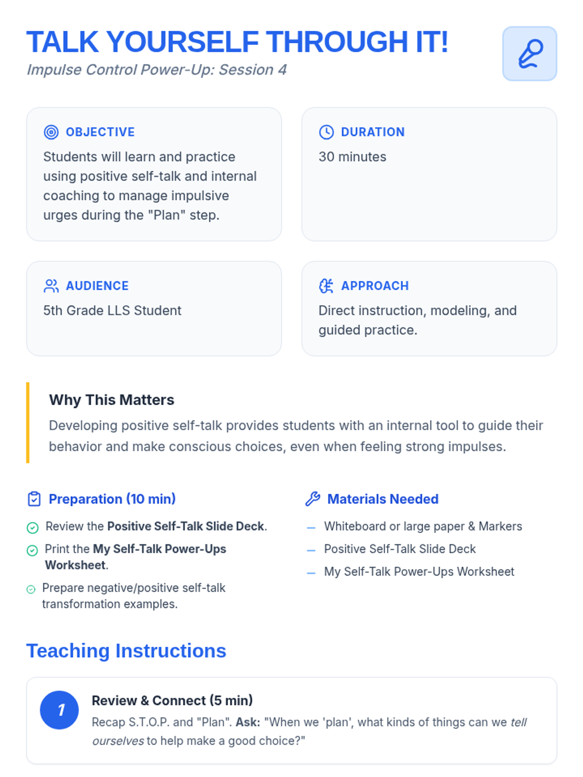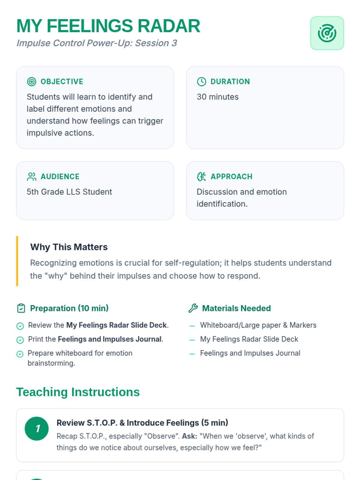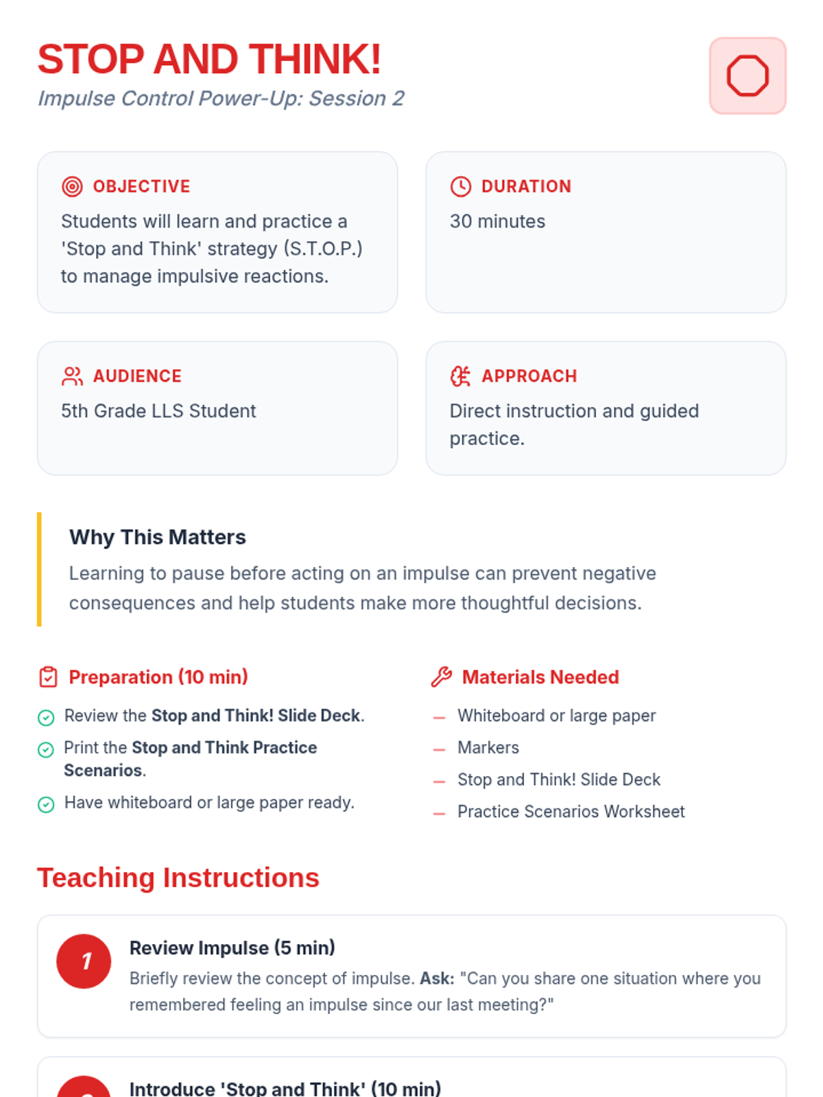 An 8-session Tier 3 intervention unit for 5th-grade students to develop impulse control and self-regulation skills through the S.T.O.P. strategy, identifying feelings, and positive self-talk.