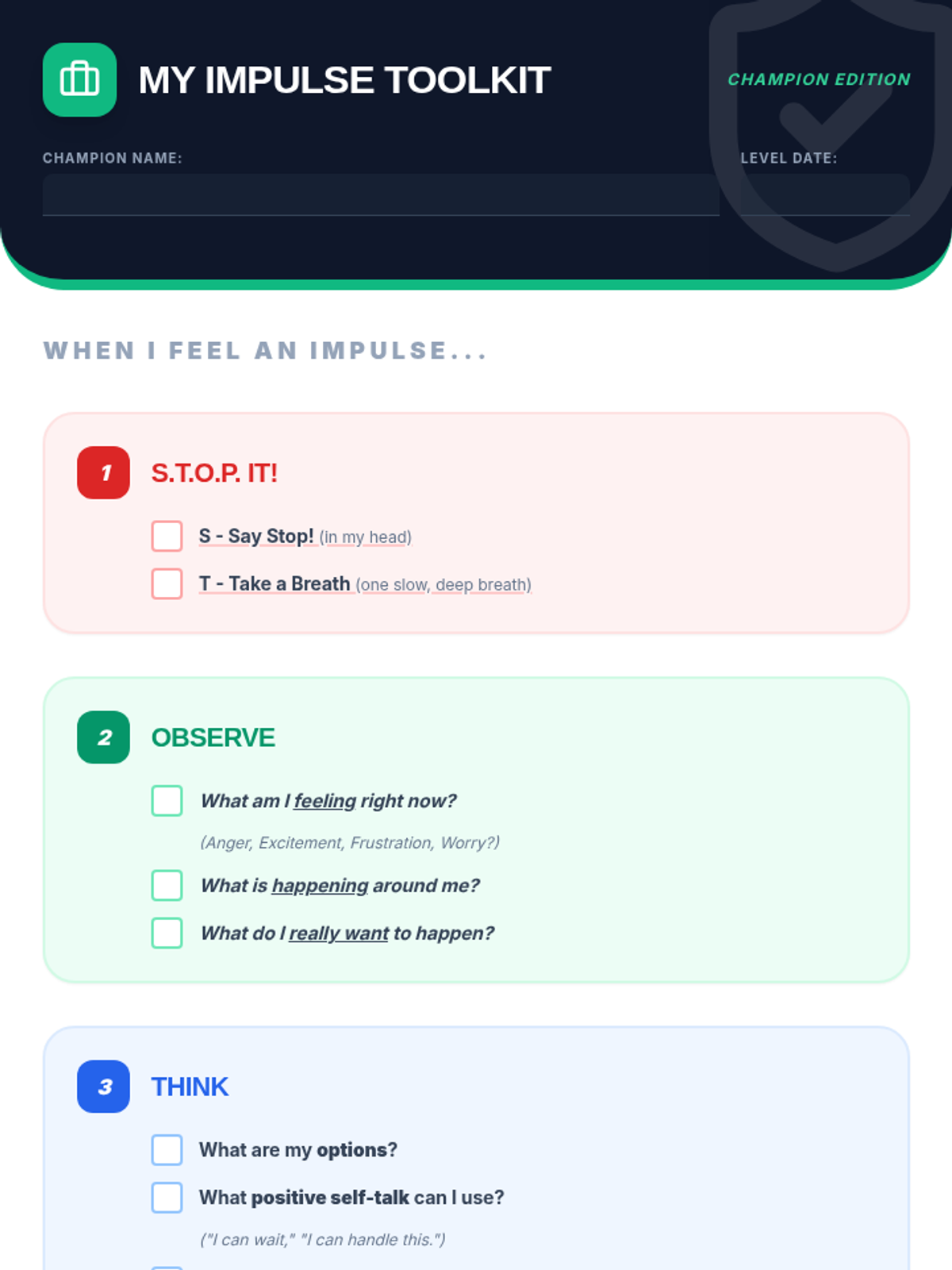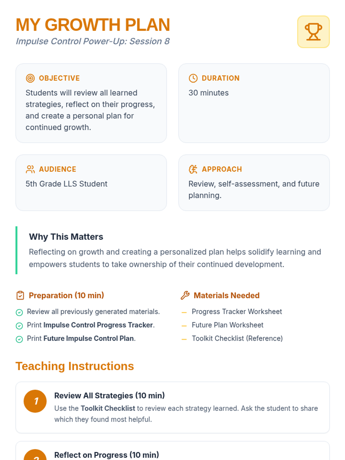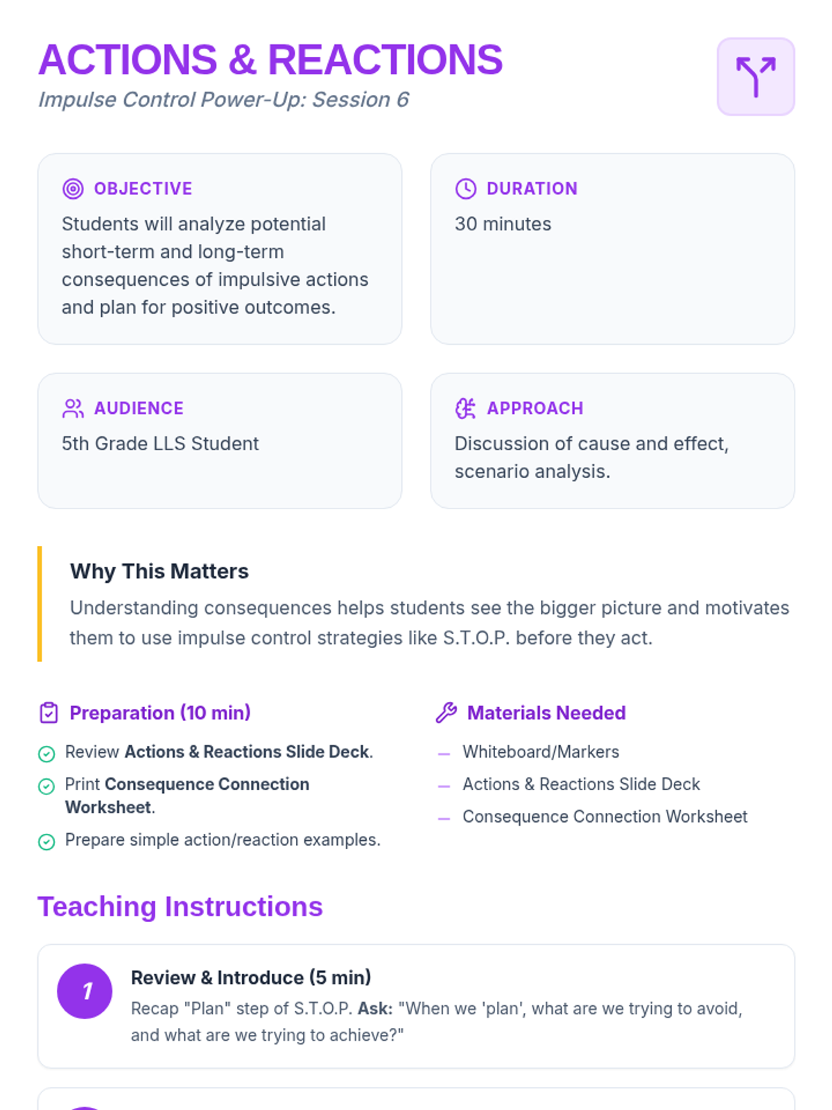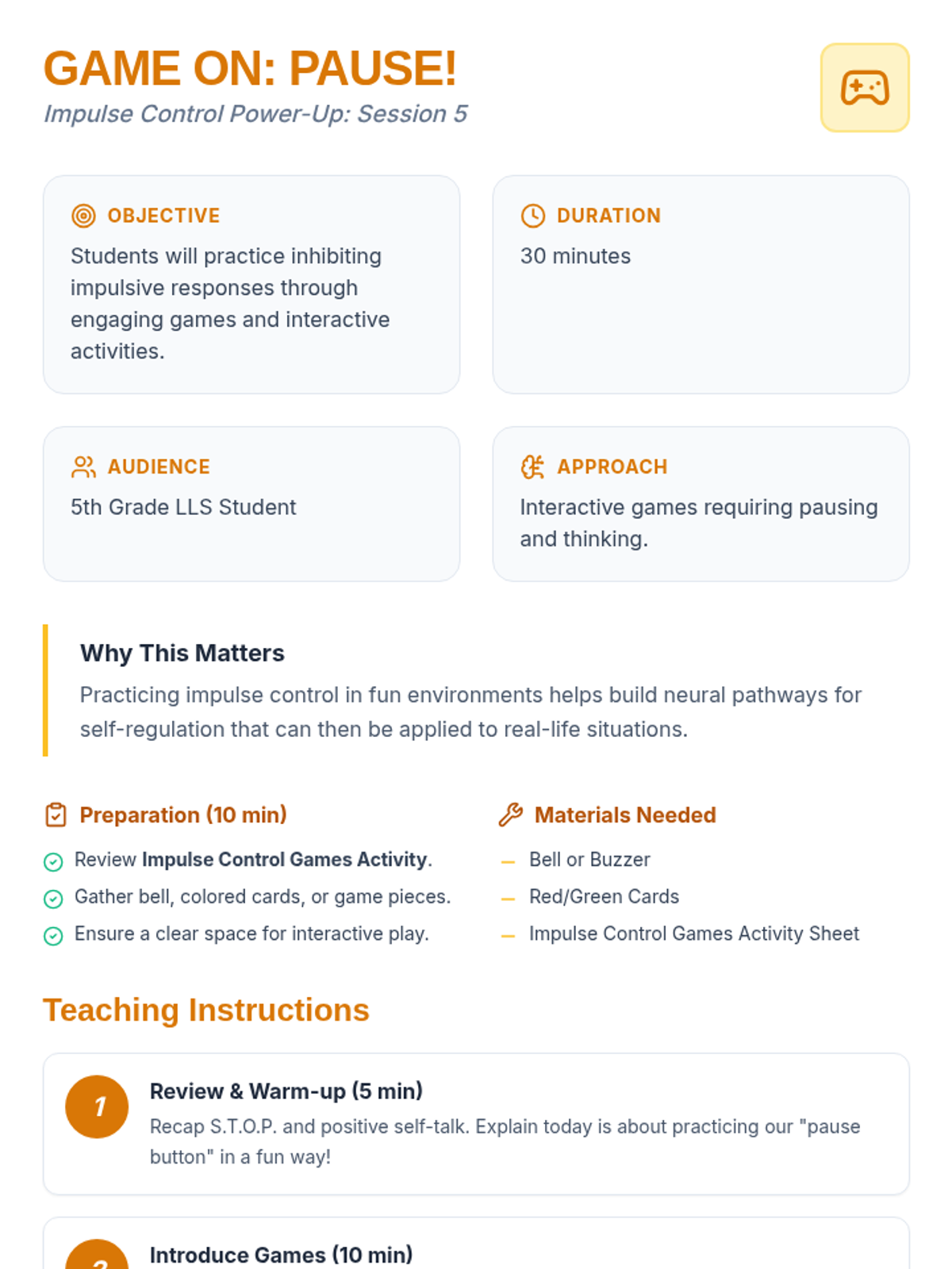 An 8-session Tier 3 intervention unit for 5th-grade students to develop impulse control and self-regulation skills through the S.T.O.P. strategy, identifying feelings, and positive self-talk.