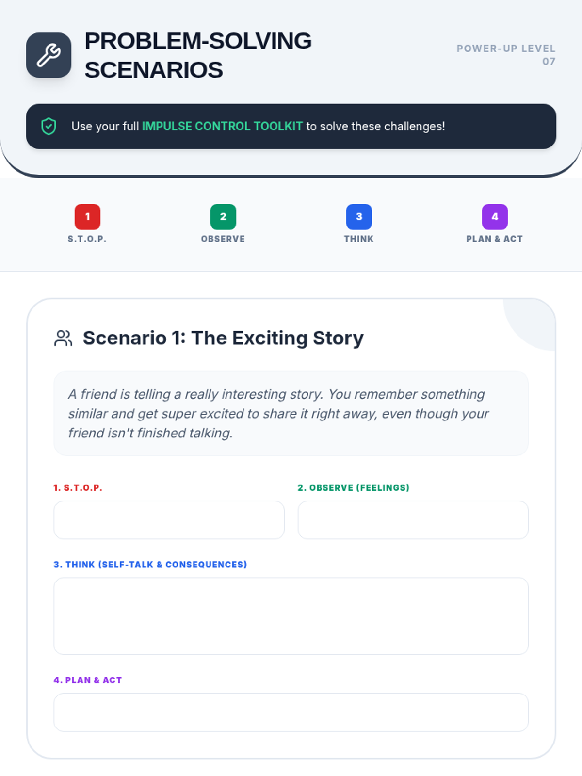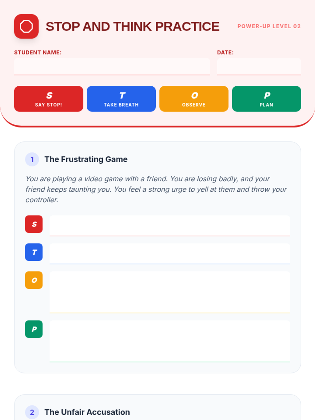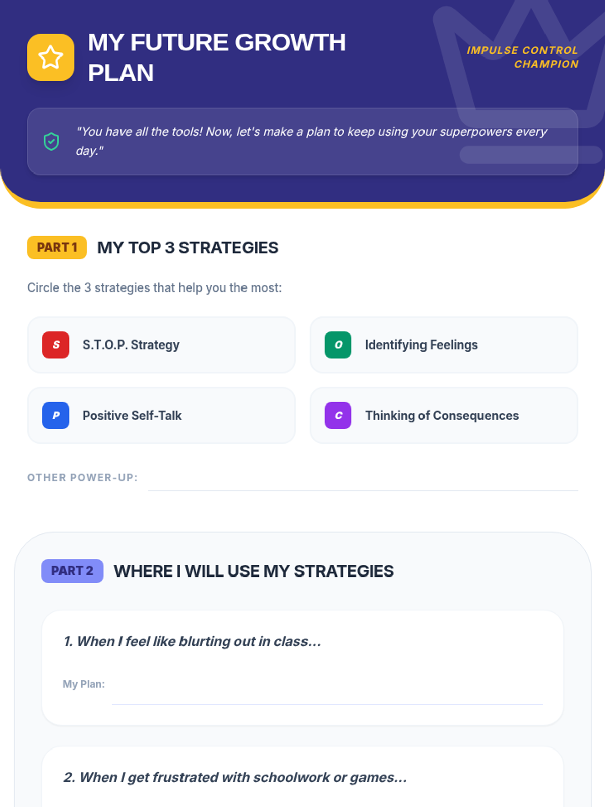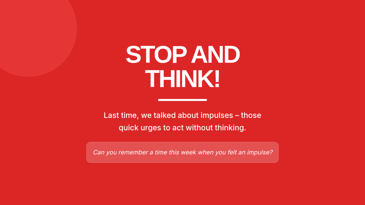 An 8-session Tier 3 intervention unit for 5th-grade students to develop impulse control and self-regulation skills through the S.T.O.P. strategy, identifying feelings, and positive self-talk.