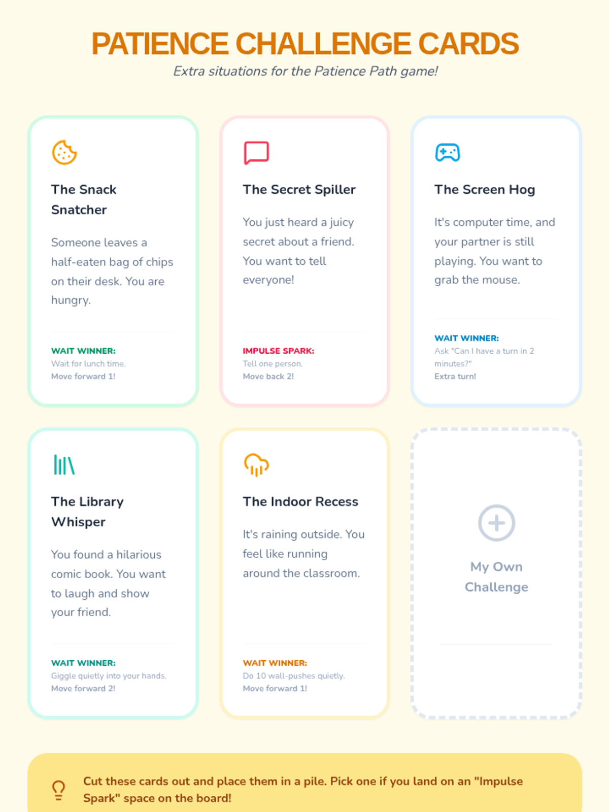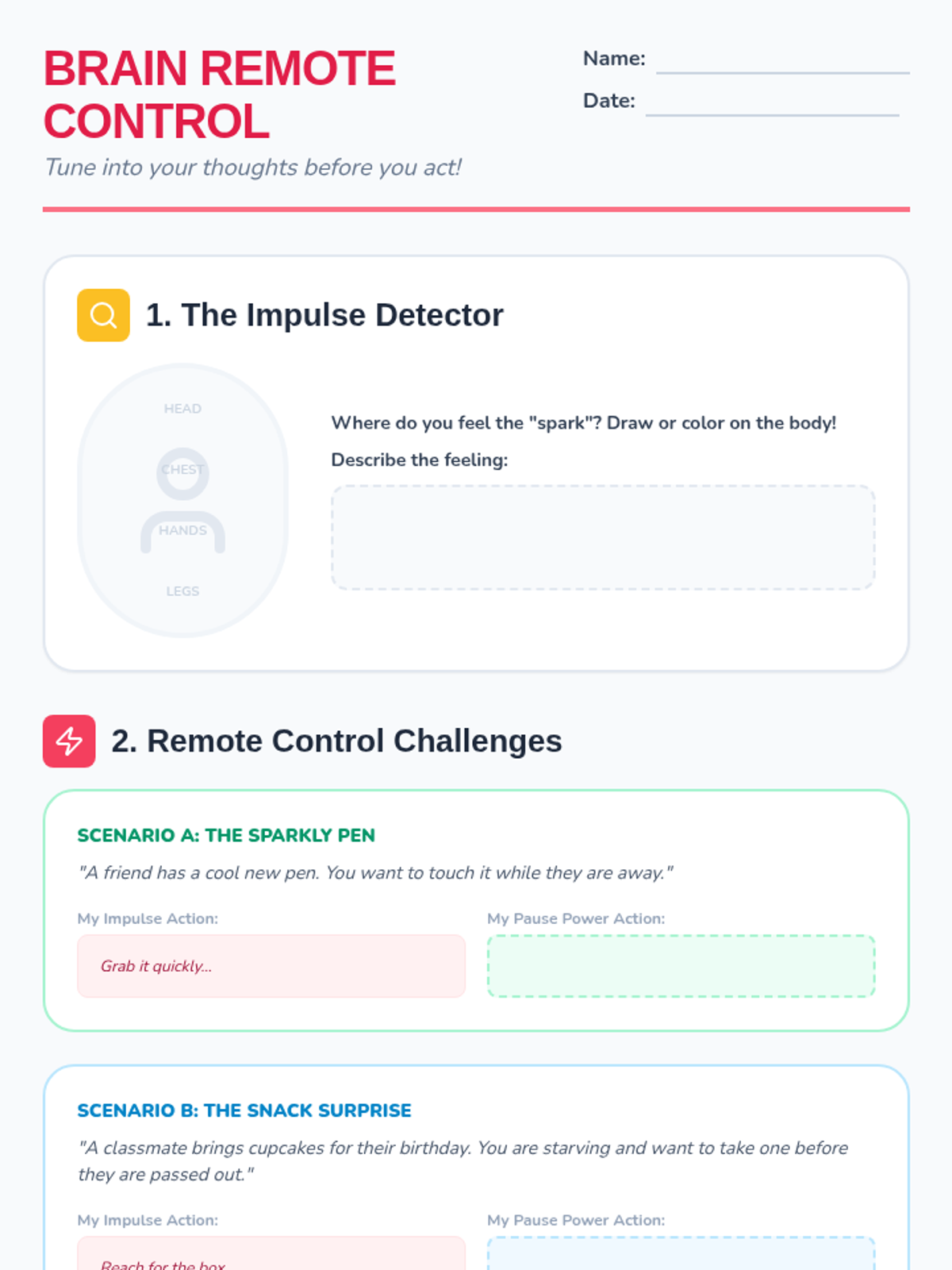 A multi-session social-emotional learning sequence designed for 4th-grade students to develop impulse control through visual storytelling, reflection, and interactive games. Students learn to 'pause' their impulses and choose better outcomes.