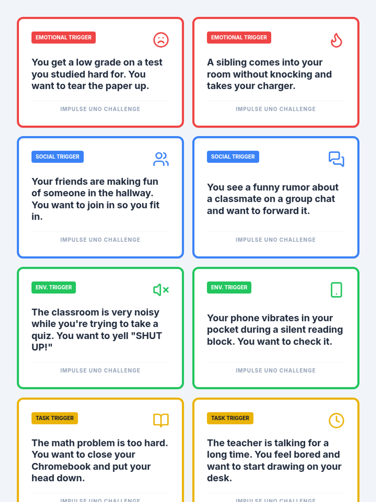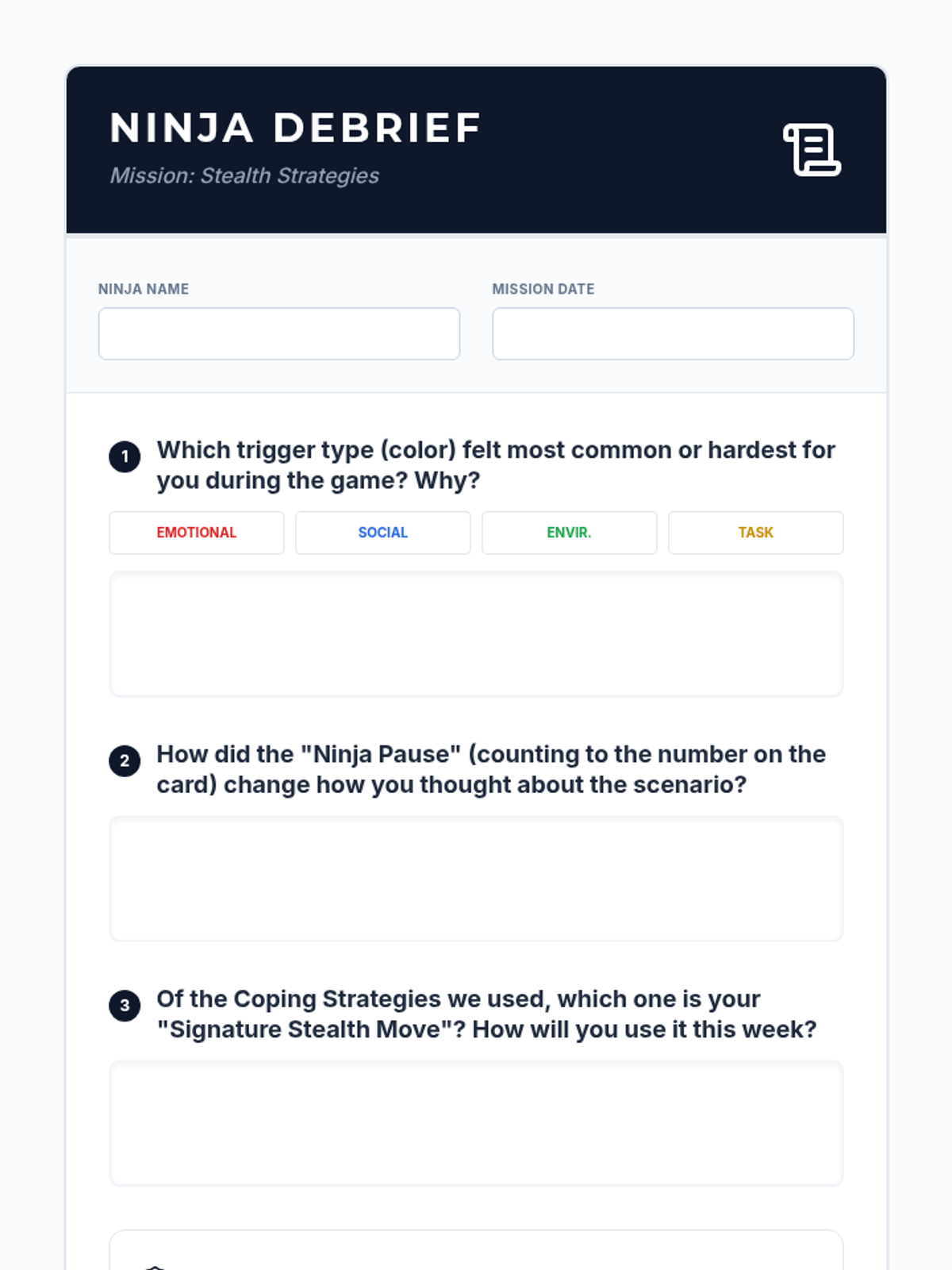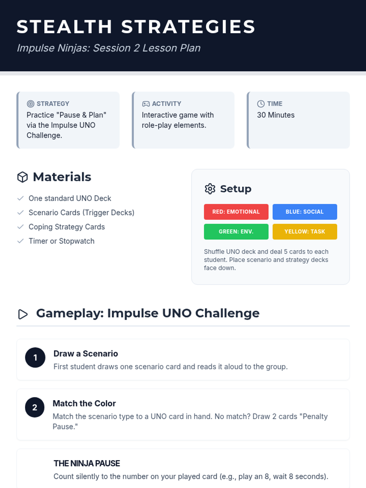 A two-session Tier 2 group intervention for 7th graders to understand ADHD-related impulsivity and master self-control strategies through a 'Ninja' thematic lens. Students move from awareness of their 'inner impulses' to practicing 'stealth strategies' using an interactive UNO-based game.