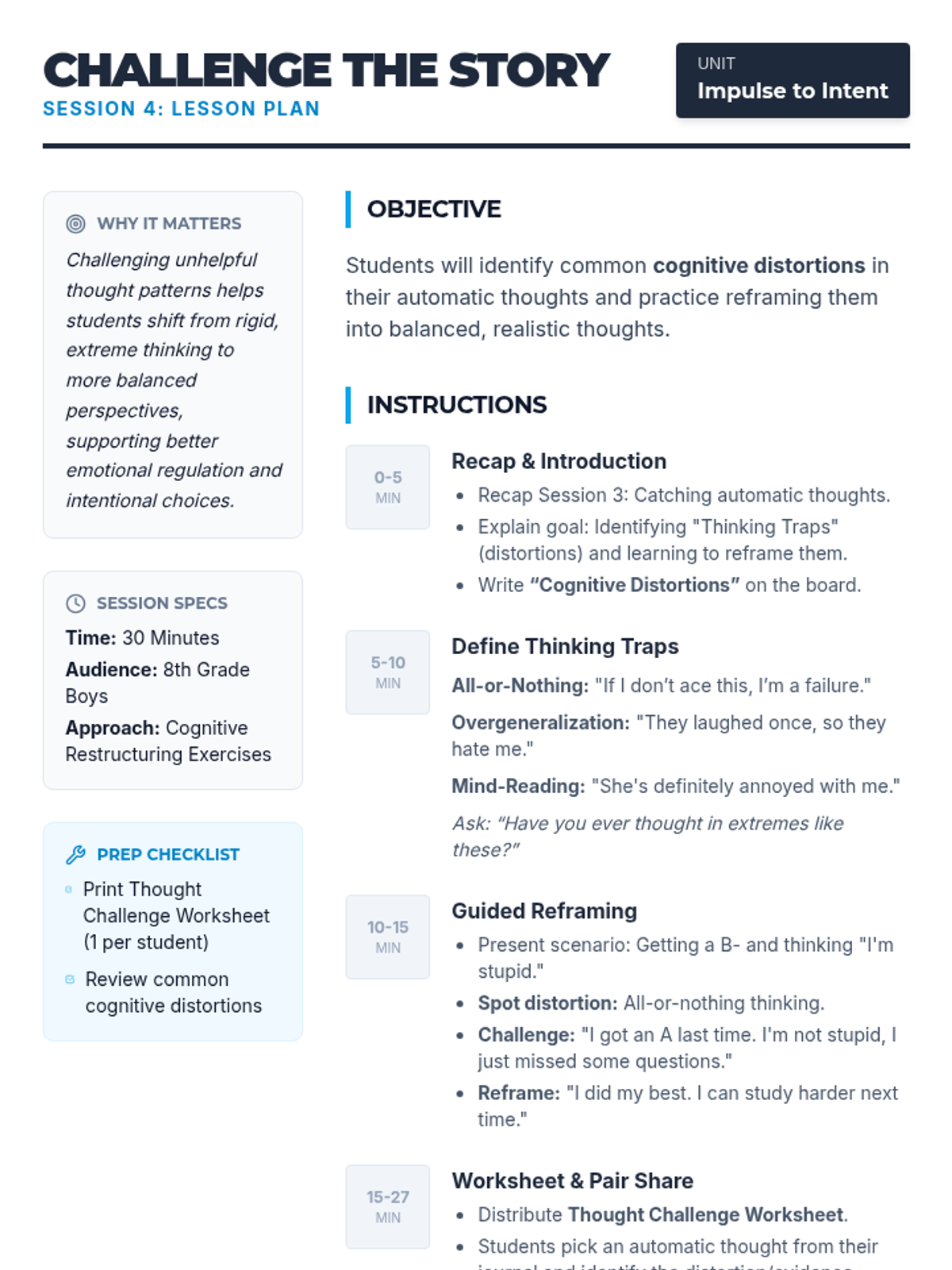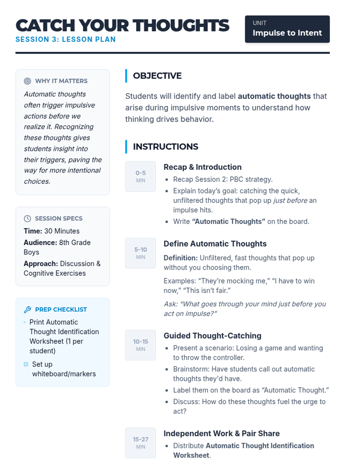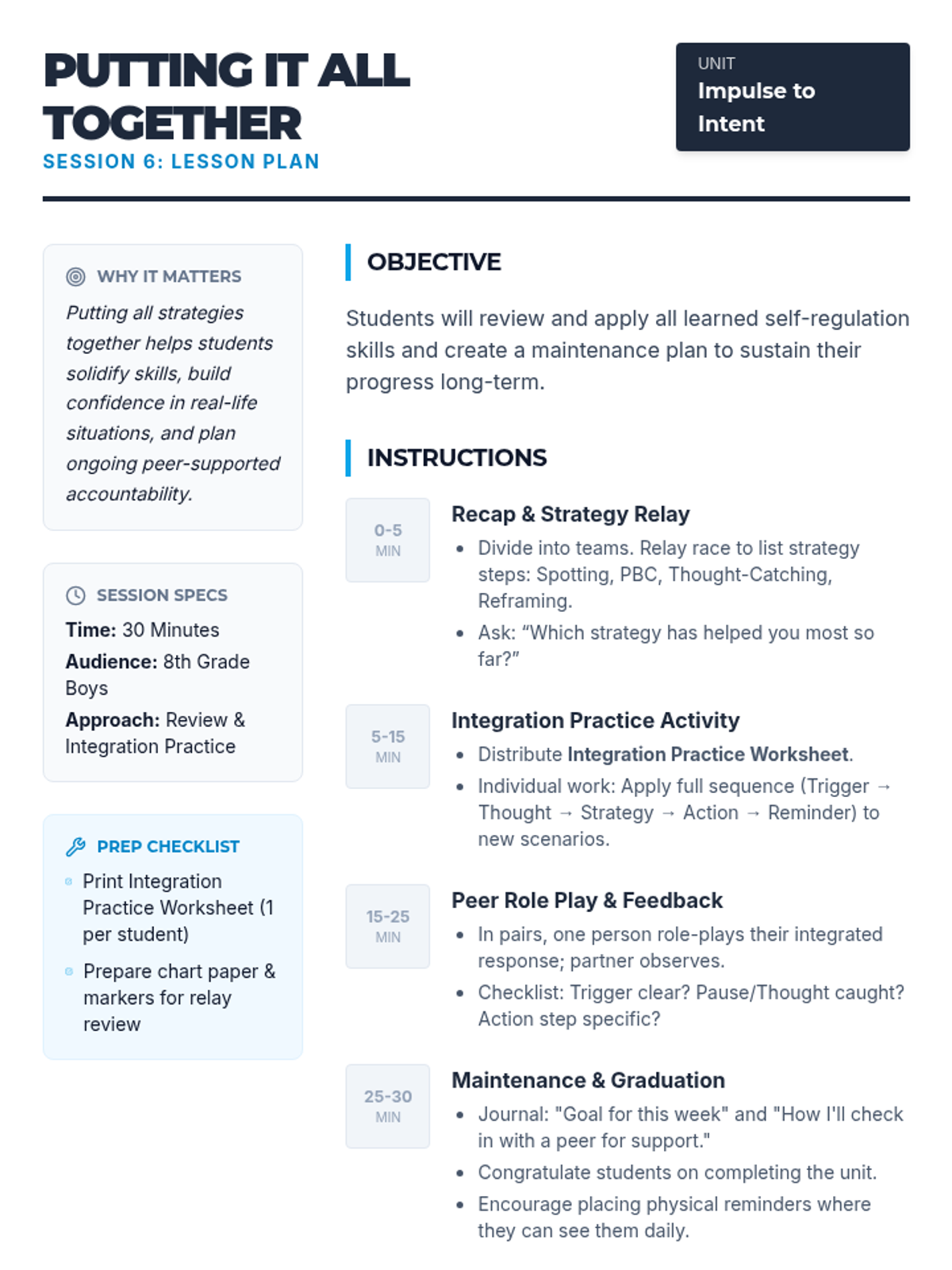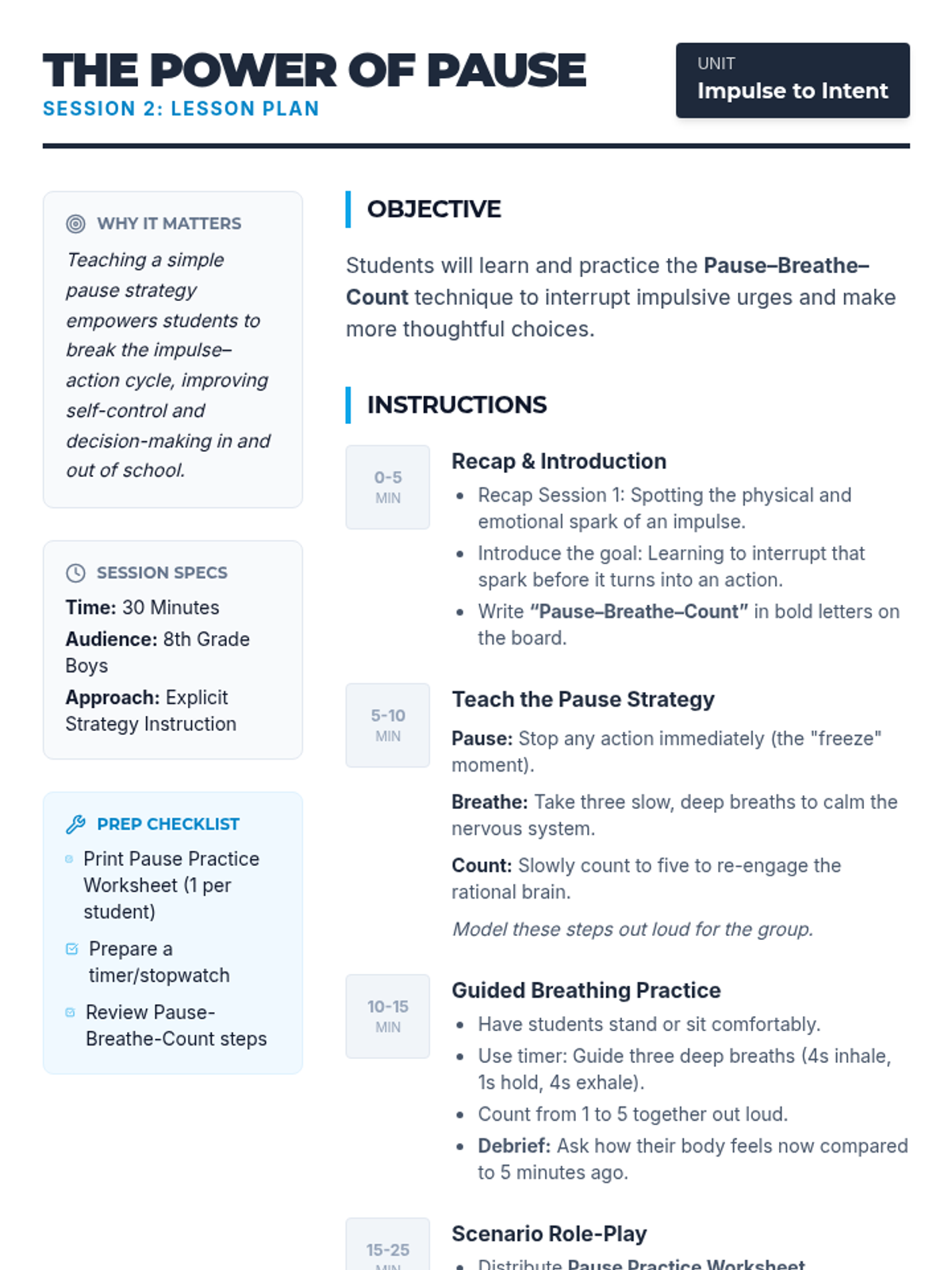 A 6-session small group unit for 8th grade boys focusing on impulsivity, emotional regulation, and intentional decision-making through cognitive-behavioral strategies.
