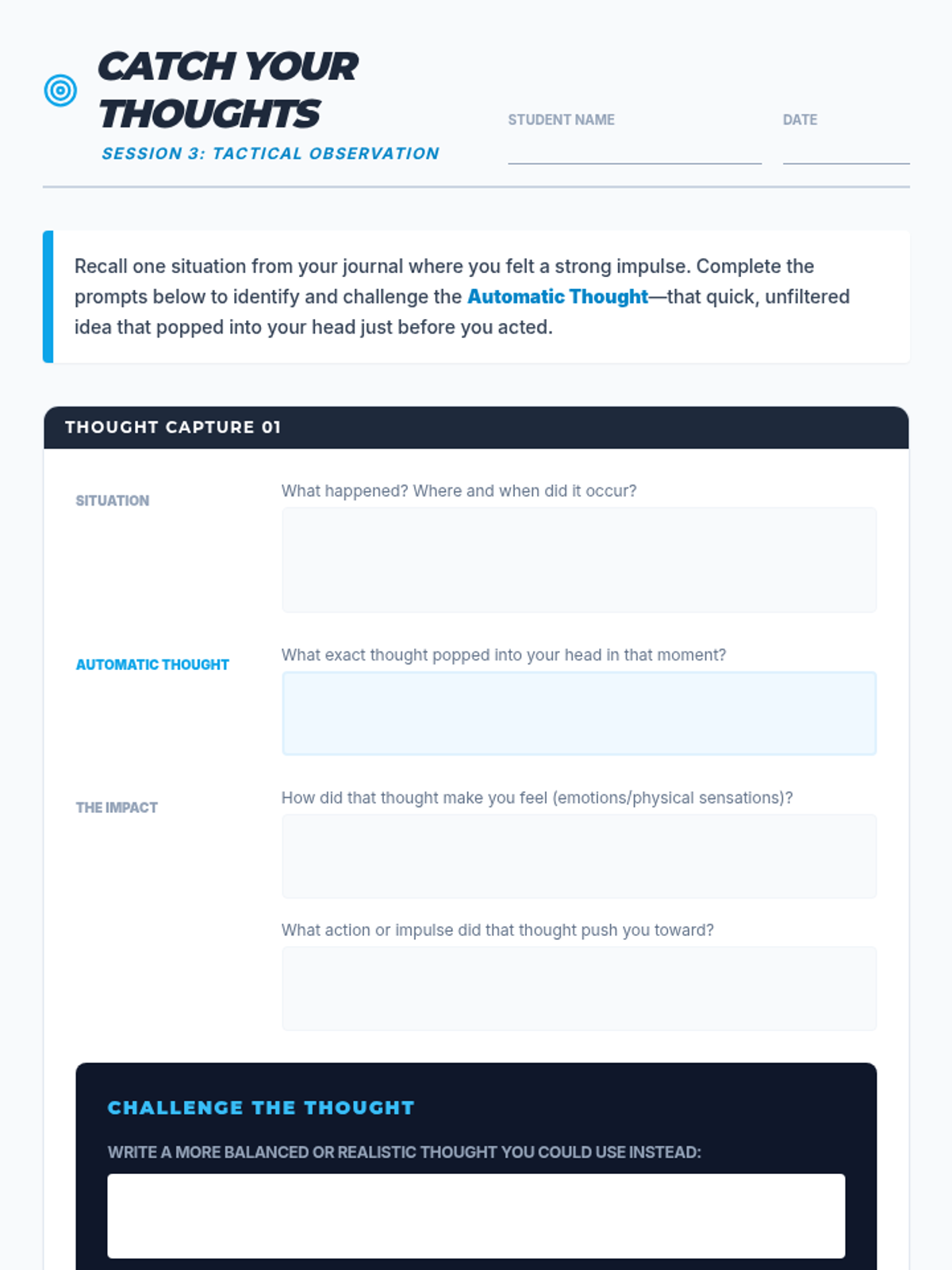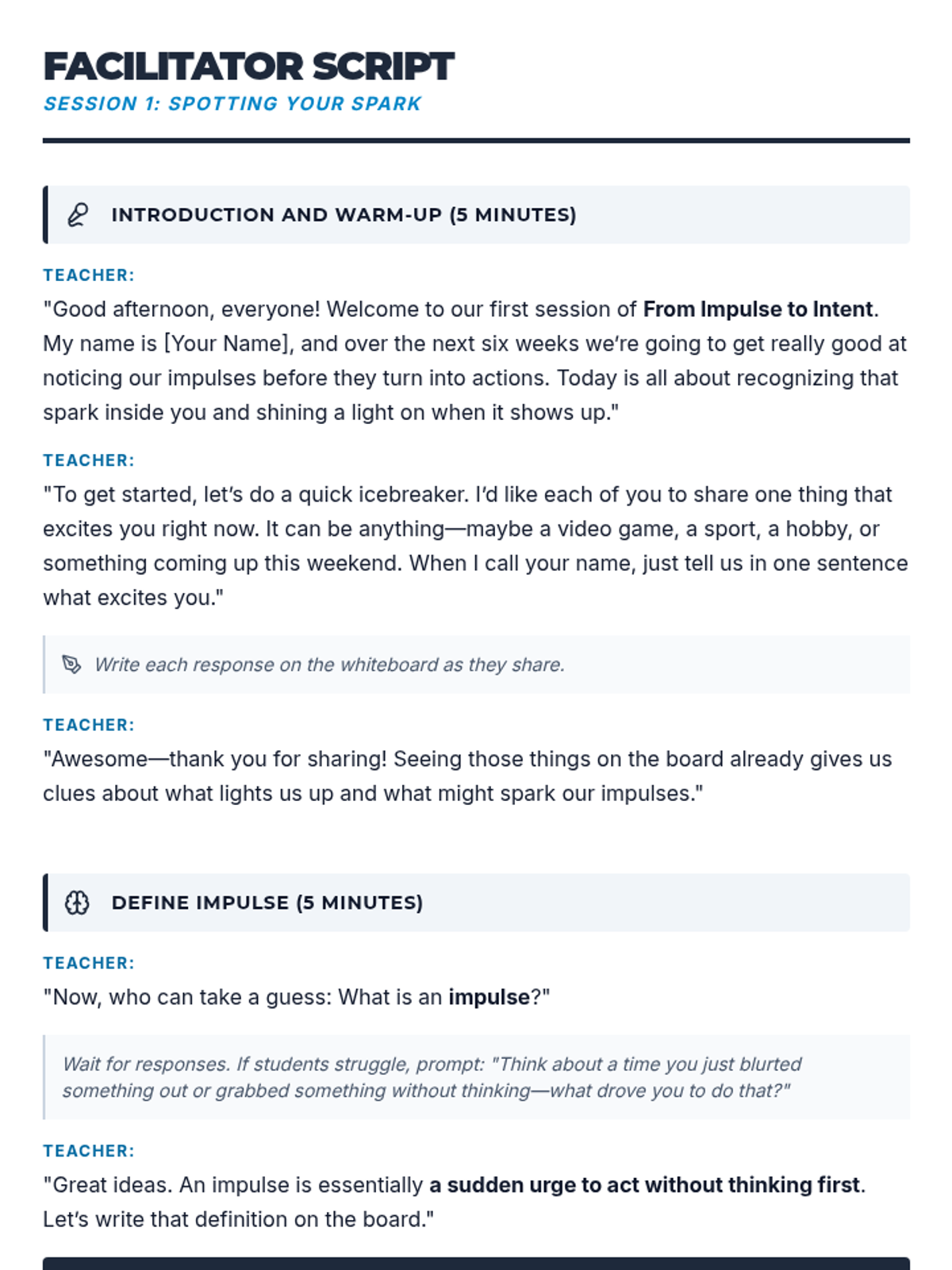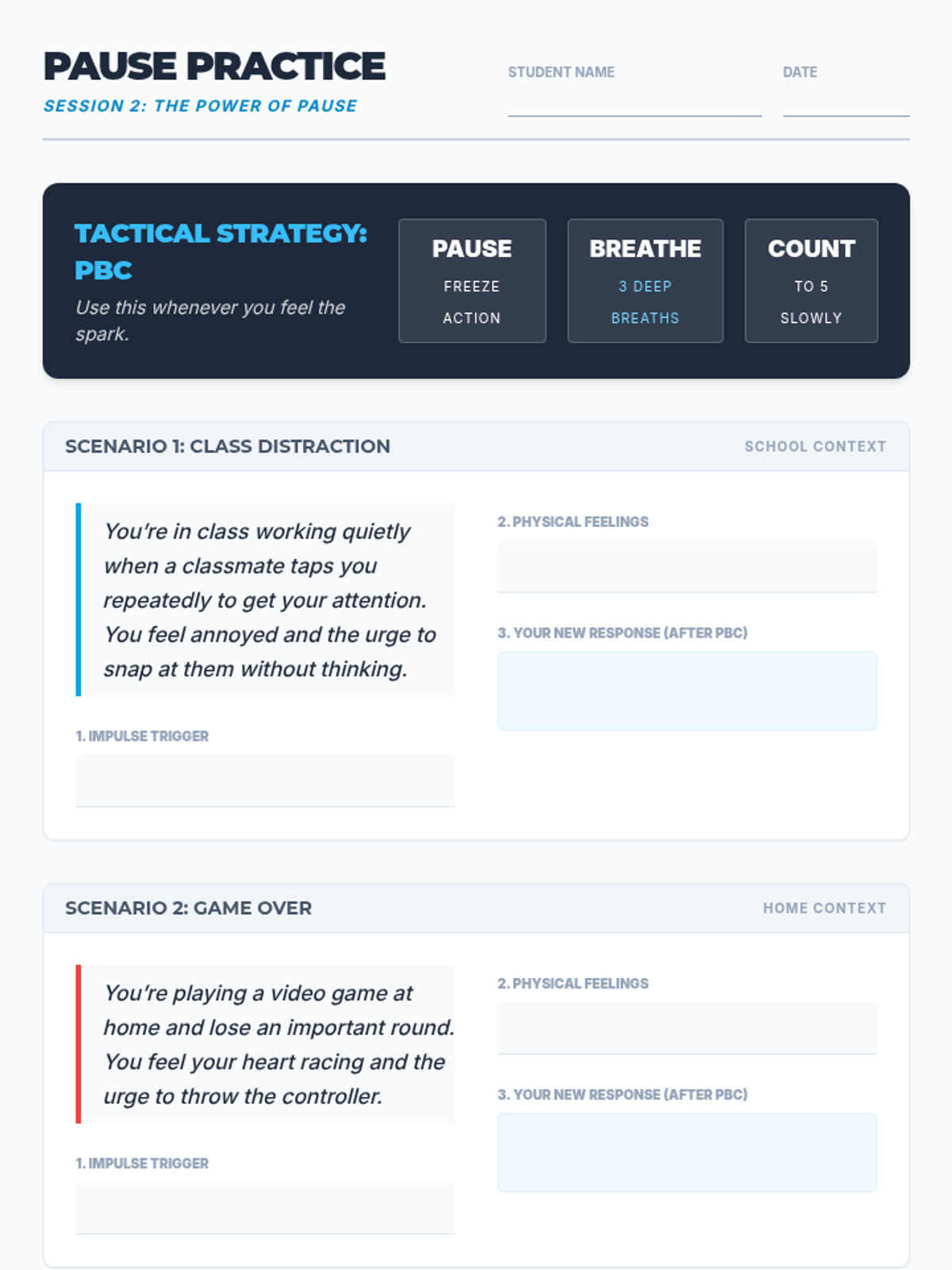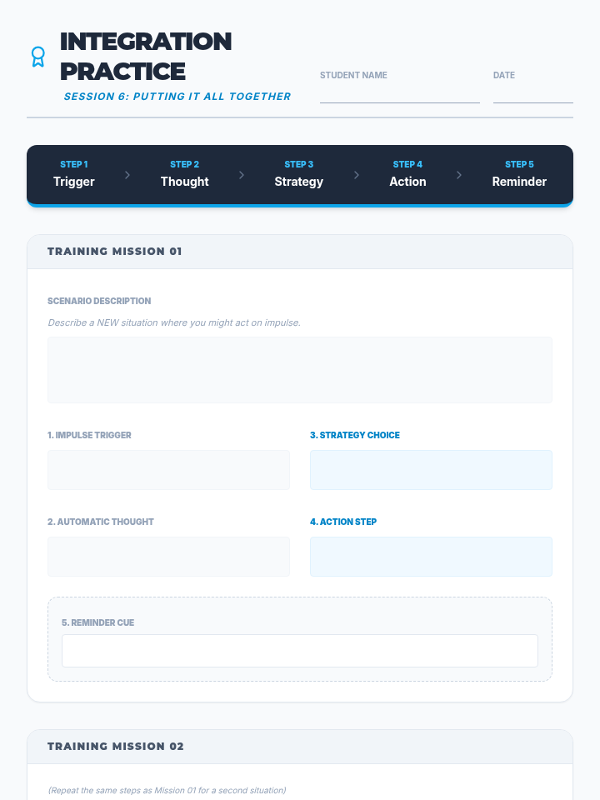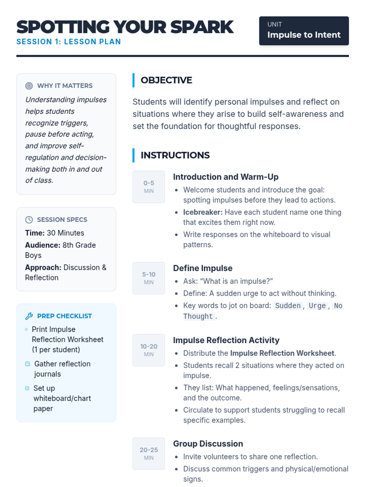 A 6-session small group unit for 8th grade boys focusing on impulsivity, emotional regulation, and intentional decision-making through cognitive-behavioral strategies.