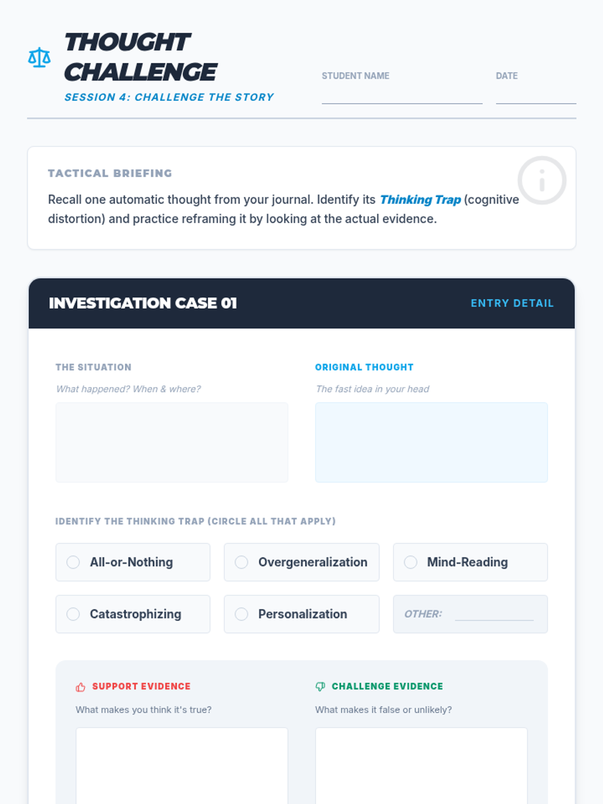 A comprehensive 6-week gamified counseling curriculum for middle schoolers. It uses a 'cyber-defense' theme to help students identify, challenge, and 'patch' cognitive distortions (brain glitches) through interactive games, scenario-based learning, and cognitive-behavioral techniques.