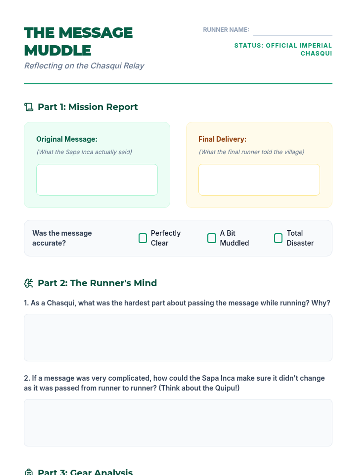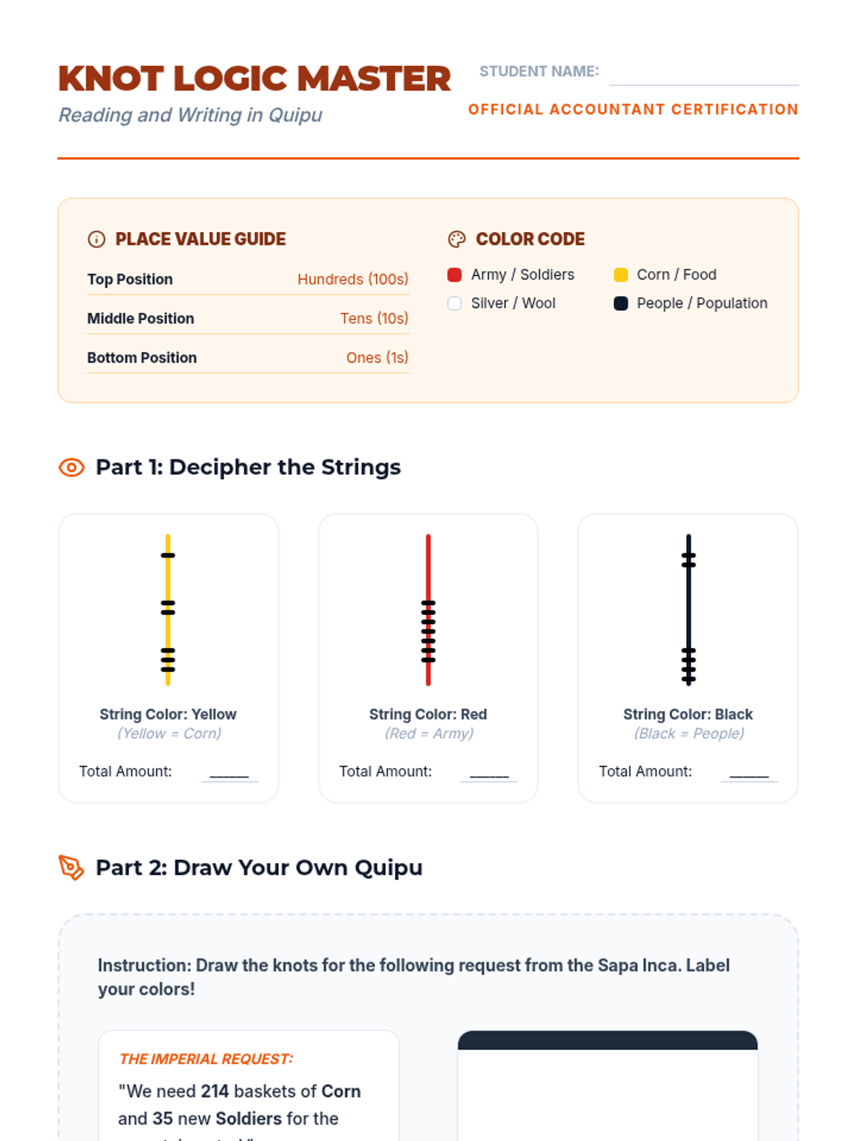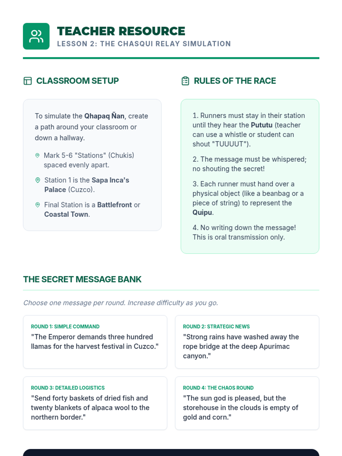 This sequence explores how the Inca Empire managed a vast mountain territory using the Qhapaq Ñan road system, Chasqui runners, and Quipu record-keeping. Students investigate geography, communication, and engineering through hands-on simulations and data analysis.