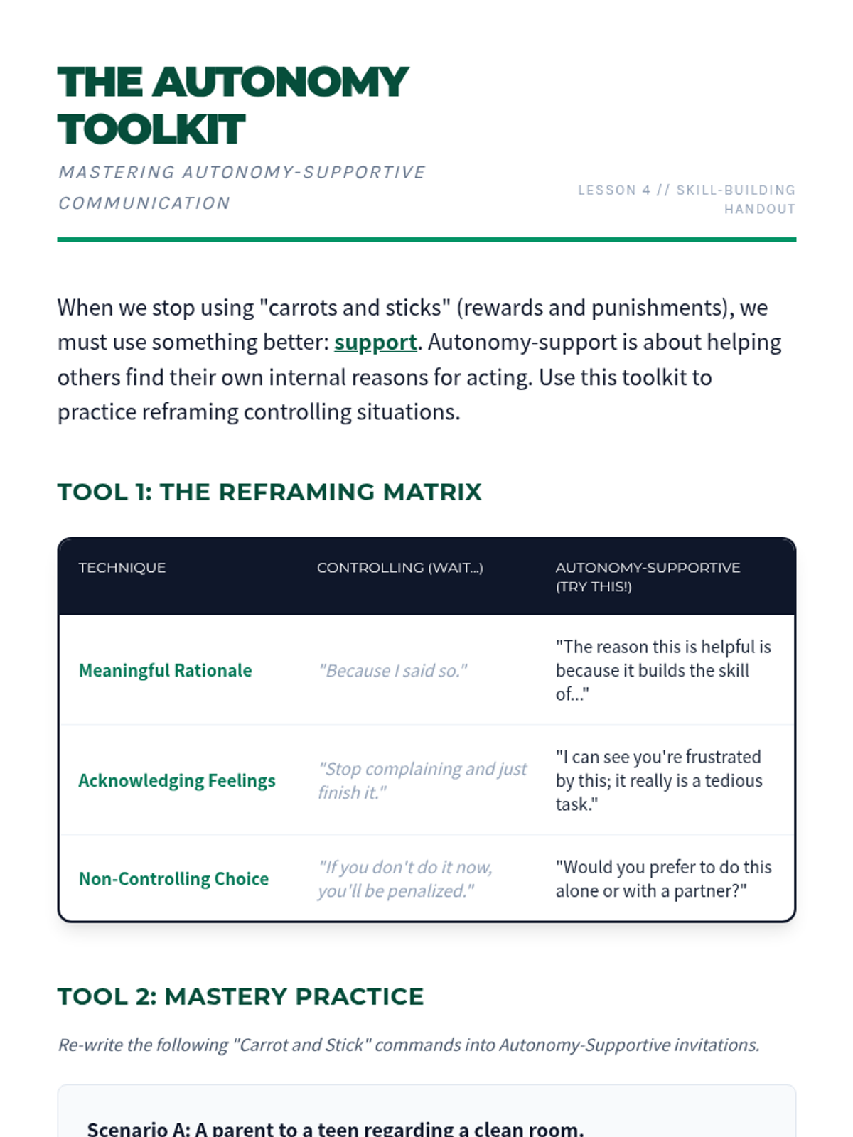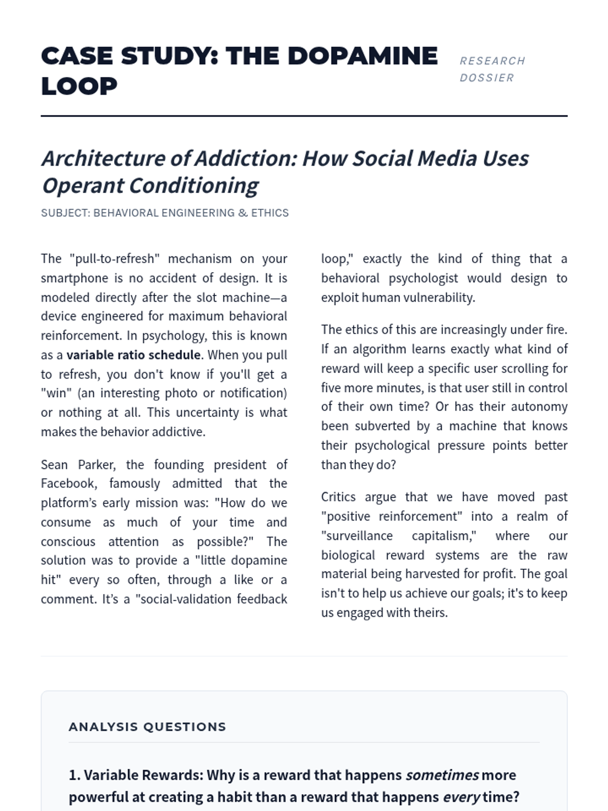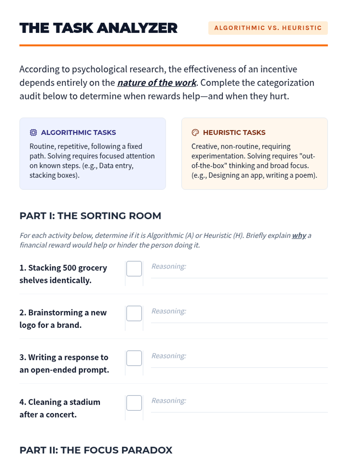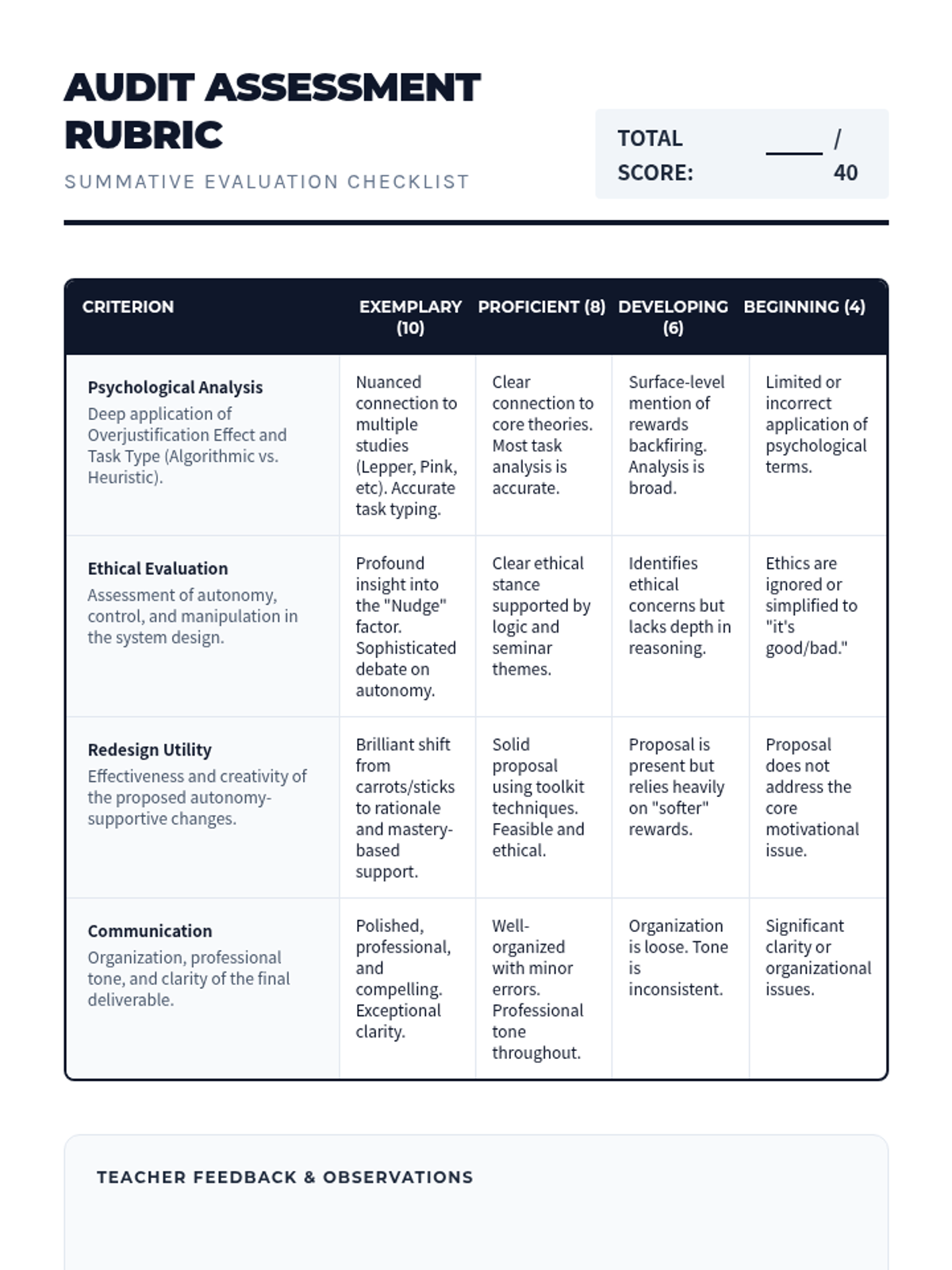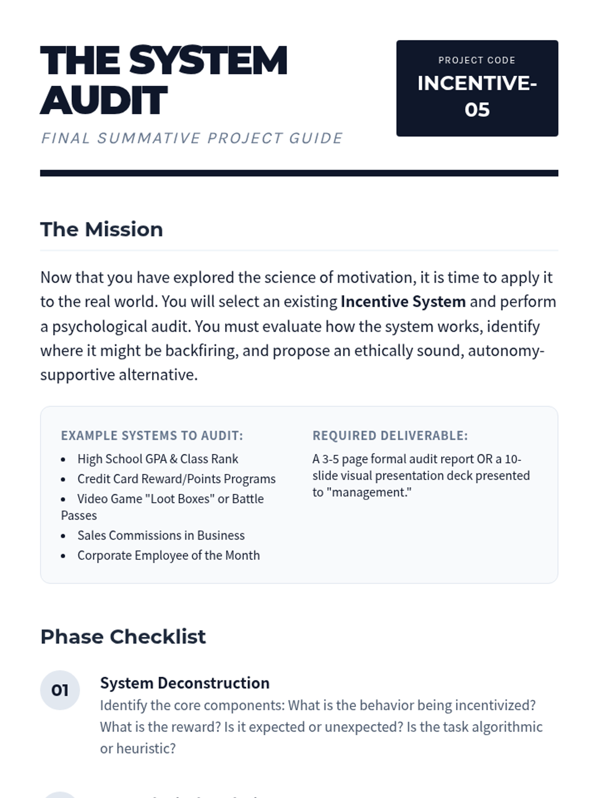 This sequence examines the psychological and ethical limits of positive reinforcement. Students analyze the 'Overjustification Effect', the impact of rewards on creativity, and the ethics of behavioral nudging, concluding with a critical audit of real-world incentive systems.