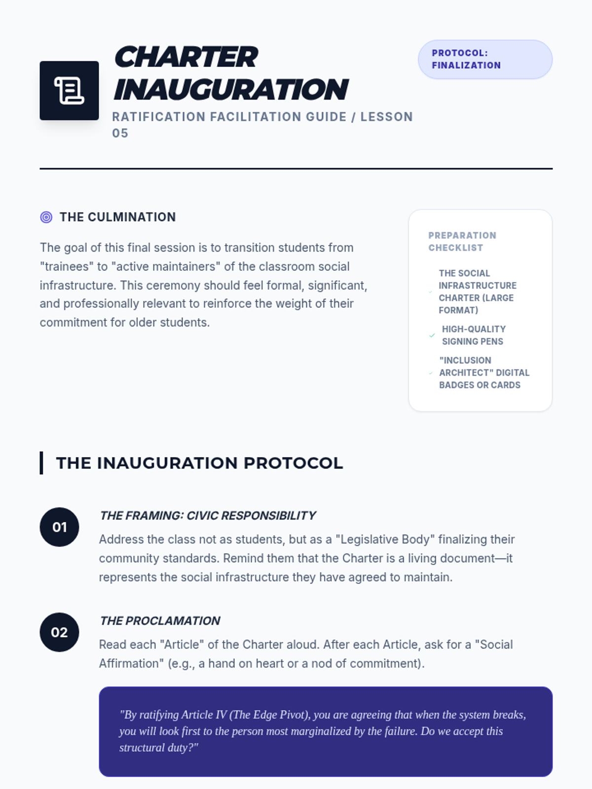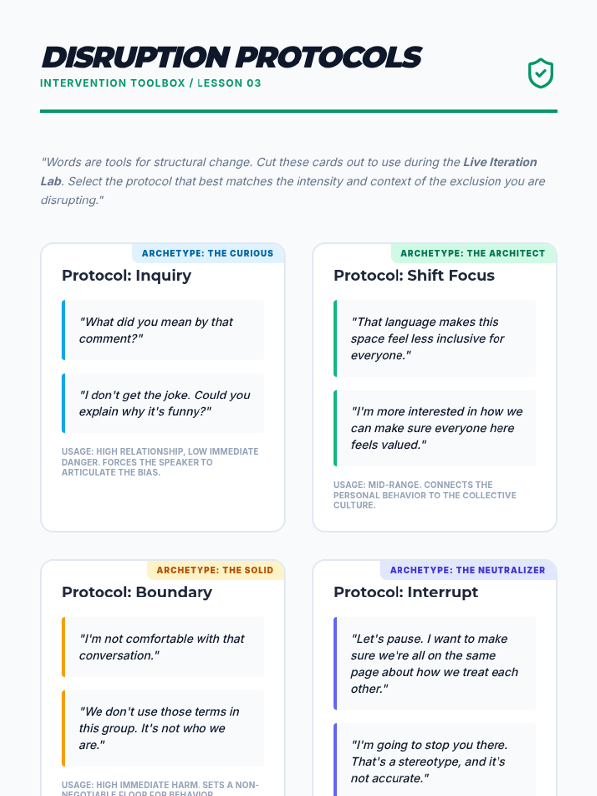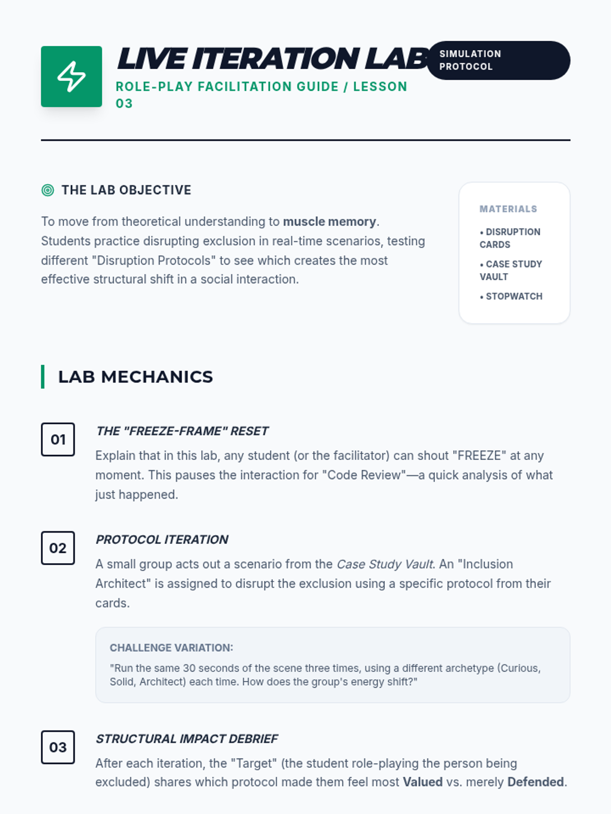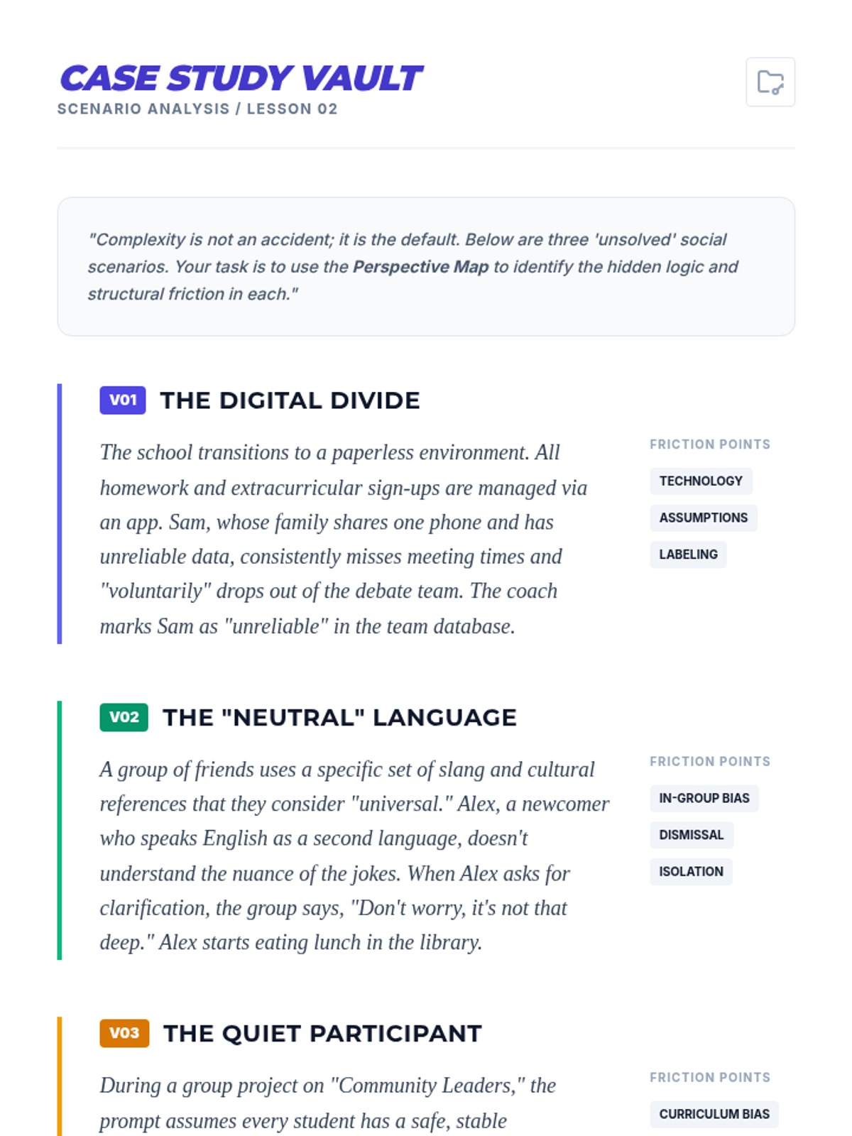 A social-emotional learning sequence for grades 4-10 focused on identifying systemic exclusion, practicing nuanced perspective-taking, and designing inclusive social structures. Students move from awareness to activism through simulation, case studies, and design thinking.