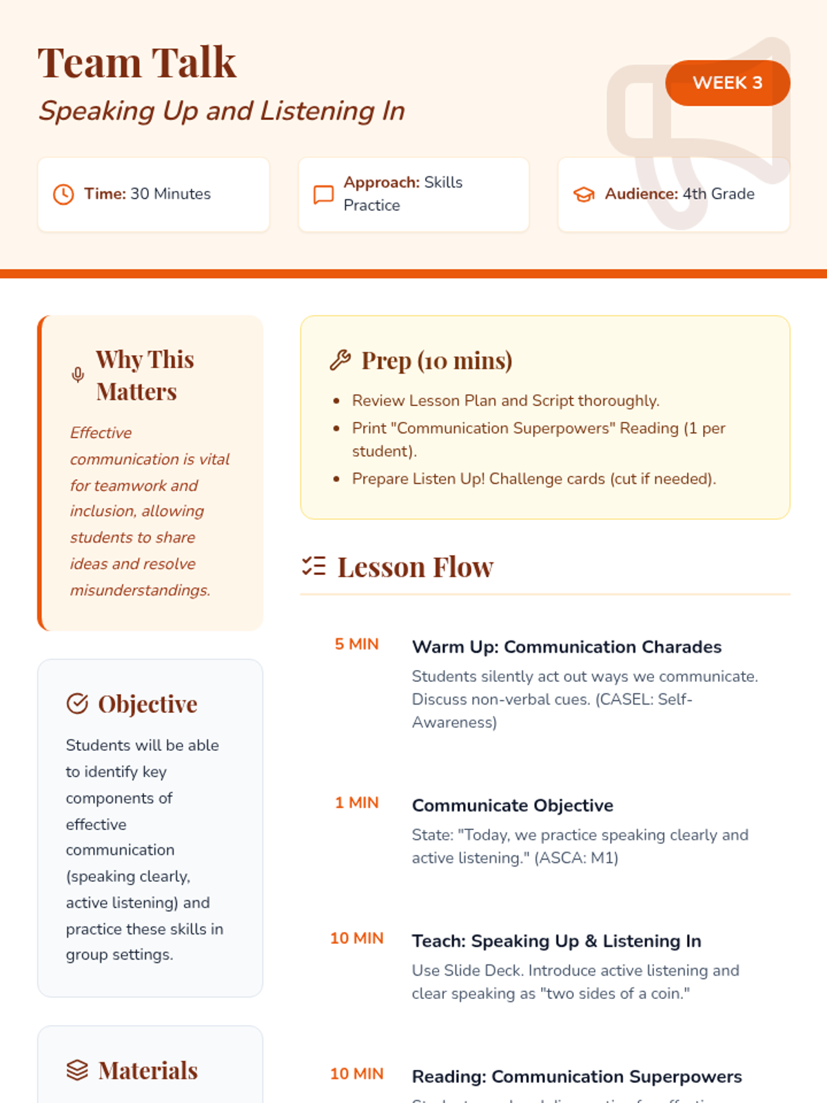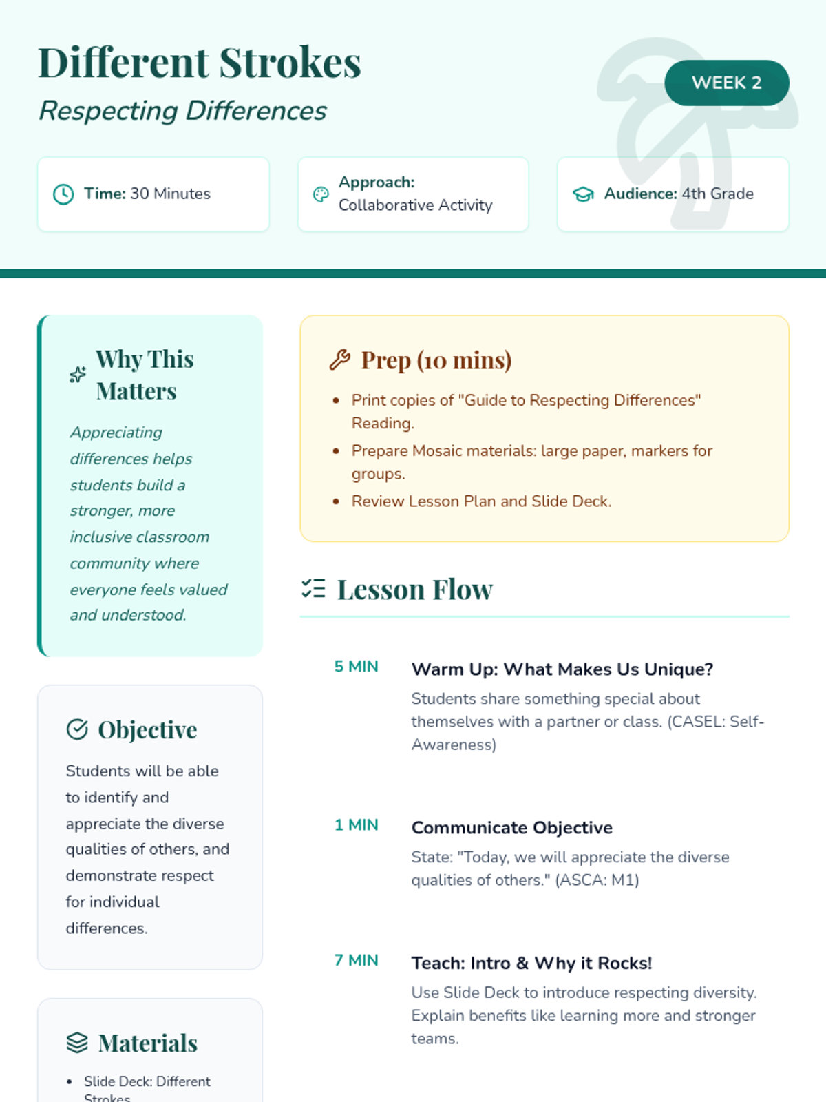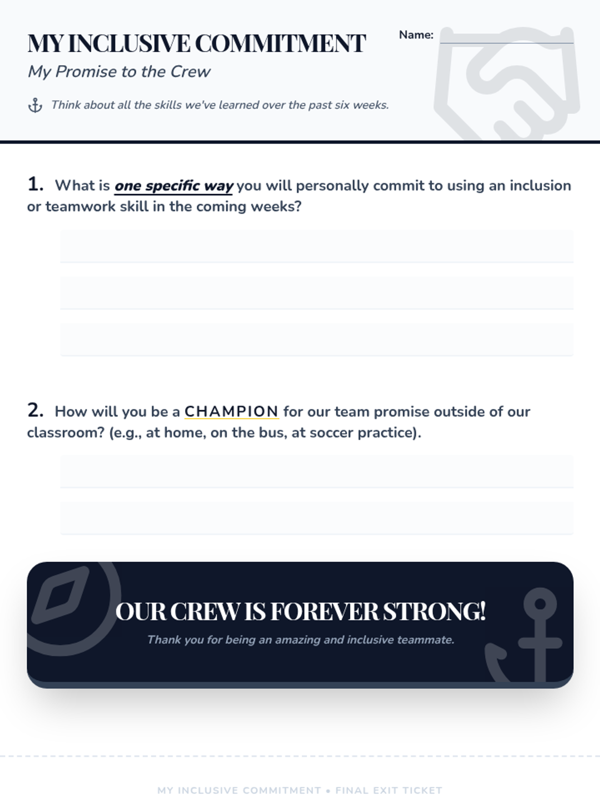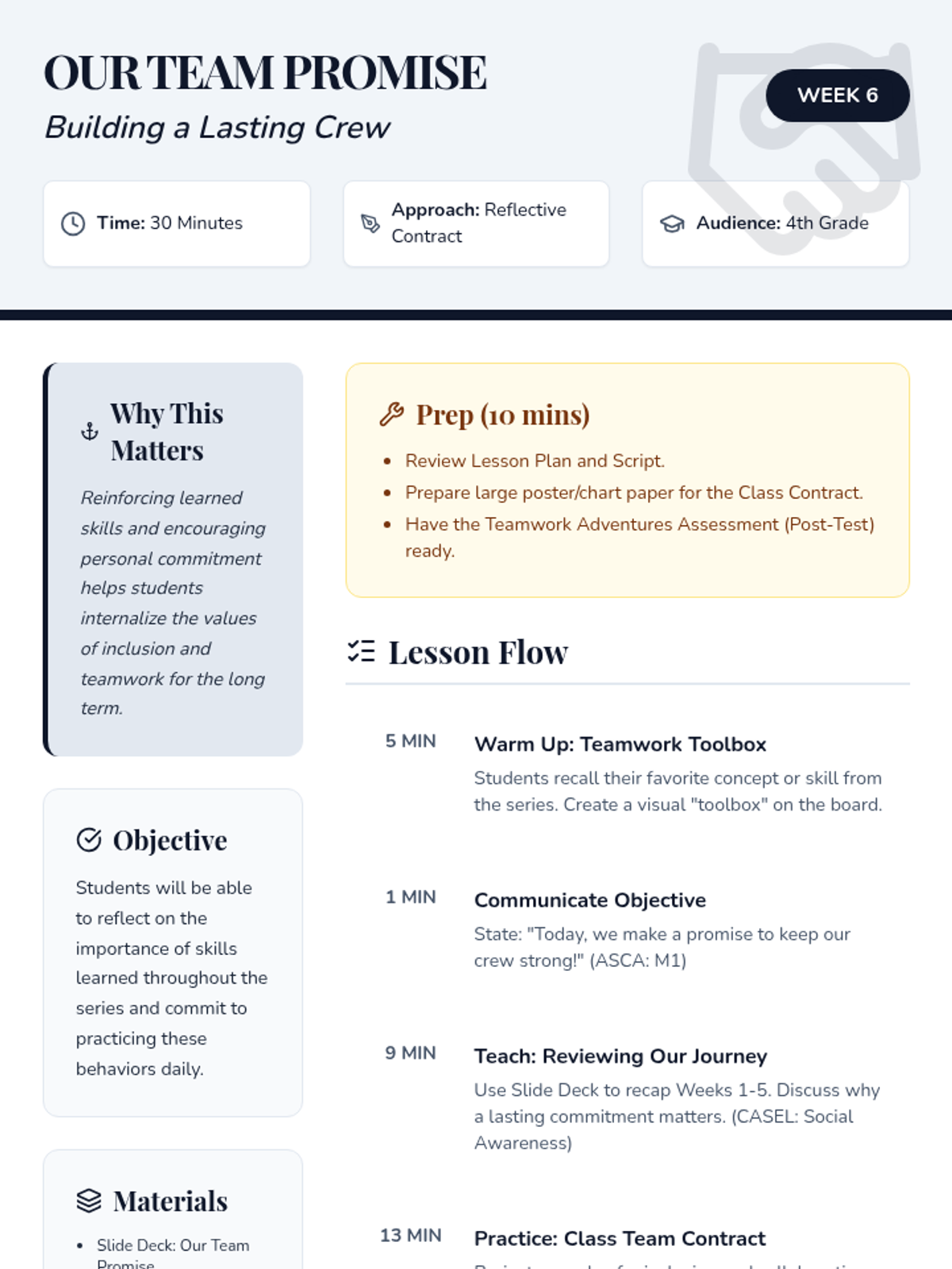 A 6-week social-emotional learning sequence for 4th graders focused on inclusion, communication, and collaborative teamwork. Students explore empathy, diversity, and problem-solving to build a supportive classroom 'crew'.
