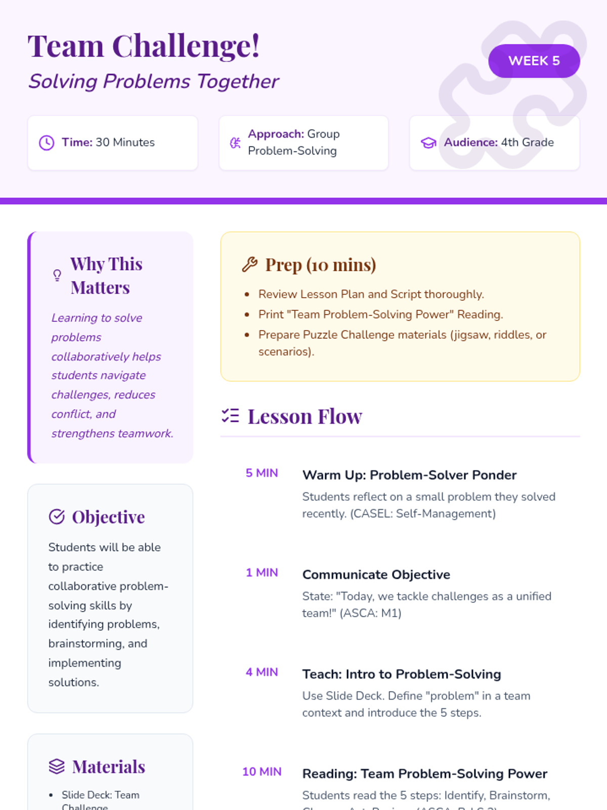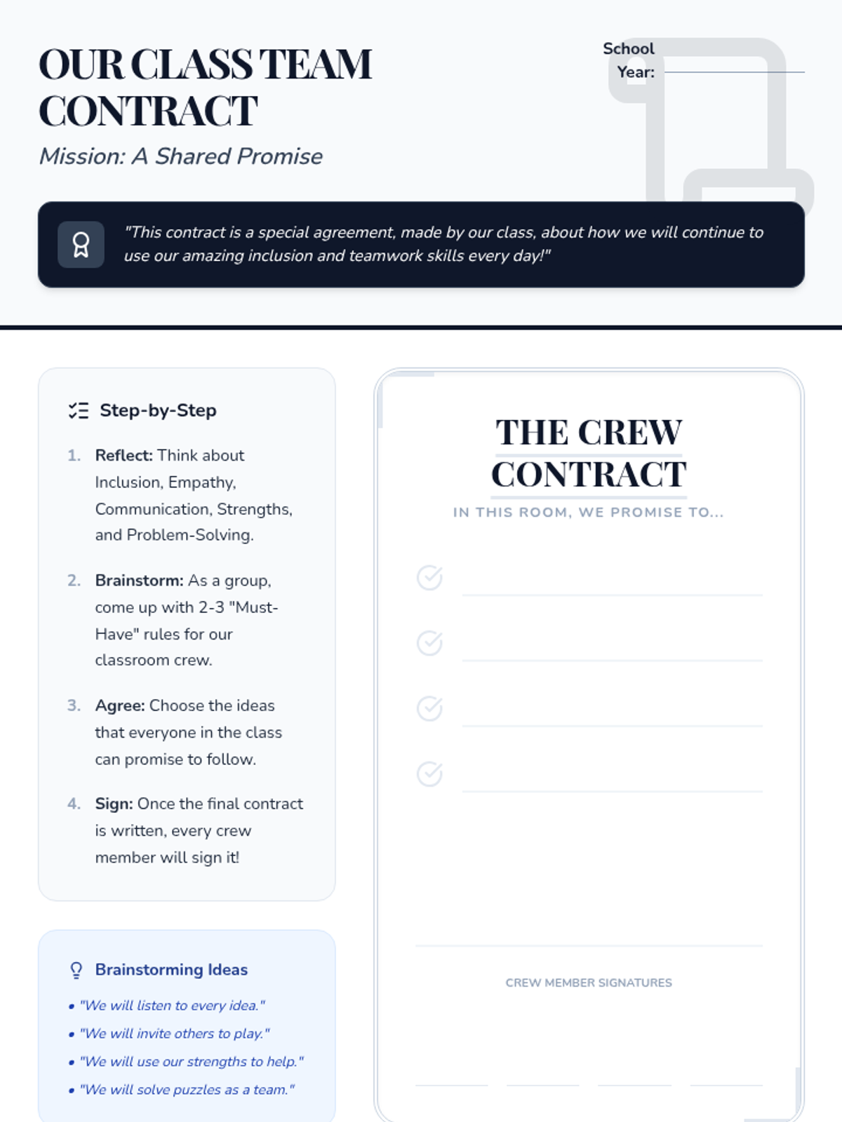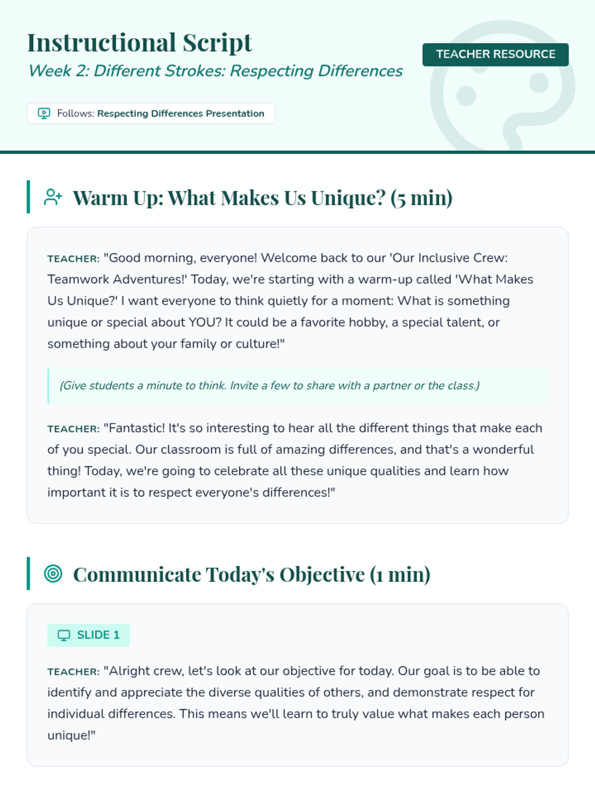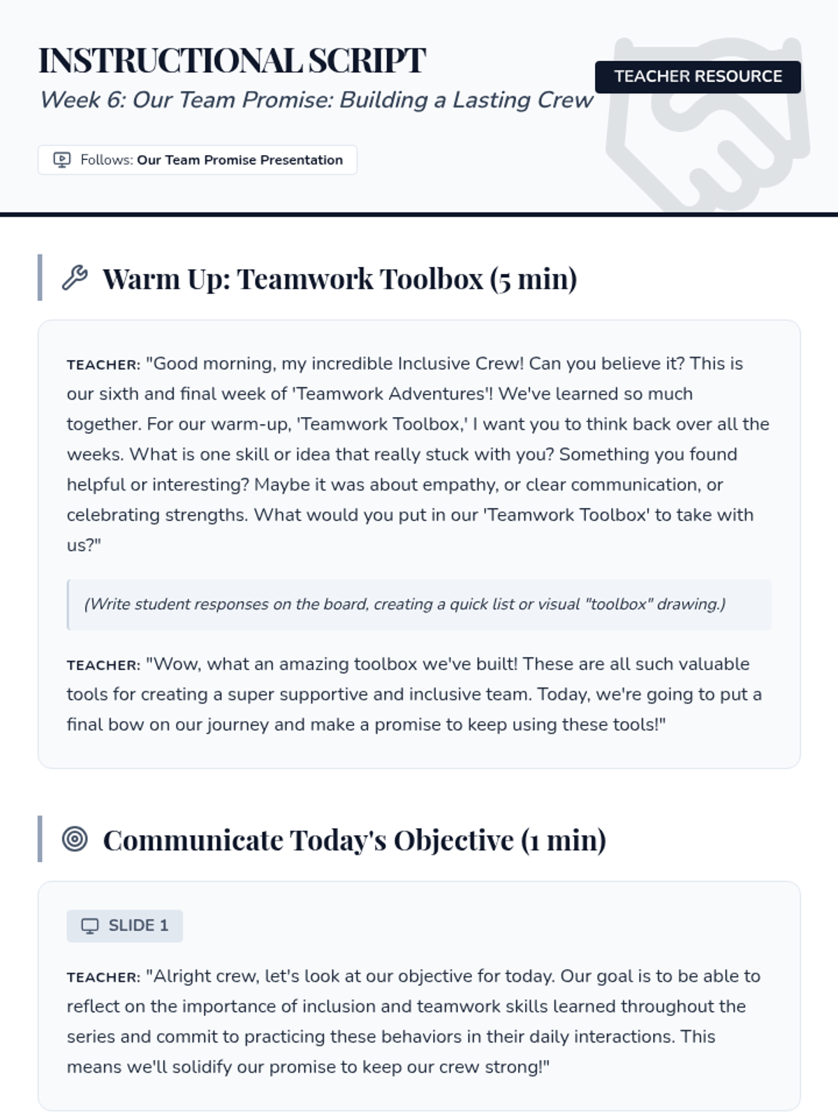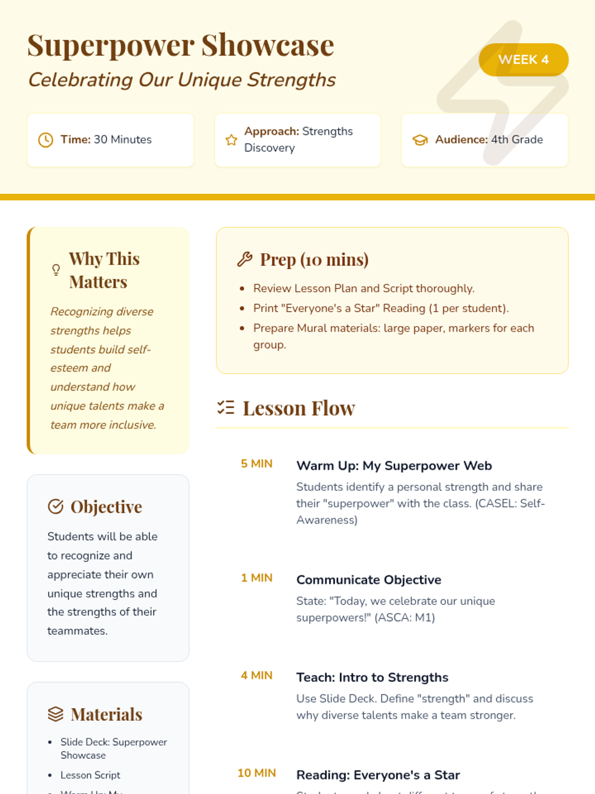 A 6-week social-emotional learning sequence for 4th graders focused on inclusion, communication, and collaborative teamwork. Students explore empathy, diversity, and problem-solving to build a supportive classroom 'crew'.