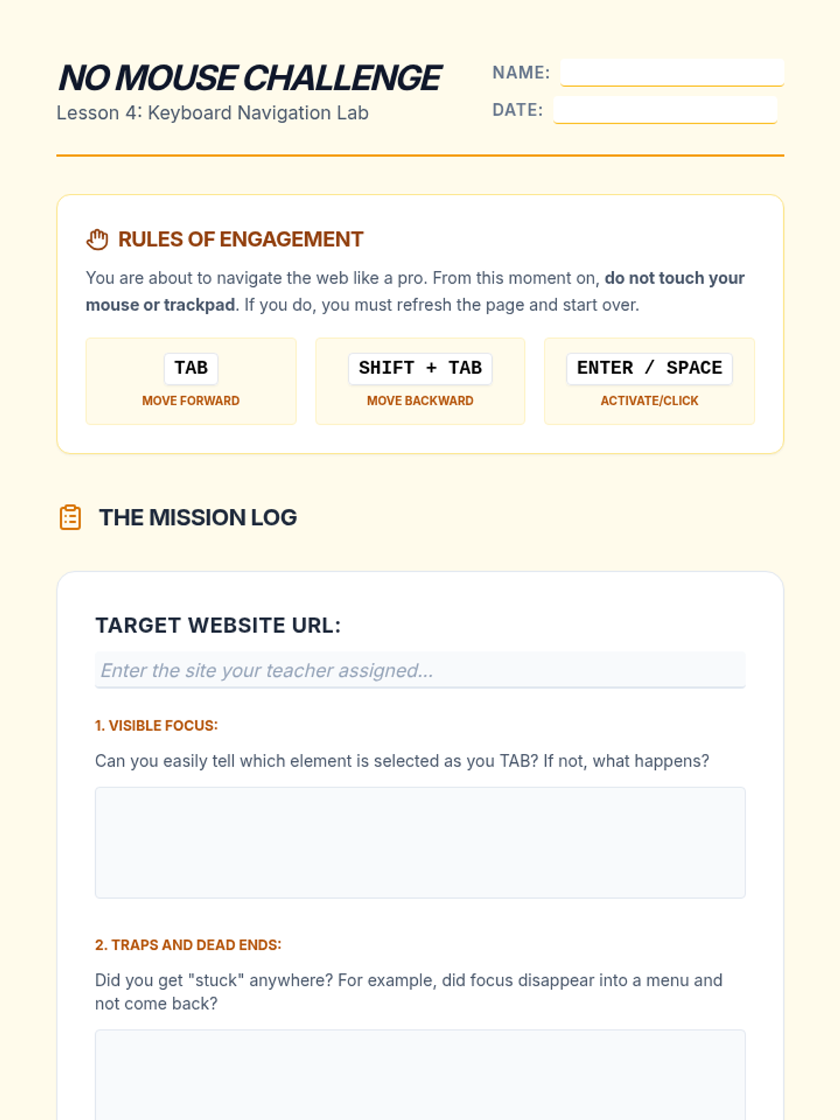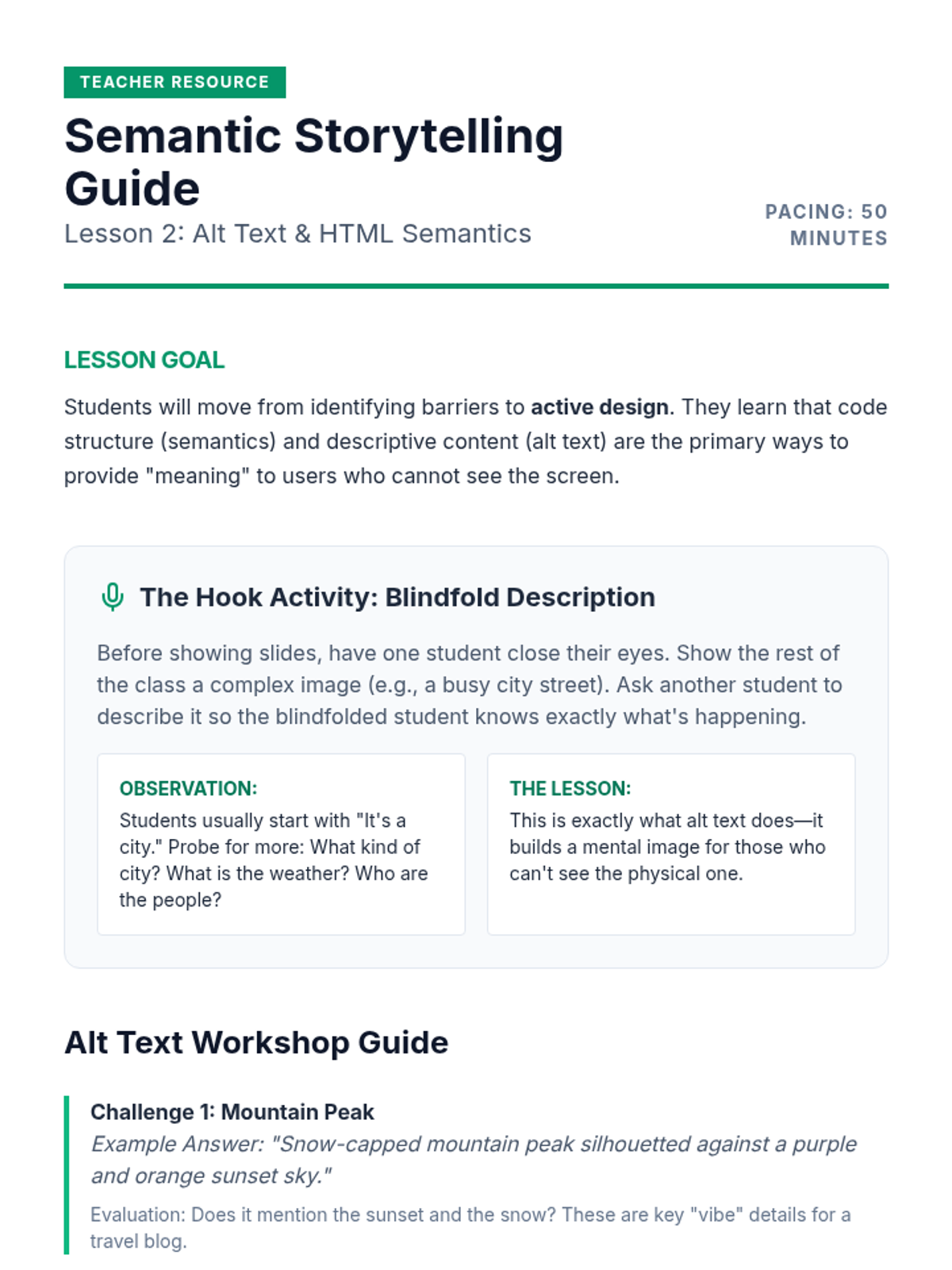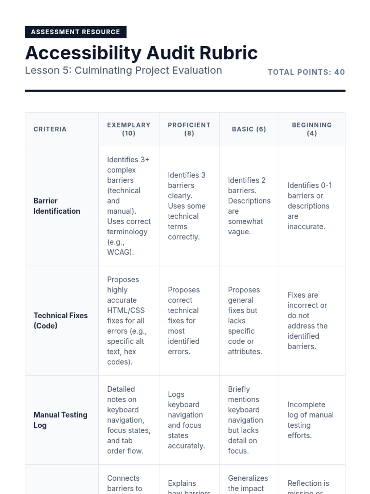 A comprehensive sequence for 7th-grade students exploring the ethics and techniques of web accessibility. Students learn to design inclusive digital spaces through simulations, semantic coding, and accessibility audits.