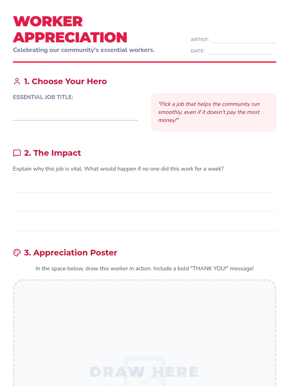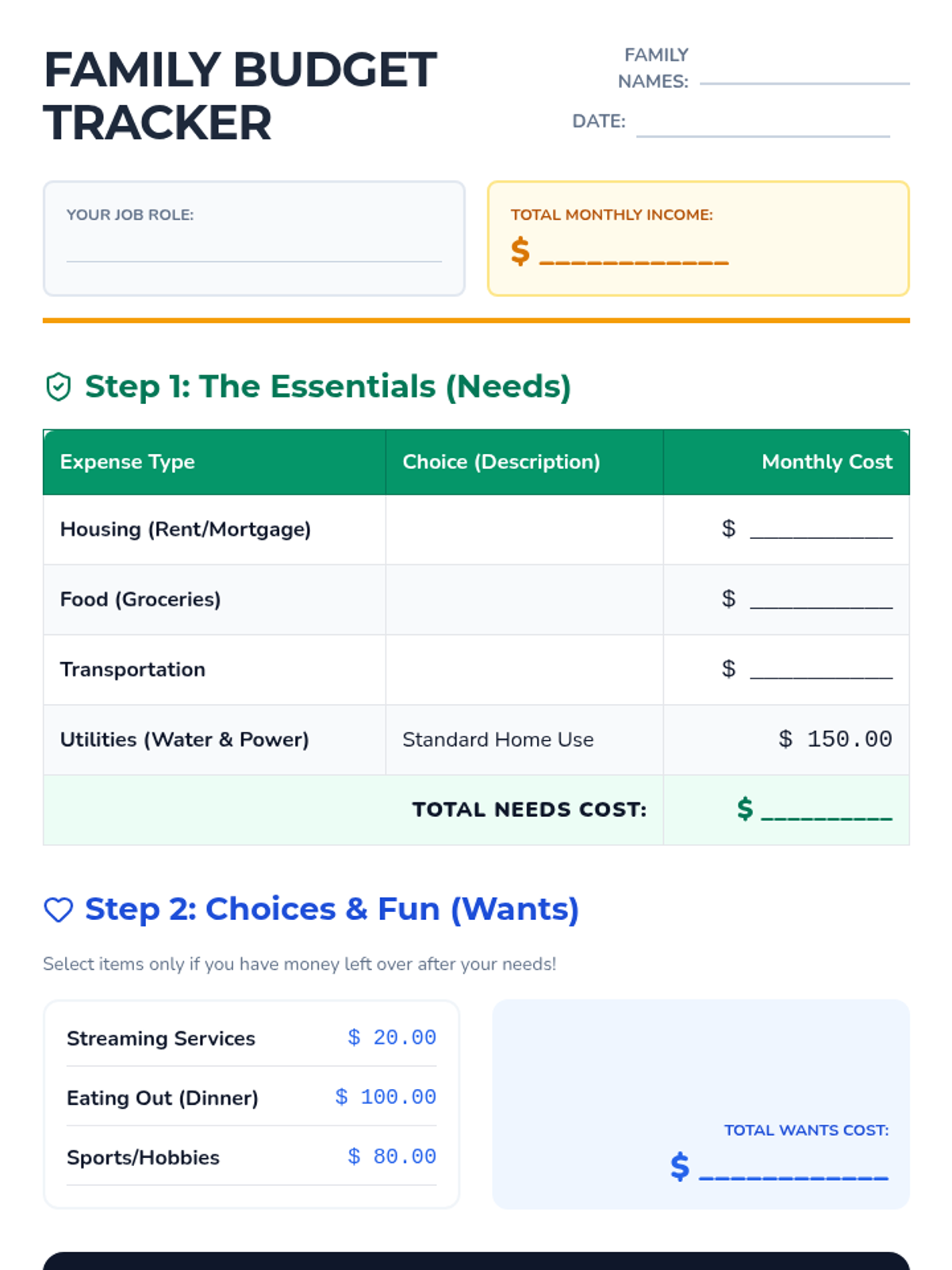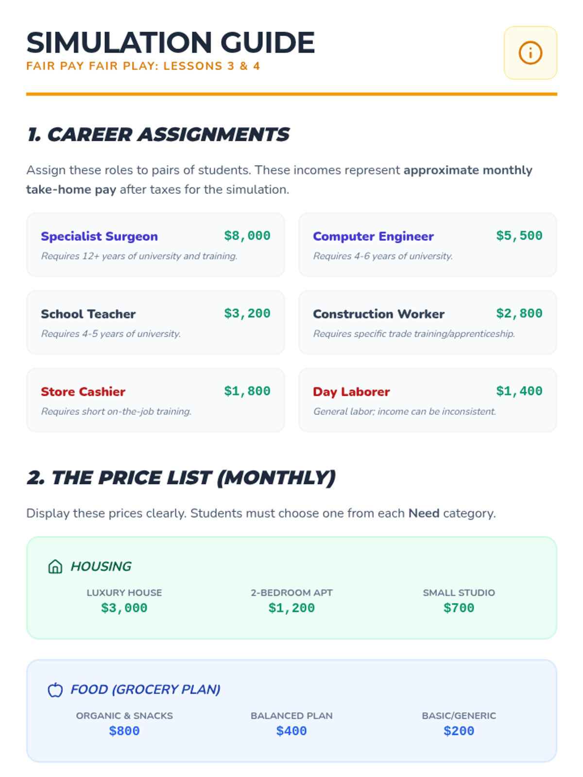This sequence explores the relationship between education, jobs, and income. Students learn about budgeting, the impact of unexpected expenses, and the intrinsic value of all community work, addressing economic inequality through practical simulations and reflection.