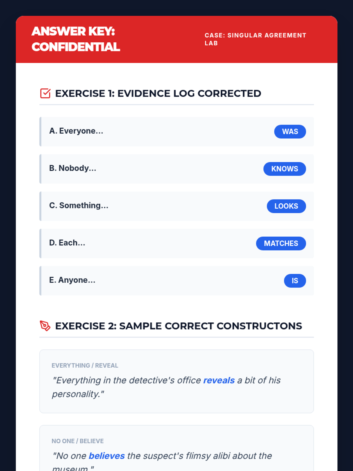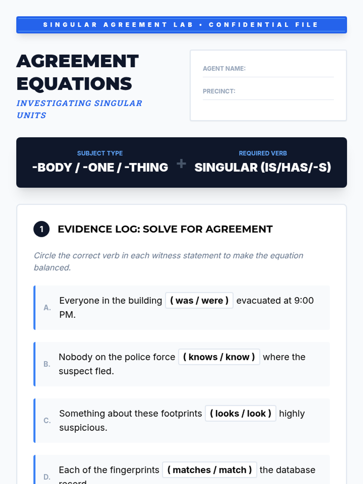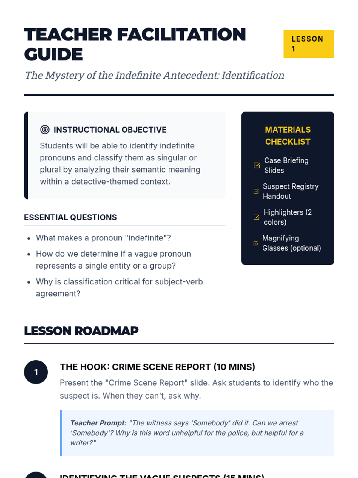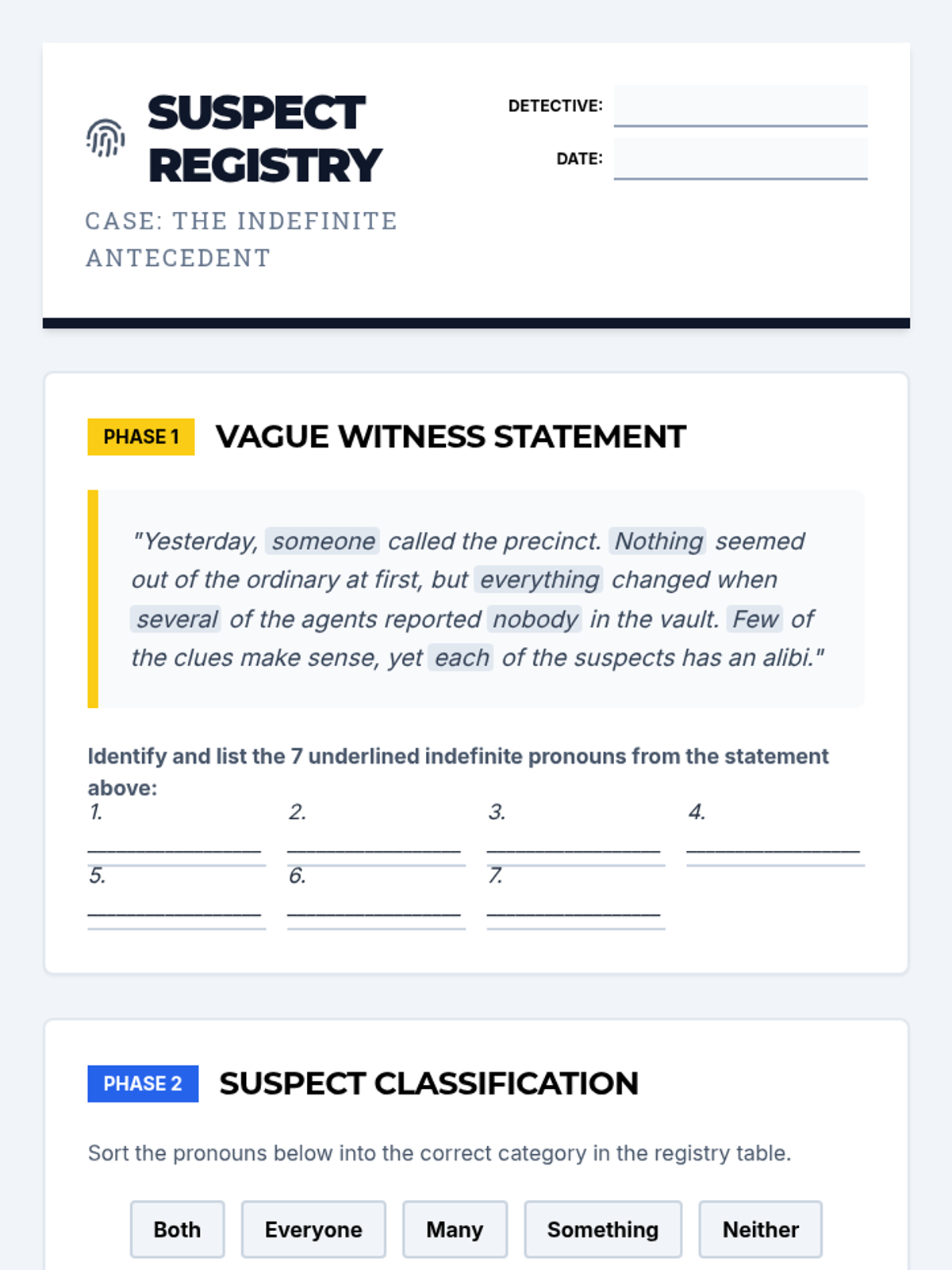 A detective-themed grammar sequence where students investigate the rules of indefinite pronouns and subject-verb agreement. Students move from basic identification to mastering the complex agreement rules of singular, plural, and variable indefinite pronouns.