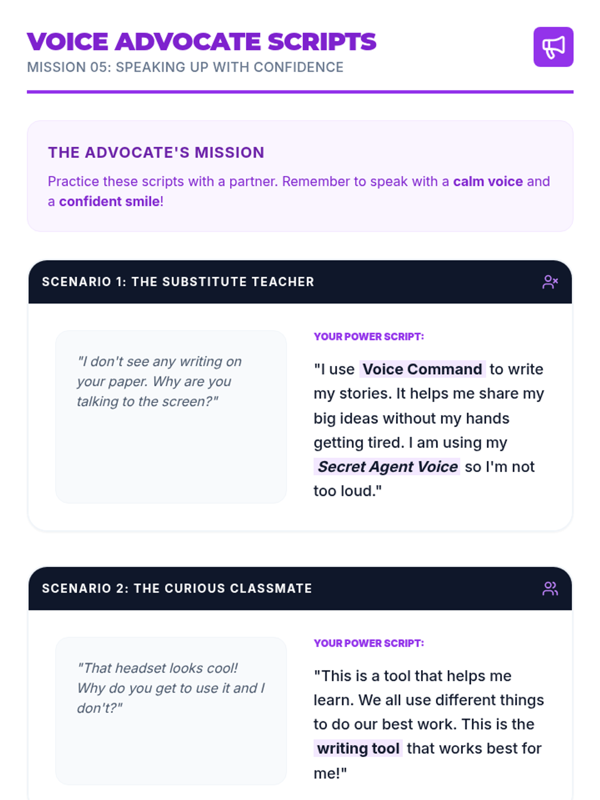 A 5-lesson sequence for 3rd-grade students to master independent use of speech-to-text dictation tools, focusing on self-awareness, environment management, troubleshooting, and self-advocacy.