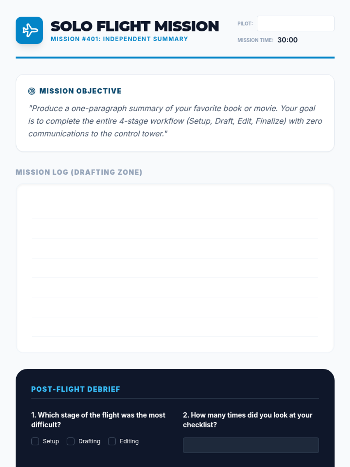 A four-lesson sequence designed for a 10th-grade student with ADHD to manage boredom, prevent elopement, and develop self-regulation strategies when work is completed early. The sequence uses a 'Mission Control' theme to empower the student as the pilot of her own classroom experience.