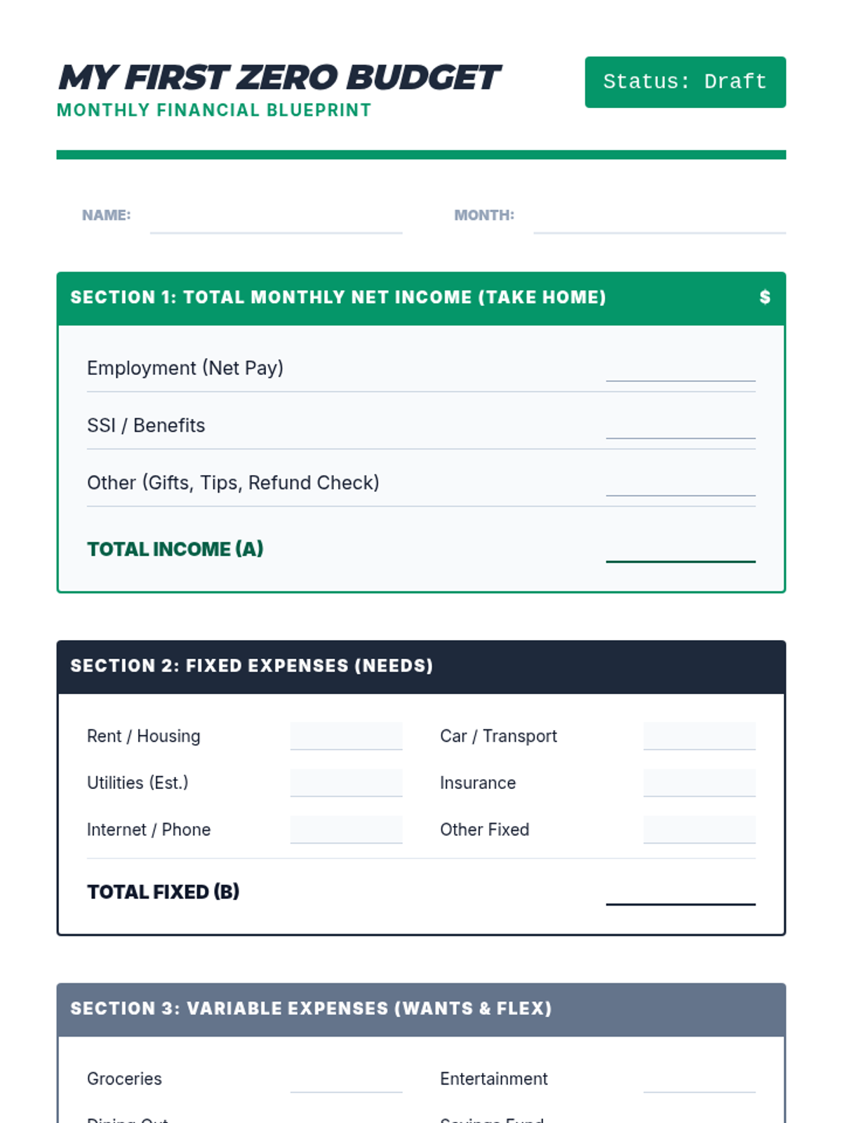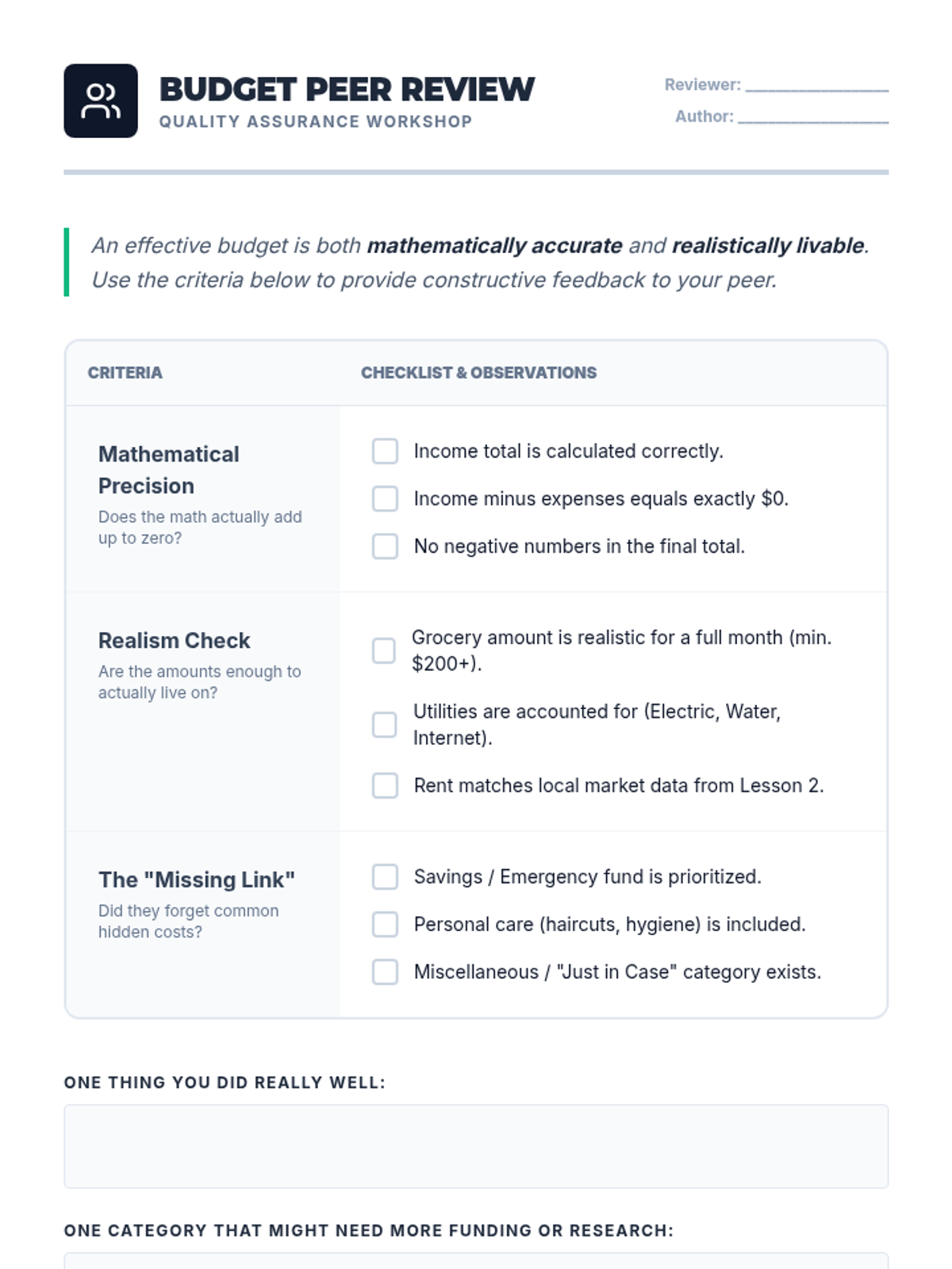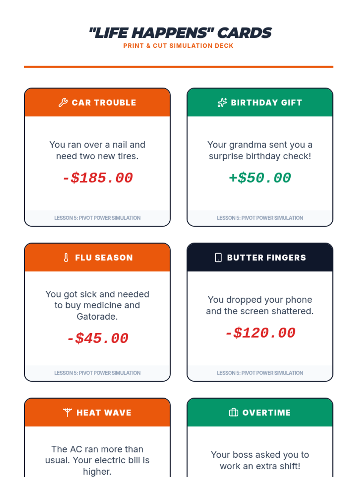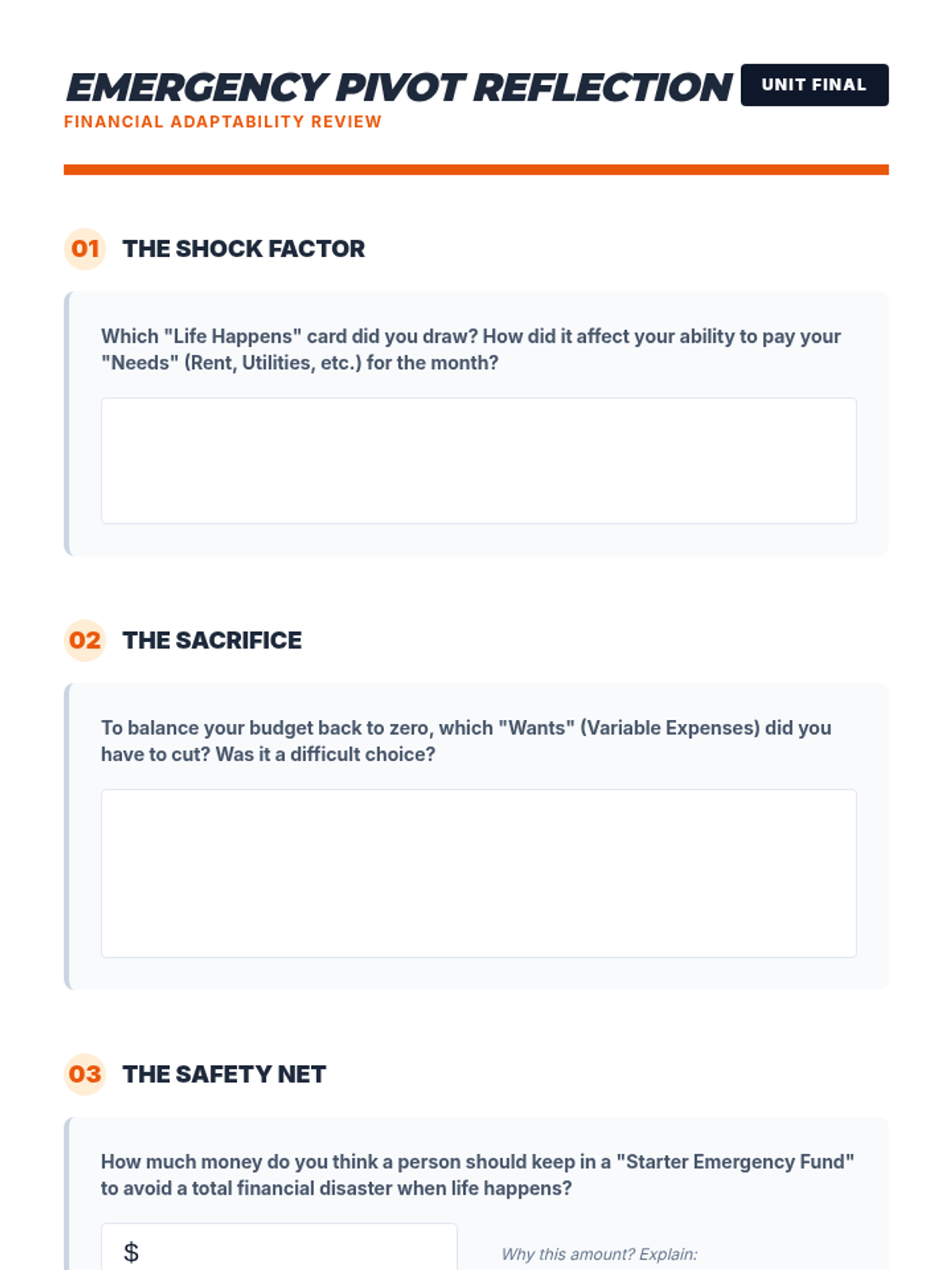 A comprehensive semester-long simulation designed for undergraduate students to master independent living finances. Students progress from understanding income and taxes to building zero-based budgets, navigating digital banking, and managing unexpected financial emergencies.