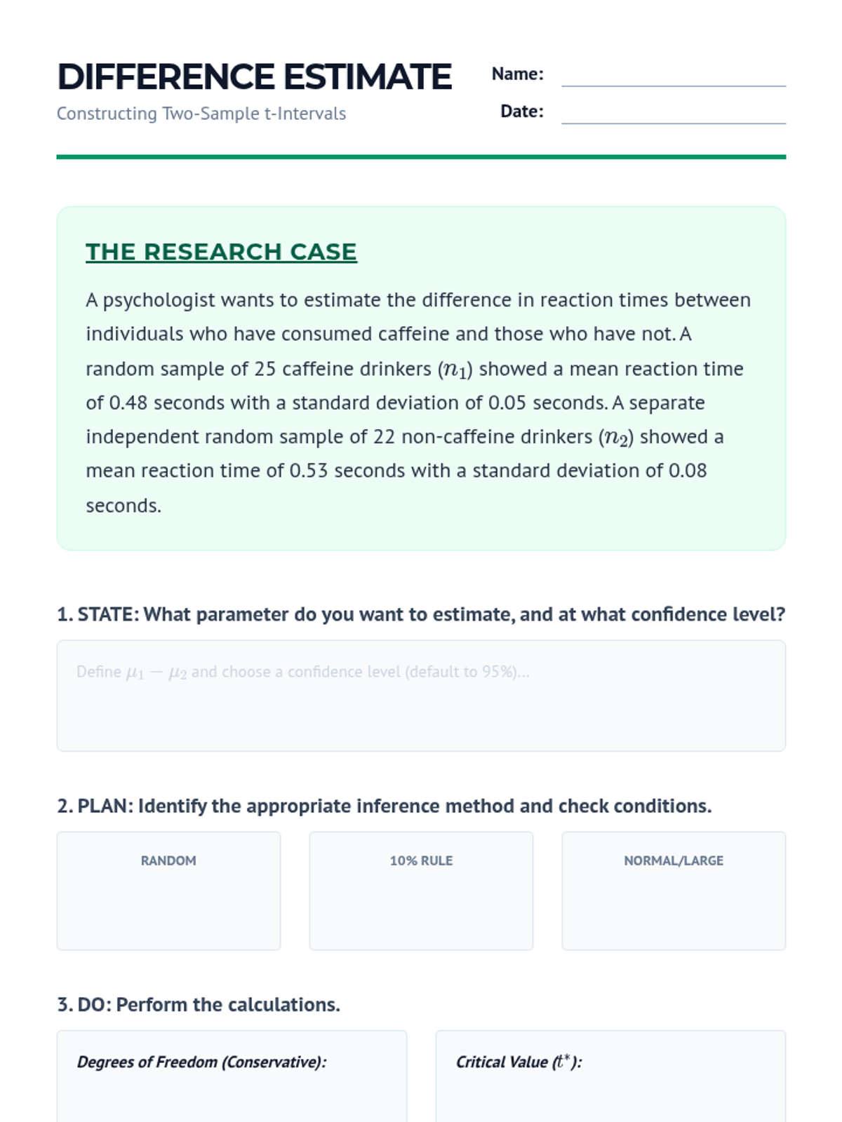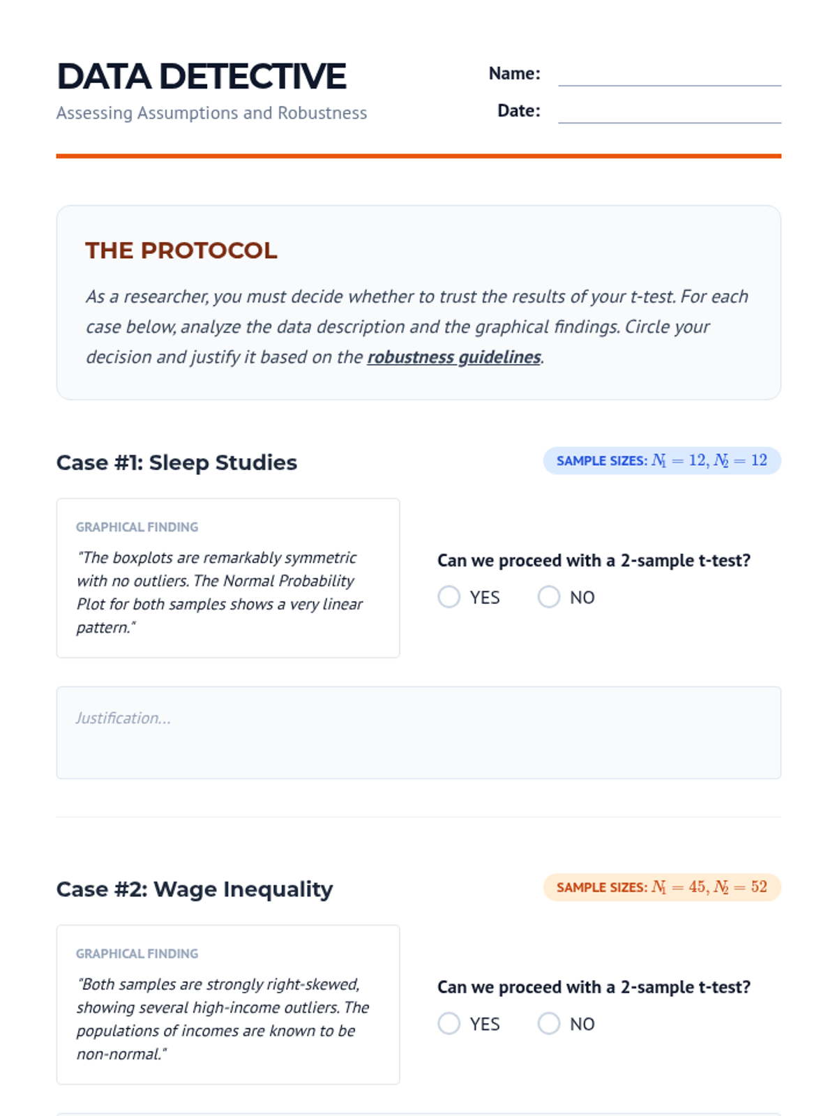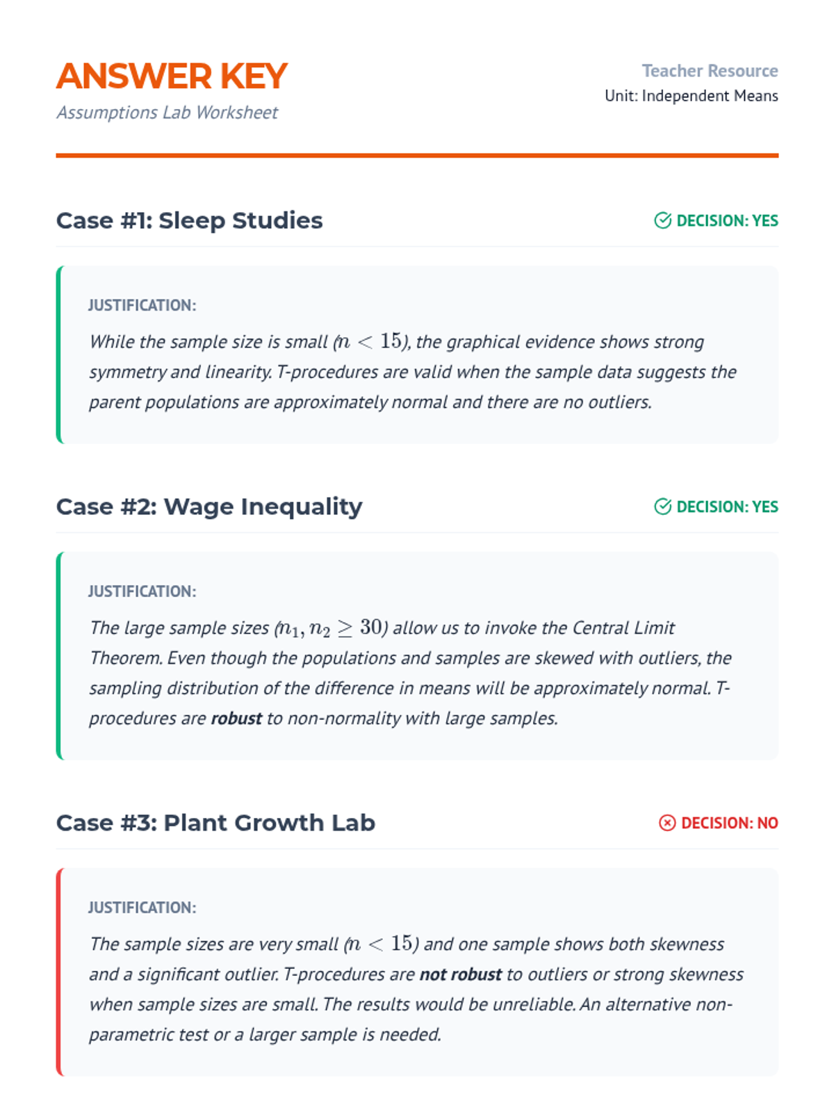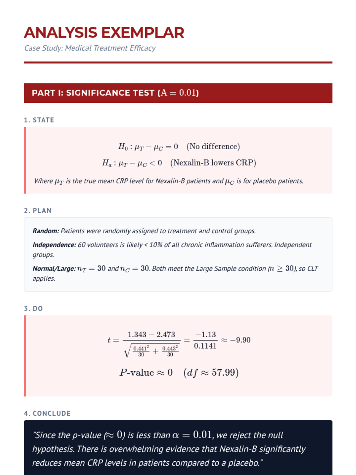 A comprehensive unit on comparing means from two independent populations. Students move from the theoretical foundations of sampling distributions to practical applications in clinical trials, mastering two-sample t-procedures, degrees of freedom, and robustness analysis.