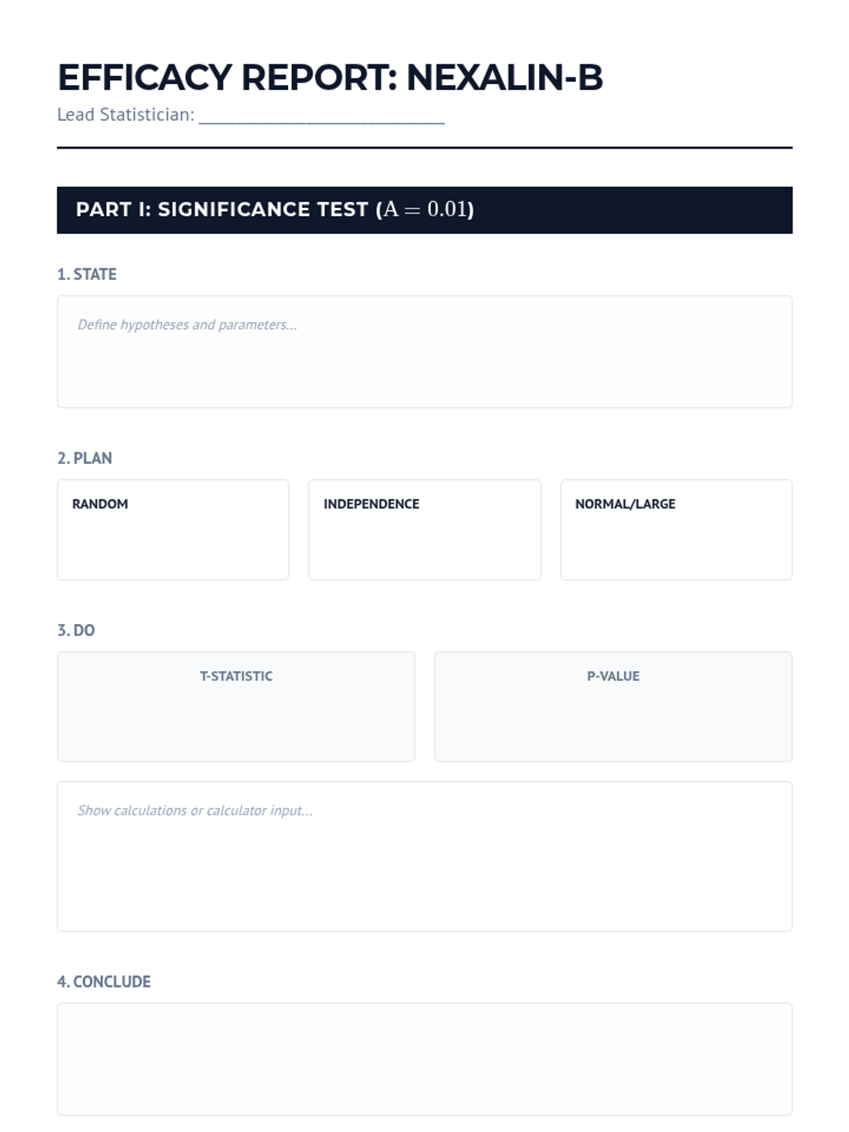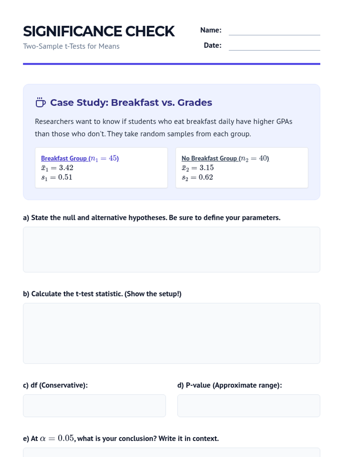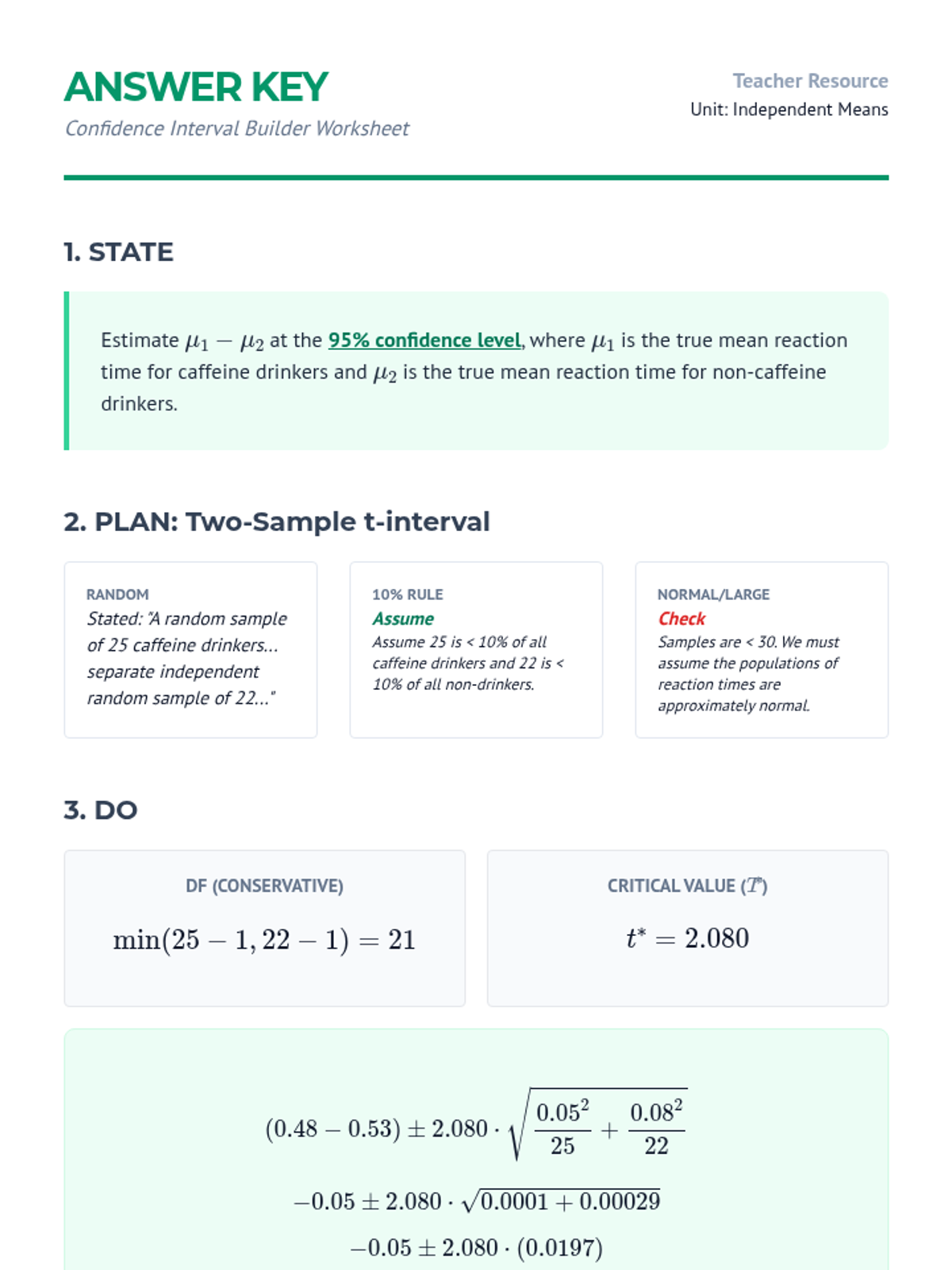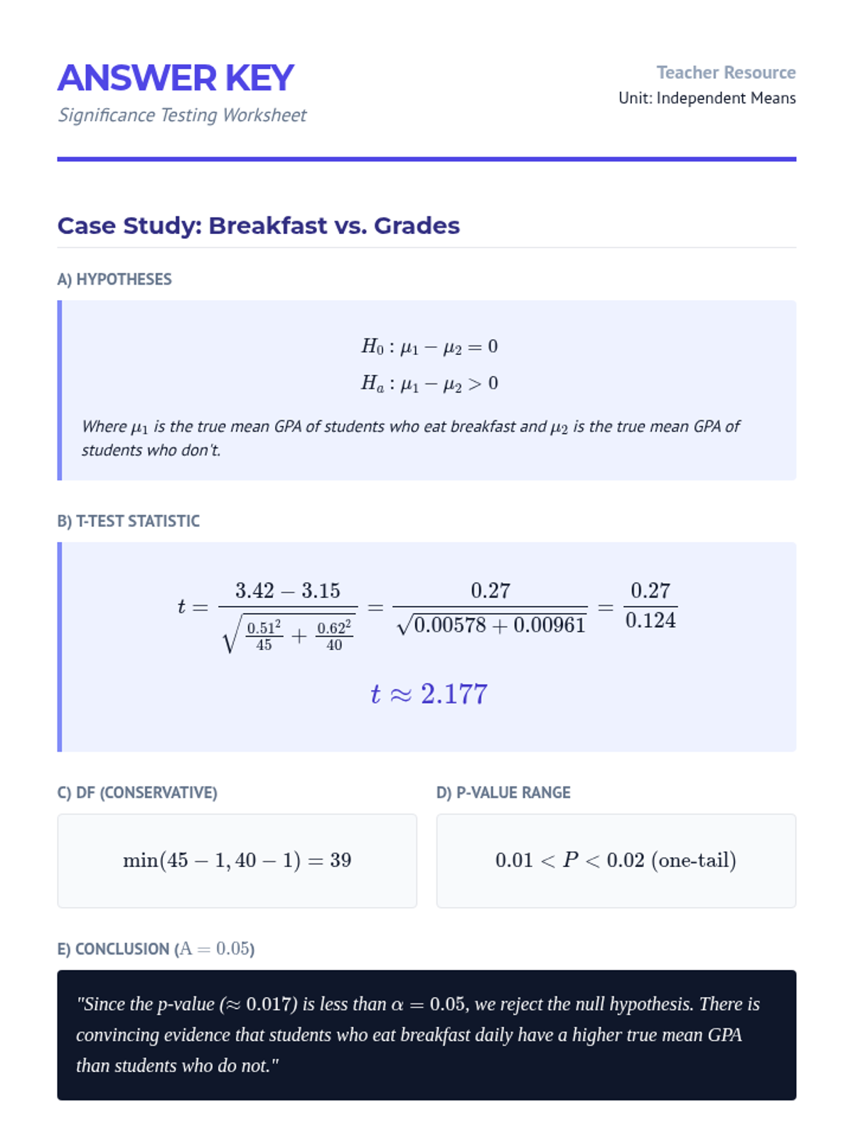 A comprehensive unit on comparing means from two independent populations. Students move from the theoretical foundations of sampling distributions to practical applications in clinical trials, mastering two-sample t-procedures, degrees of freedom, and robustness analysis.
