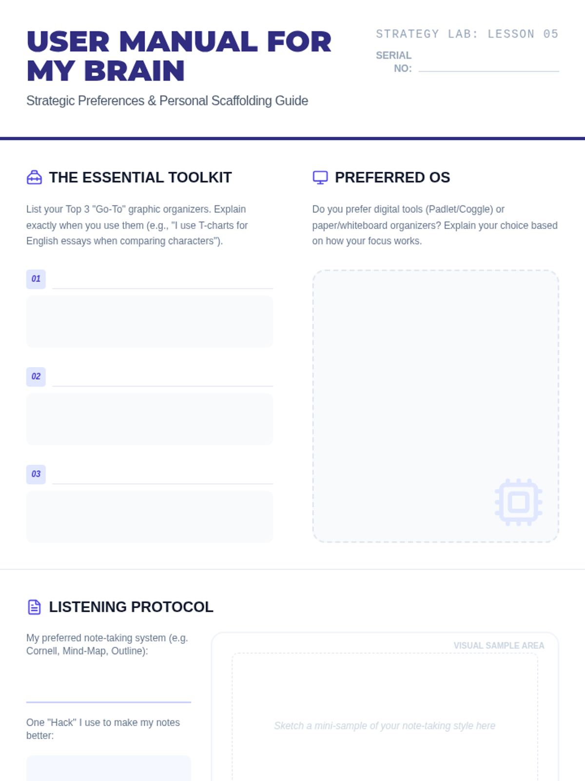 This sequence empowers 9th-grade students to integrate Text-to-Speech (TTS) into their high school workflows through self-advocacy and digital organization. Students move from identifying reading barriers in their schedules to creating a professional Access Plan for their teachers.