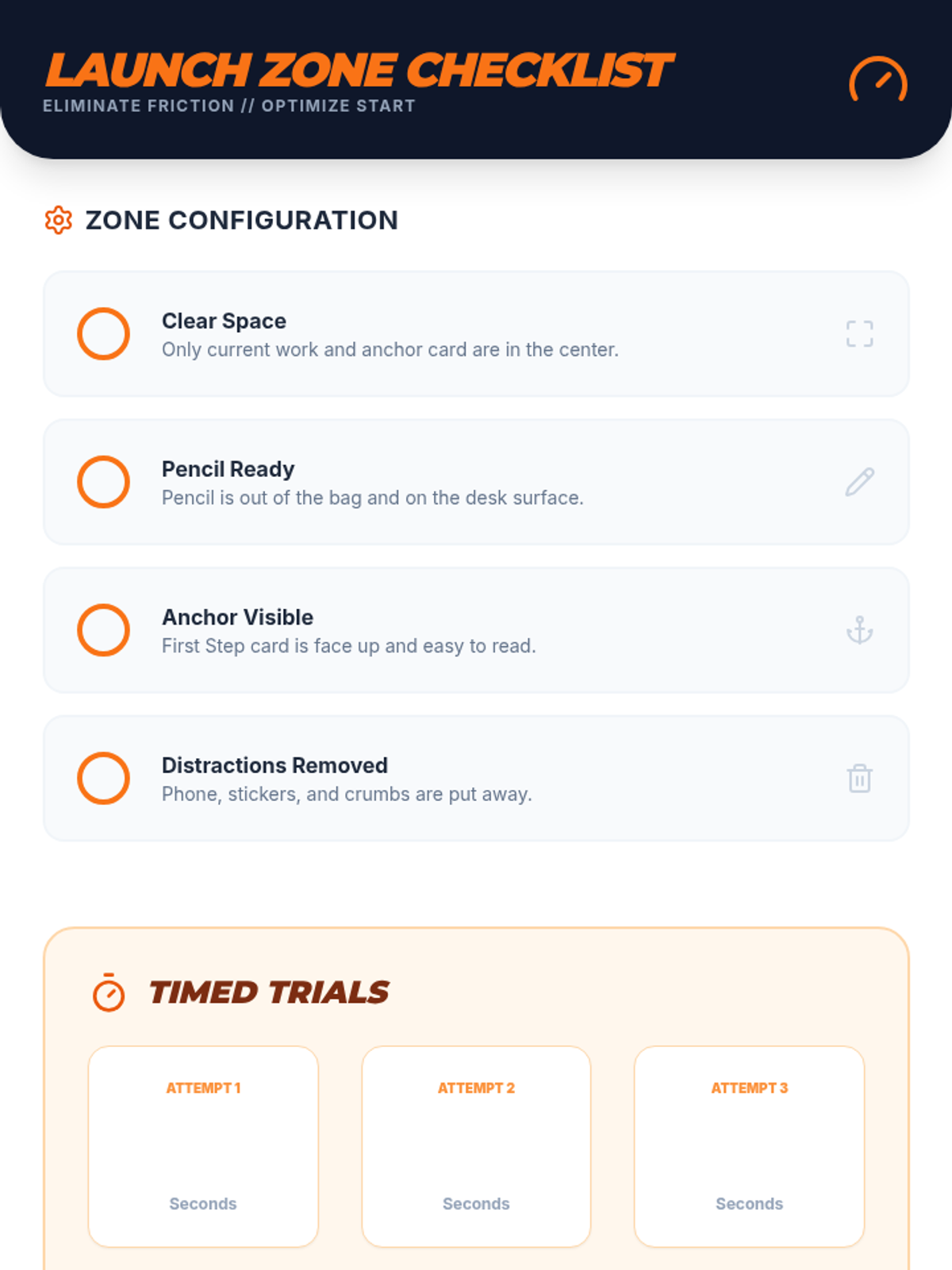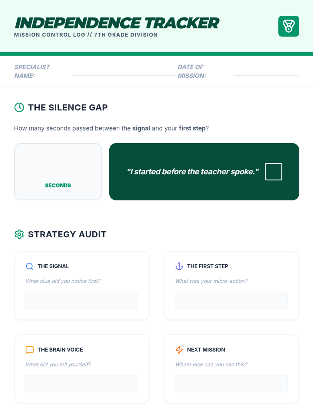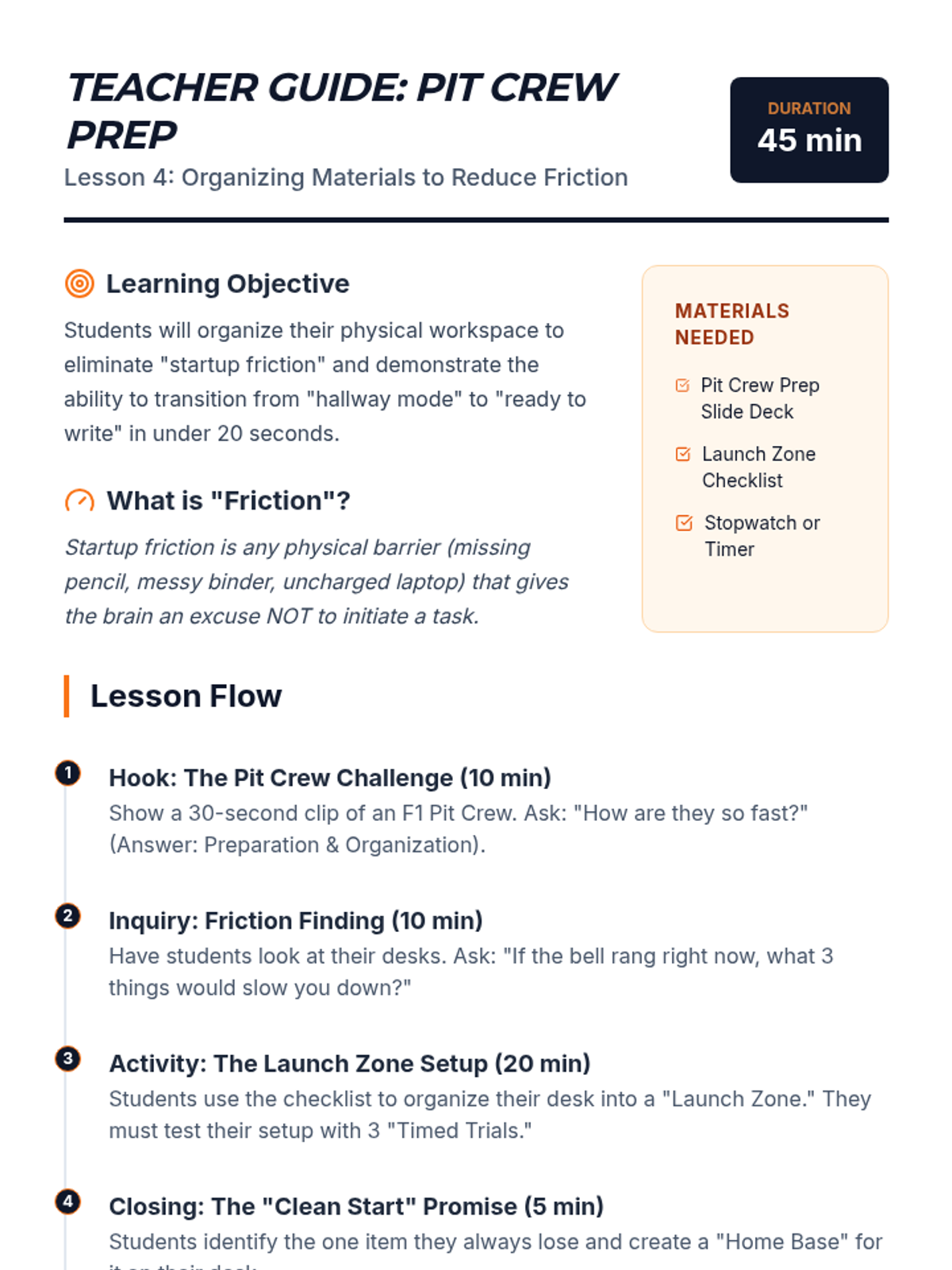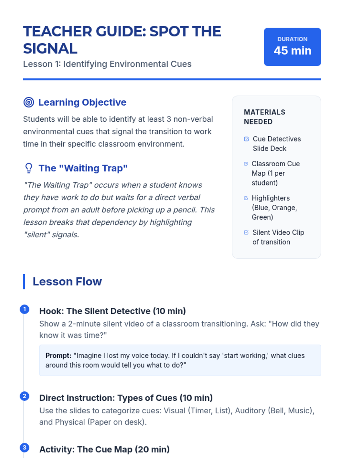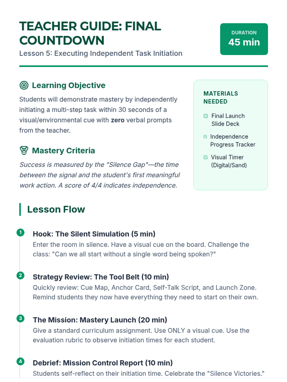 A 5-lesson unit designed to help 7th-grade students move from teacher-dependent task starts to independent initiation using environmental cues, visual anchors, self-talk, and organization.