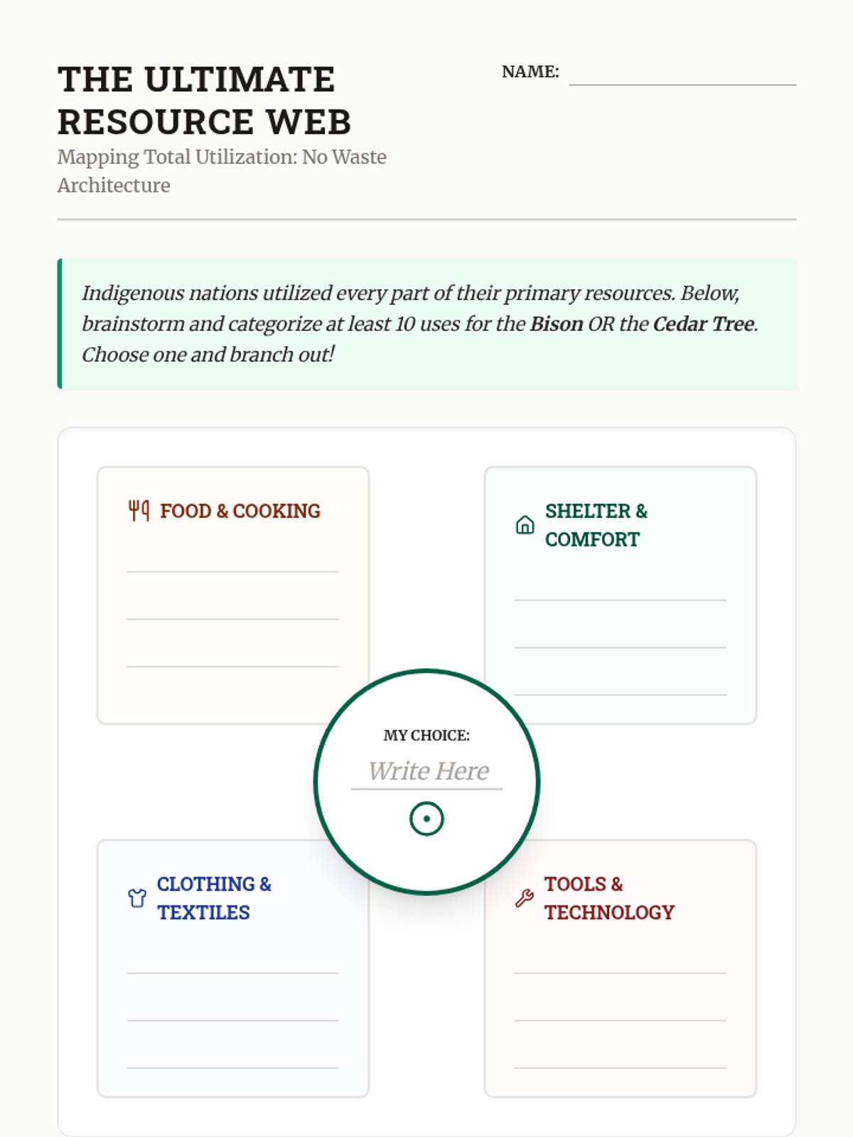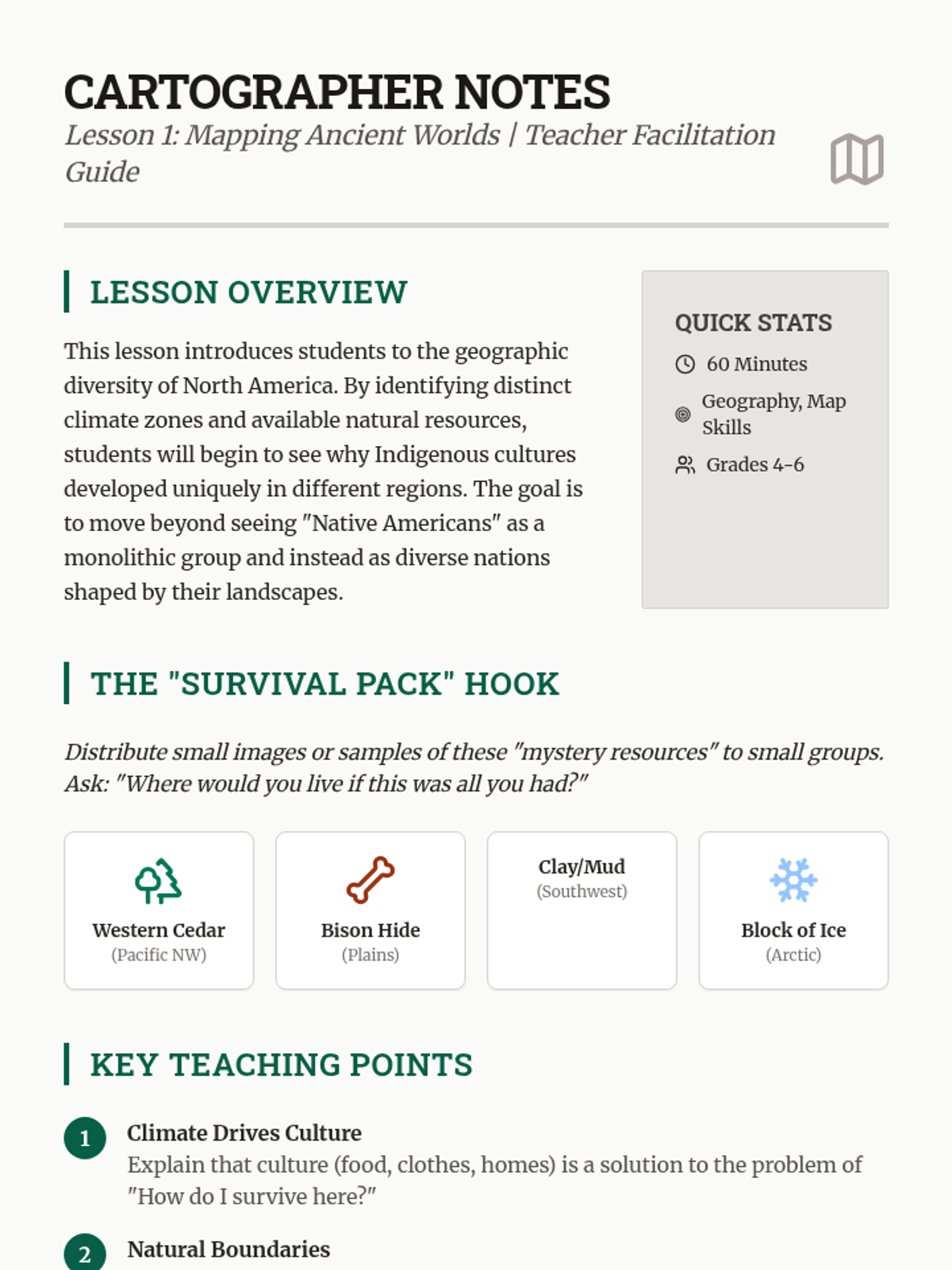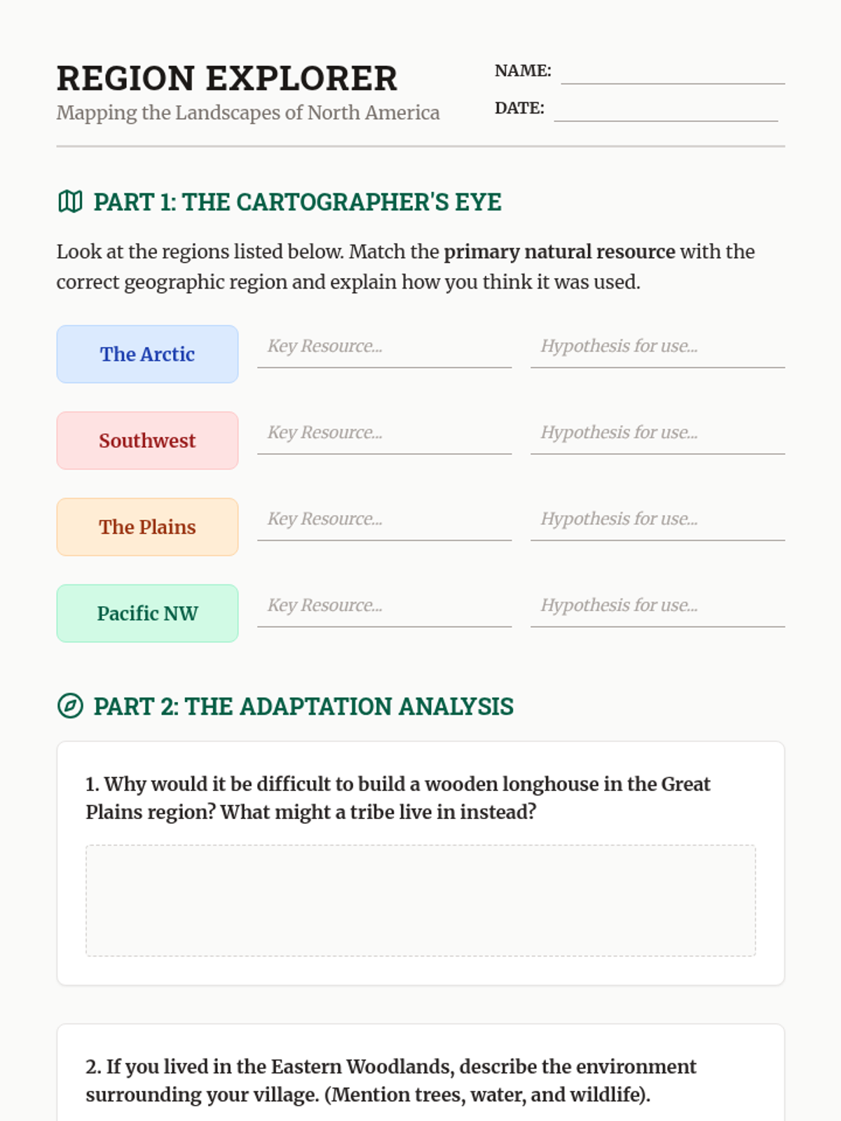 A 5th-grade inquiry-based unit exploring how the diverse physical environments of North America shaped the cultures, technologies, and lifestyles of Indigenous nations. Students analyze geography, resource utilization, and engineering to understand the relationship between humans and their environment.