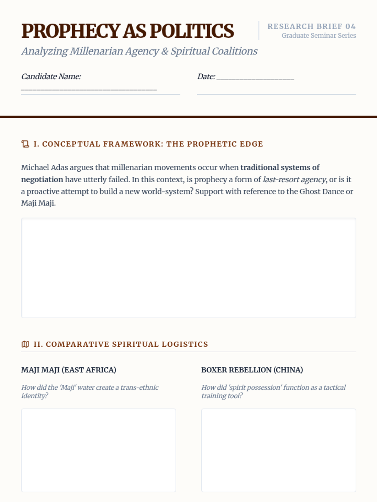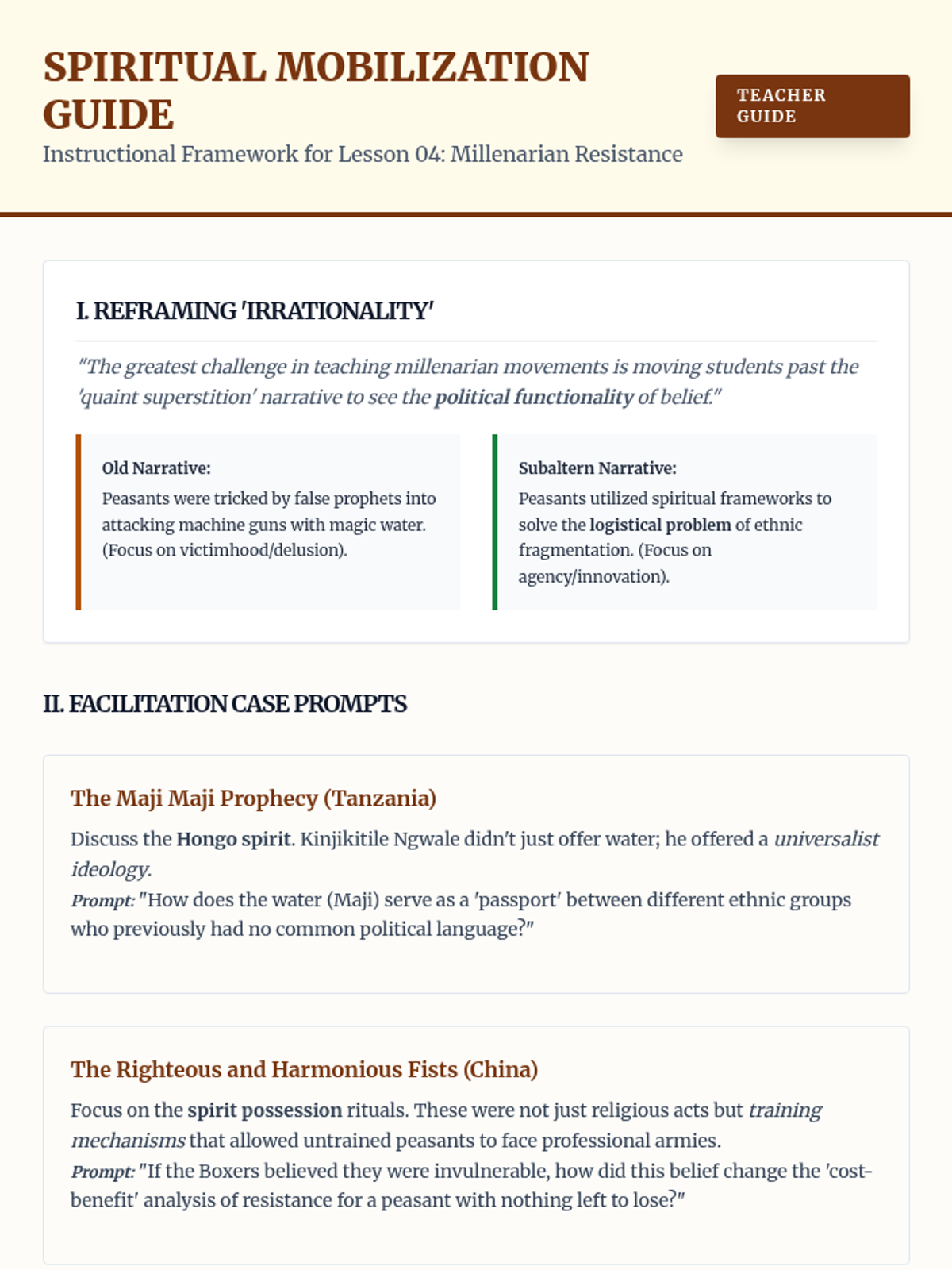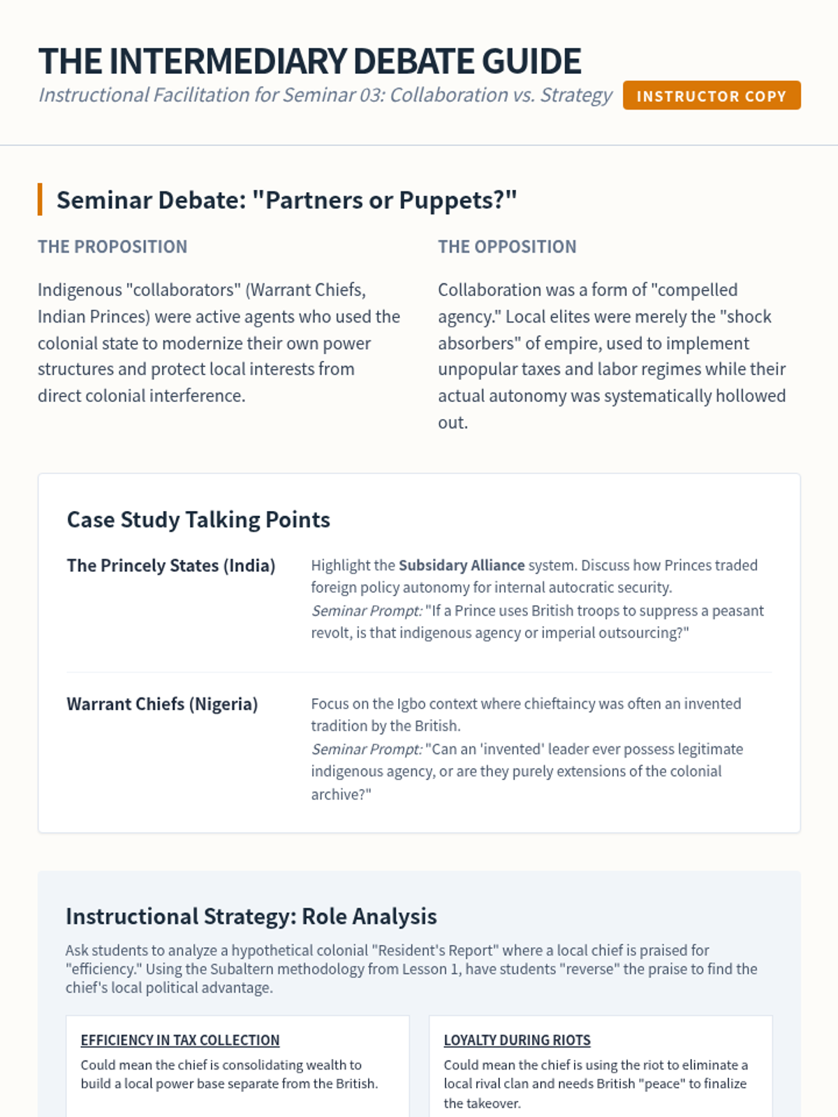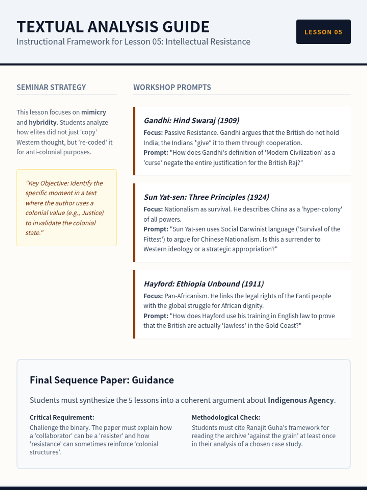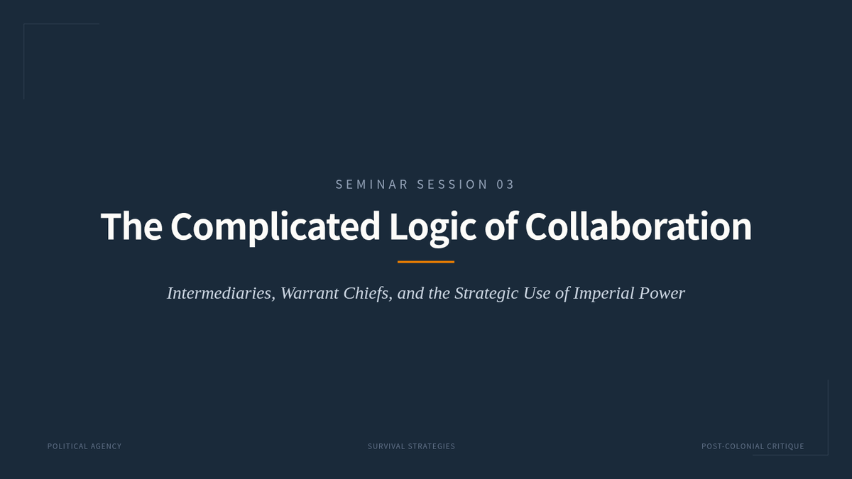 A graduate-level exploration of indigenous agency during the era of imperialism, focusing on the Subaltern Studies framework. Students analyze the spectrum of response to colonial rule, from armed resistance to strategic negotiation, challenging traditional narratives of passive victimization.