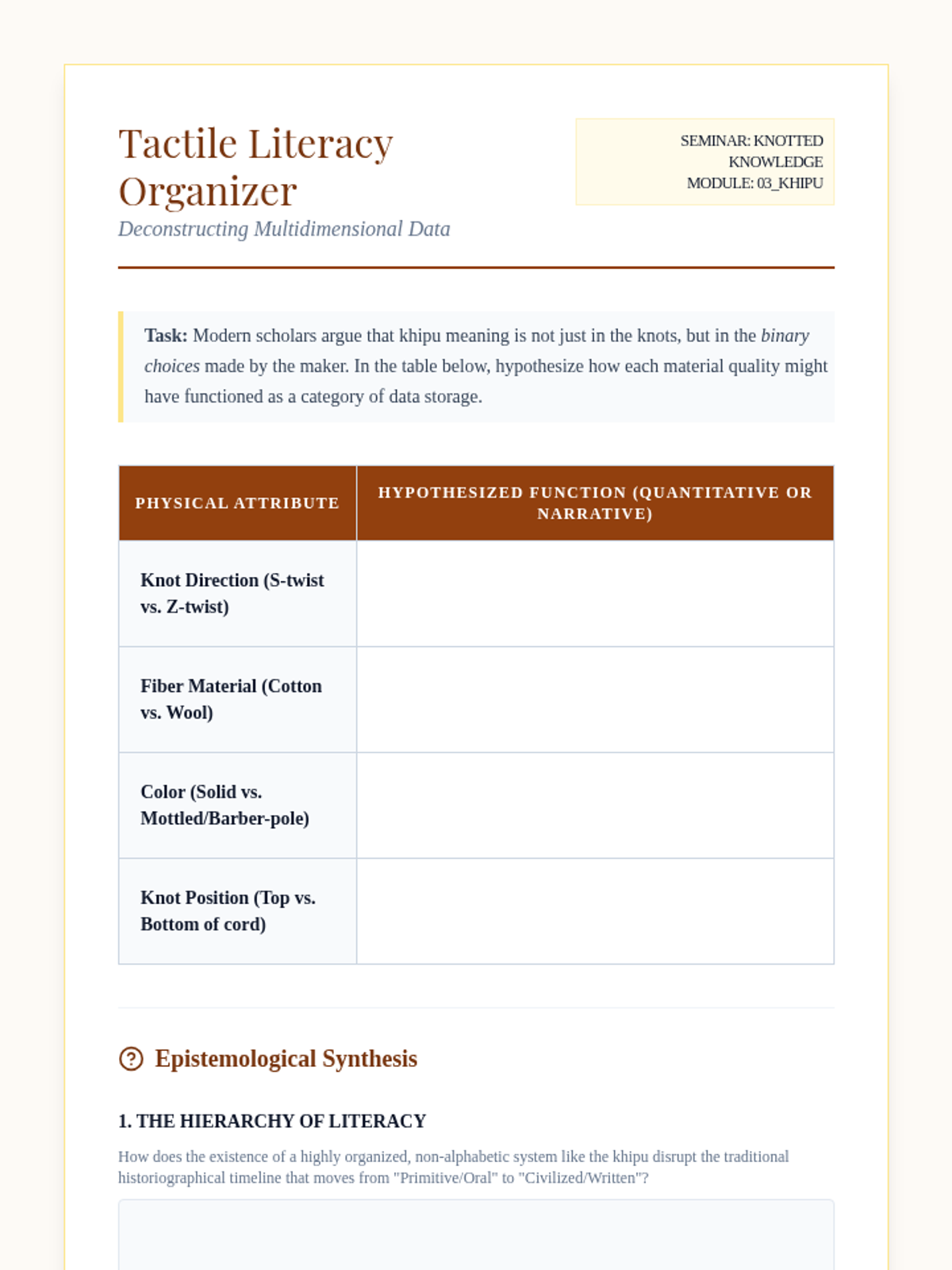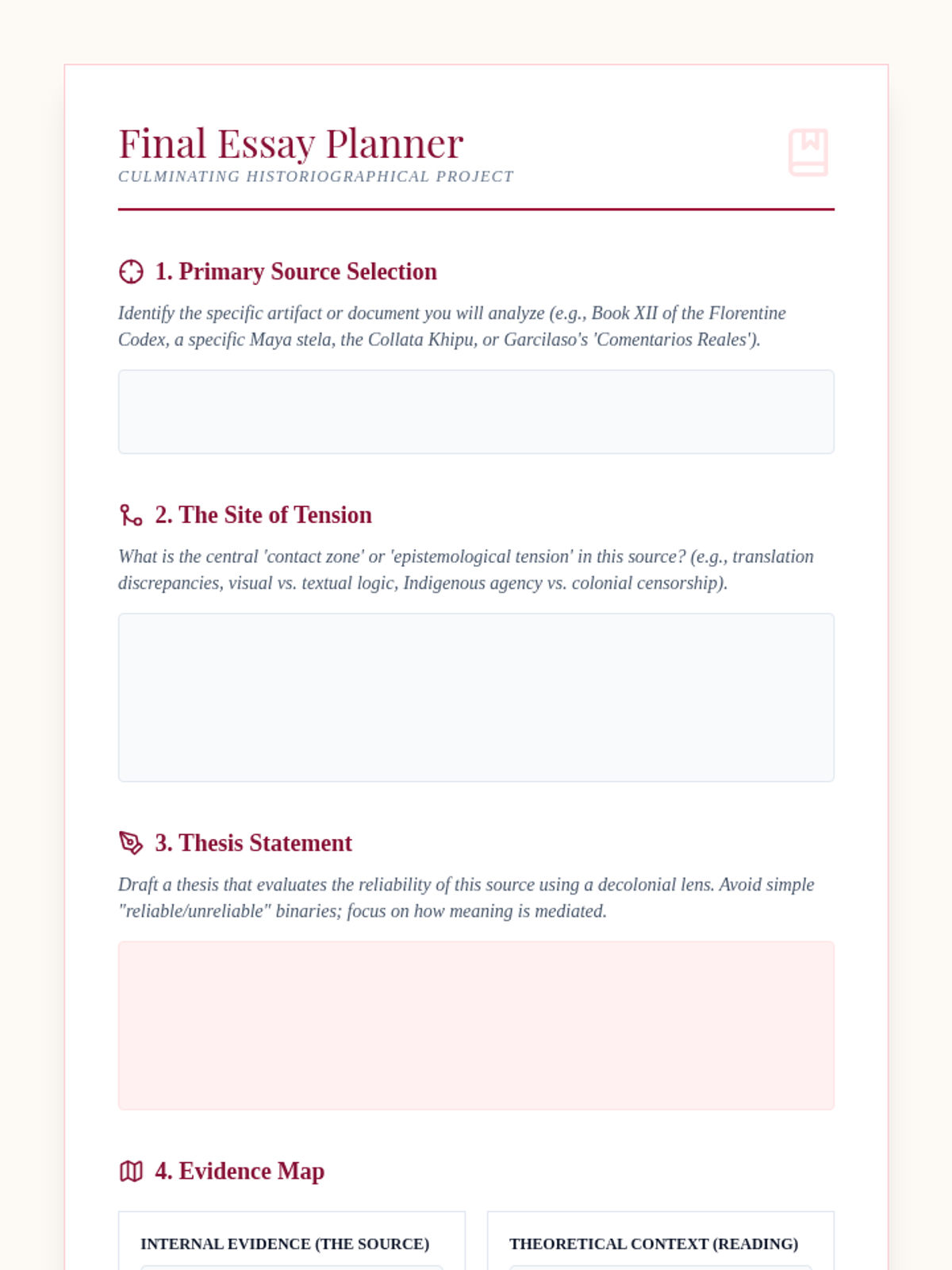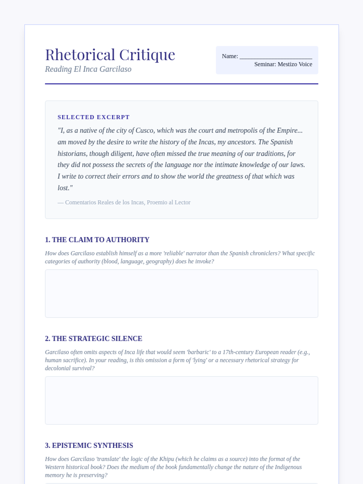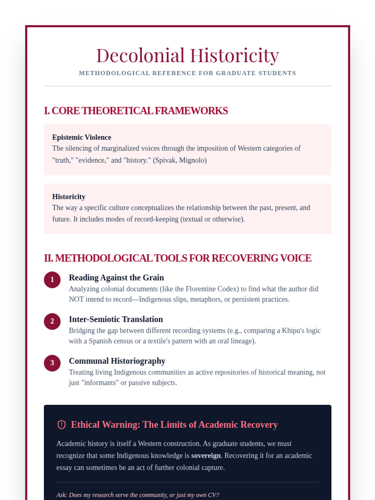 This graduate-level sequence examines the epistemological challenges of reconstructing Indigenous history through colonial archives and material culture. Students critically analyze Spanish chronicles, Maya glyphs, and Inca khipus to develop decolonial historiographical methodologies.