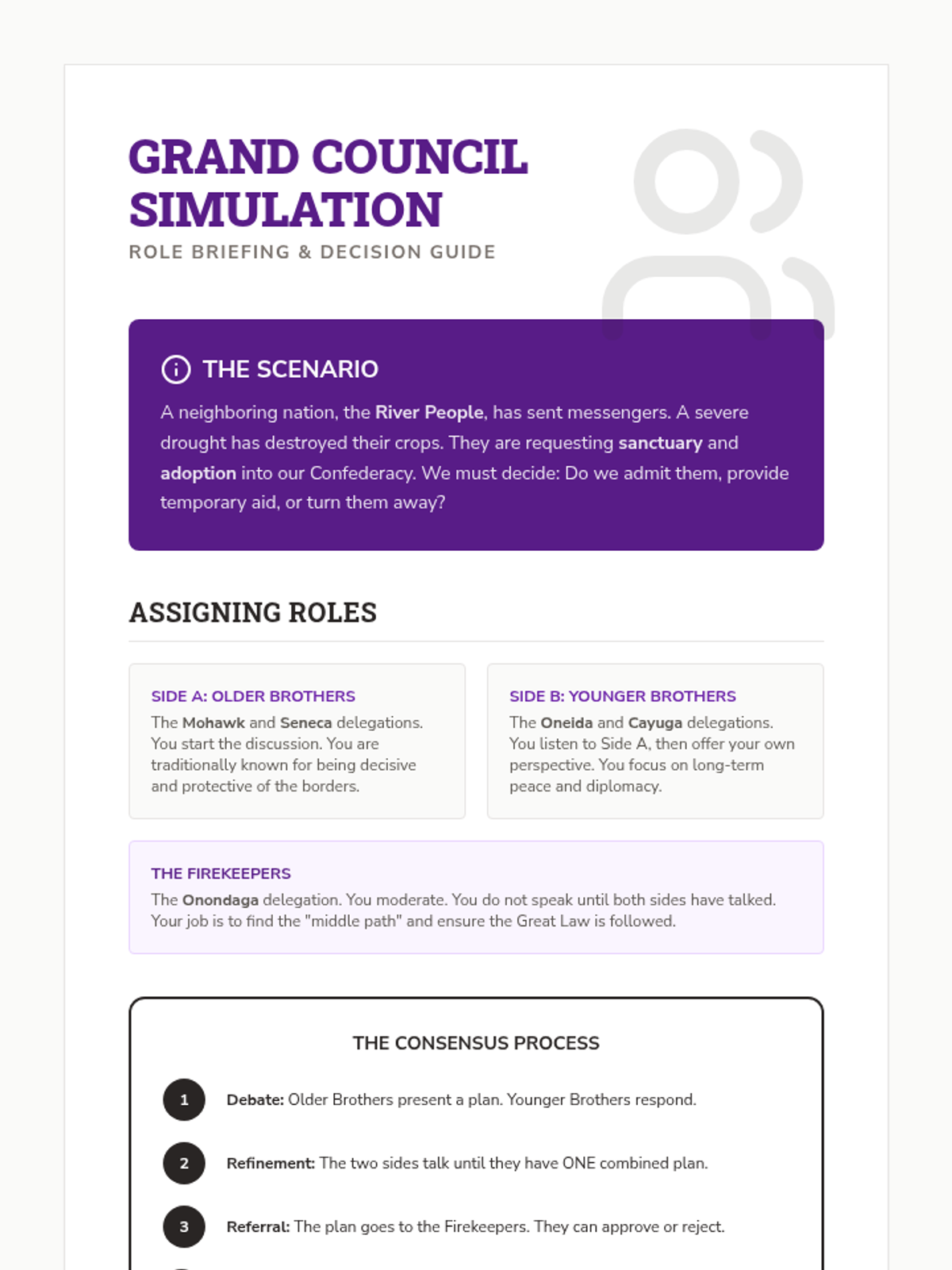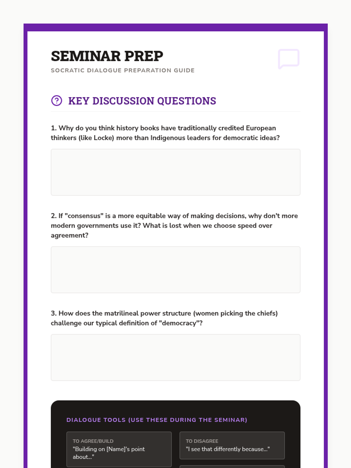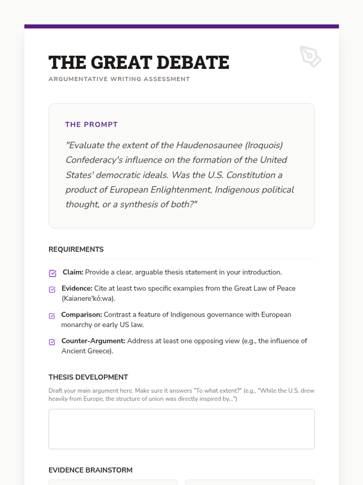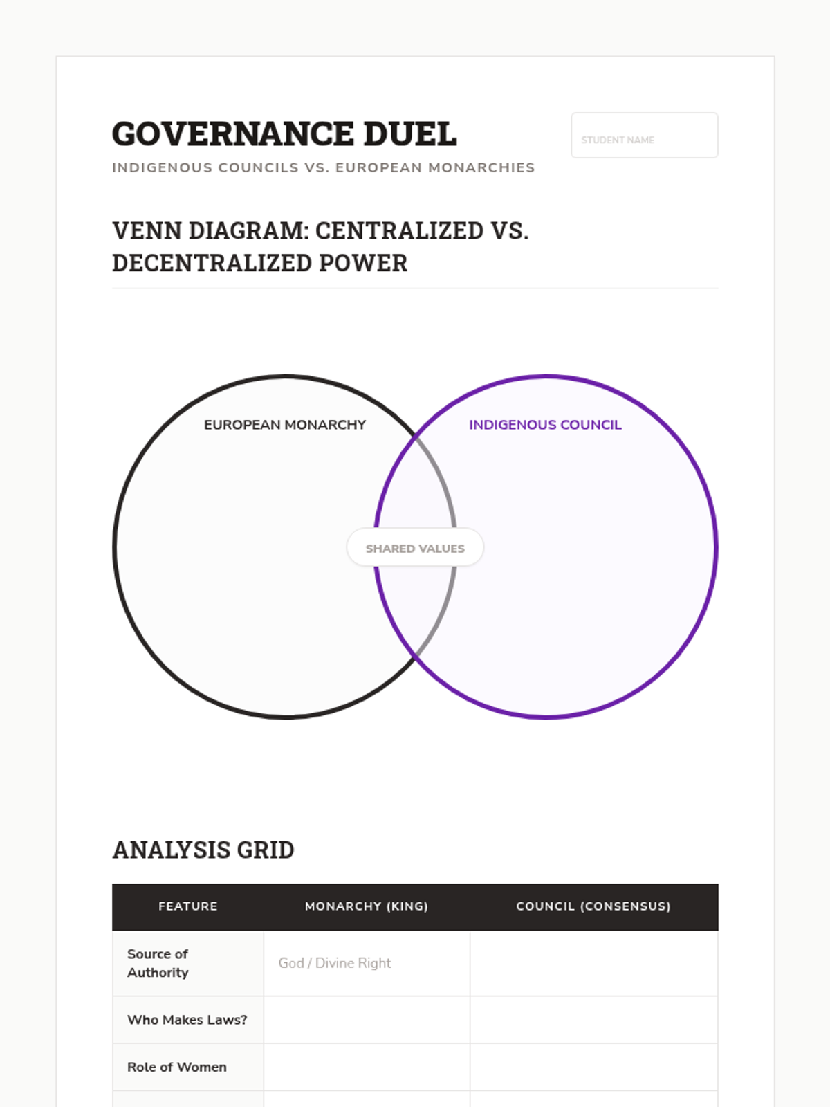 An in-depth exploration of Indigenous political and social systems, focusing on the Haudenosaunee Confederacy's matrilineal structure, the Great Law of Peace, and its influence on modern democratic thought. Students compare these consensus-based models with European monarchies to evaluate the sophistication of Native American governance.
