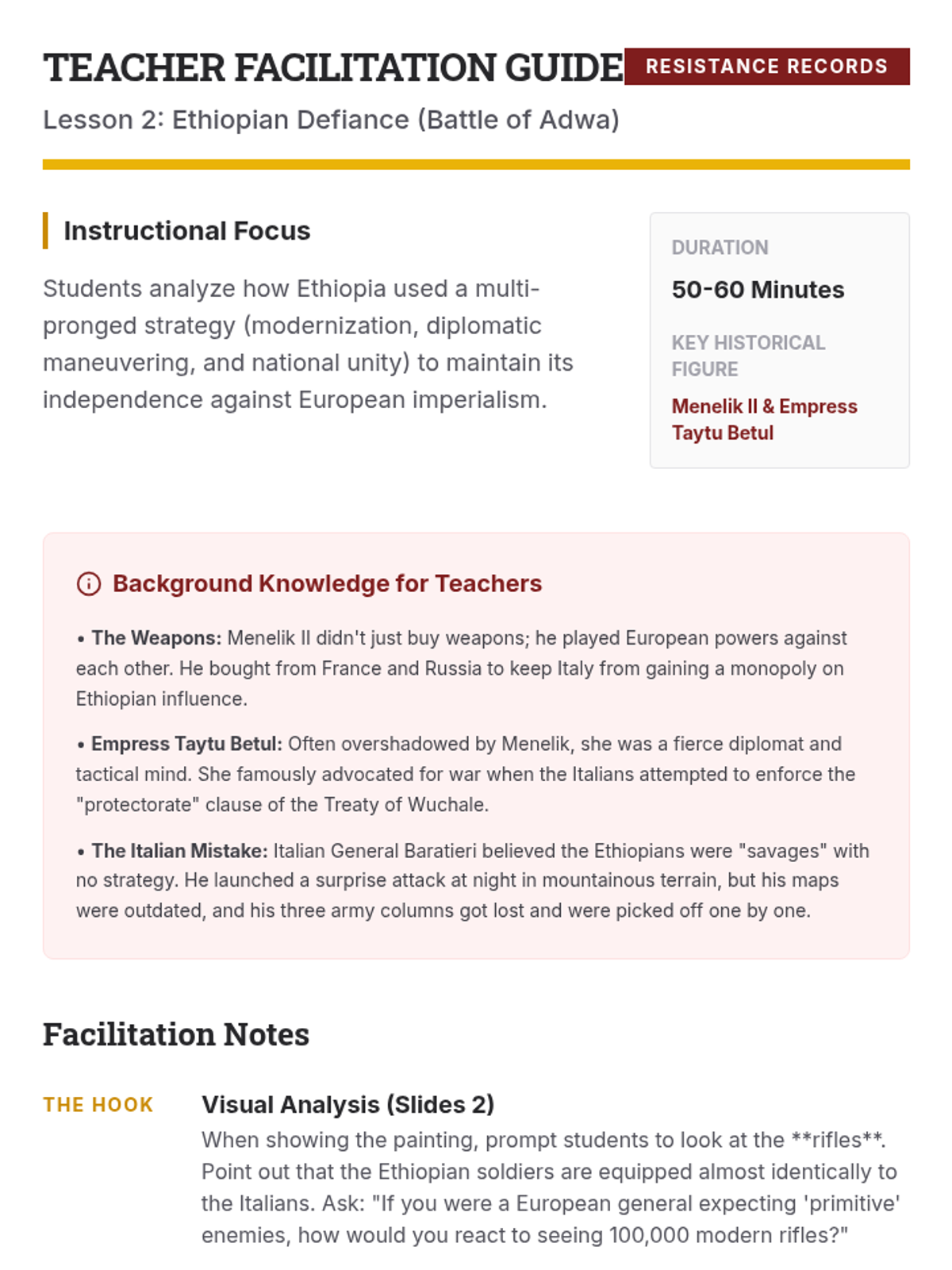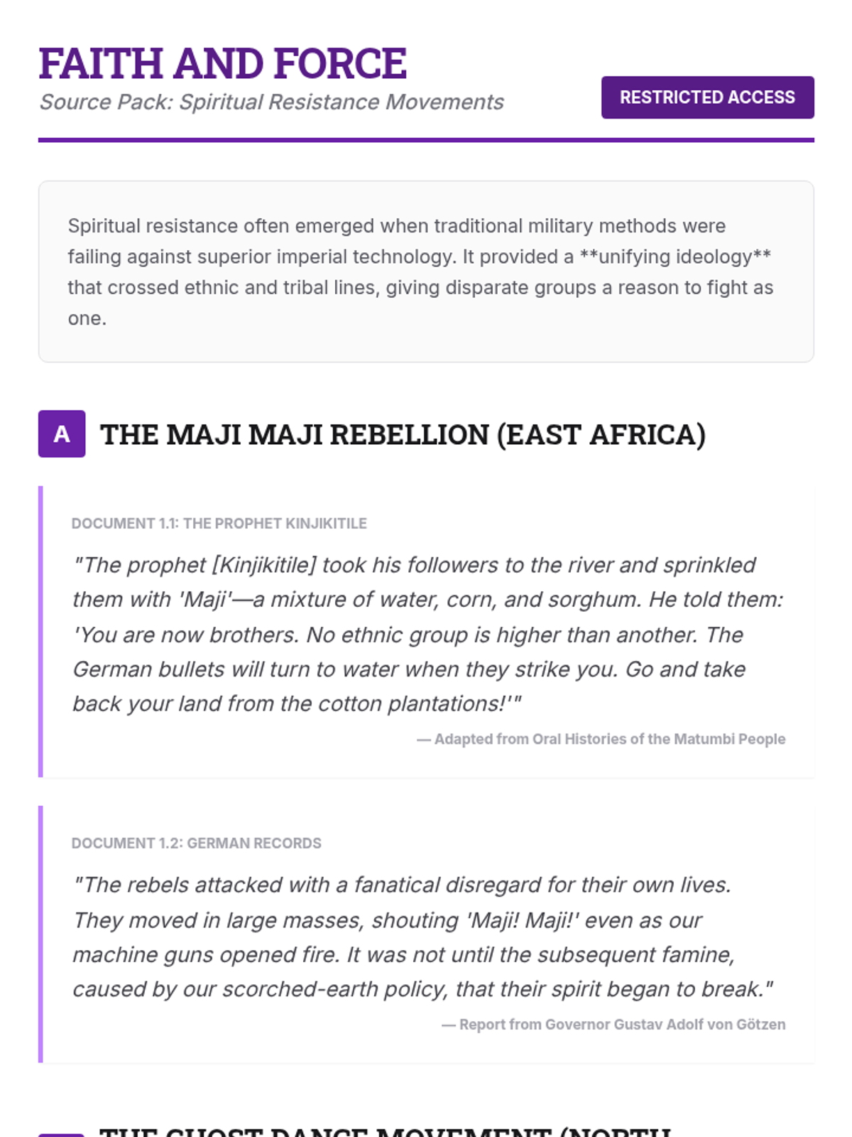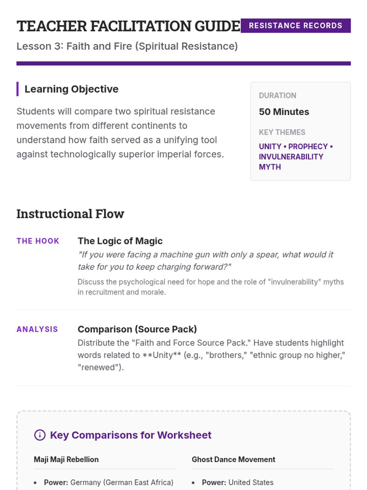 This sequence shifts the focus of imperial history from European expansion to Indigenous agency, exploring how various leaders and movements across Africa, Asia, and the Americas resisted colonial control through military, diplomatic, spiritual, and intellectual means. Students analyze case studies like the Battle of Adwa and the Maji Maji Rebellion to challenge narratives of passive victimhood.