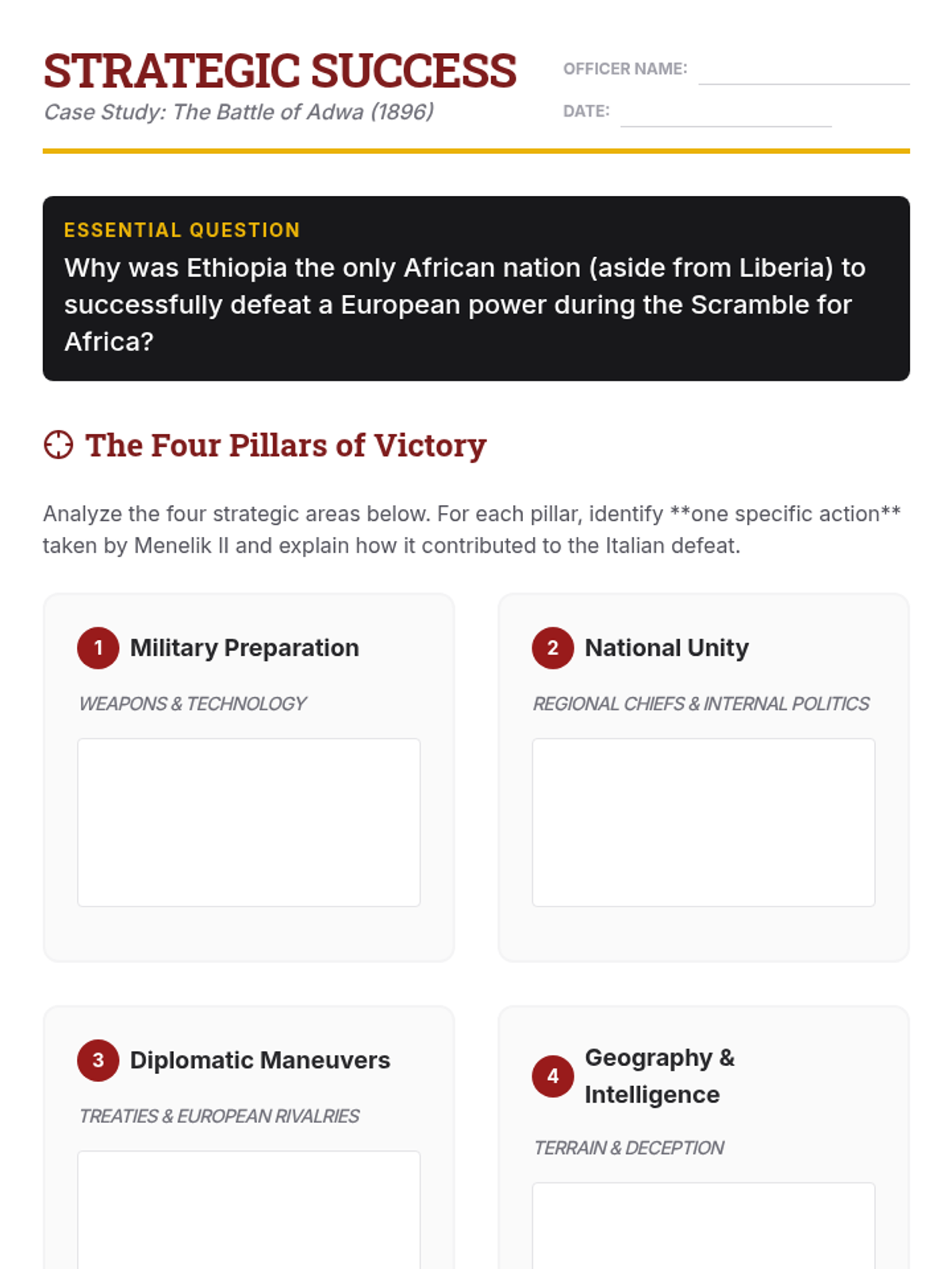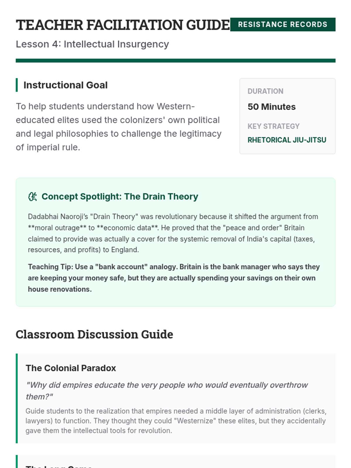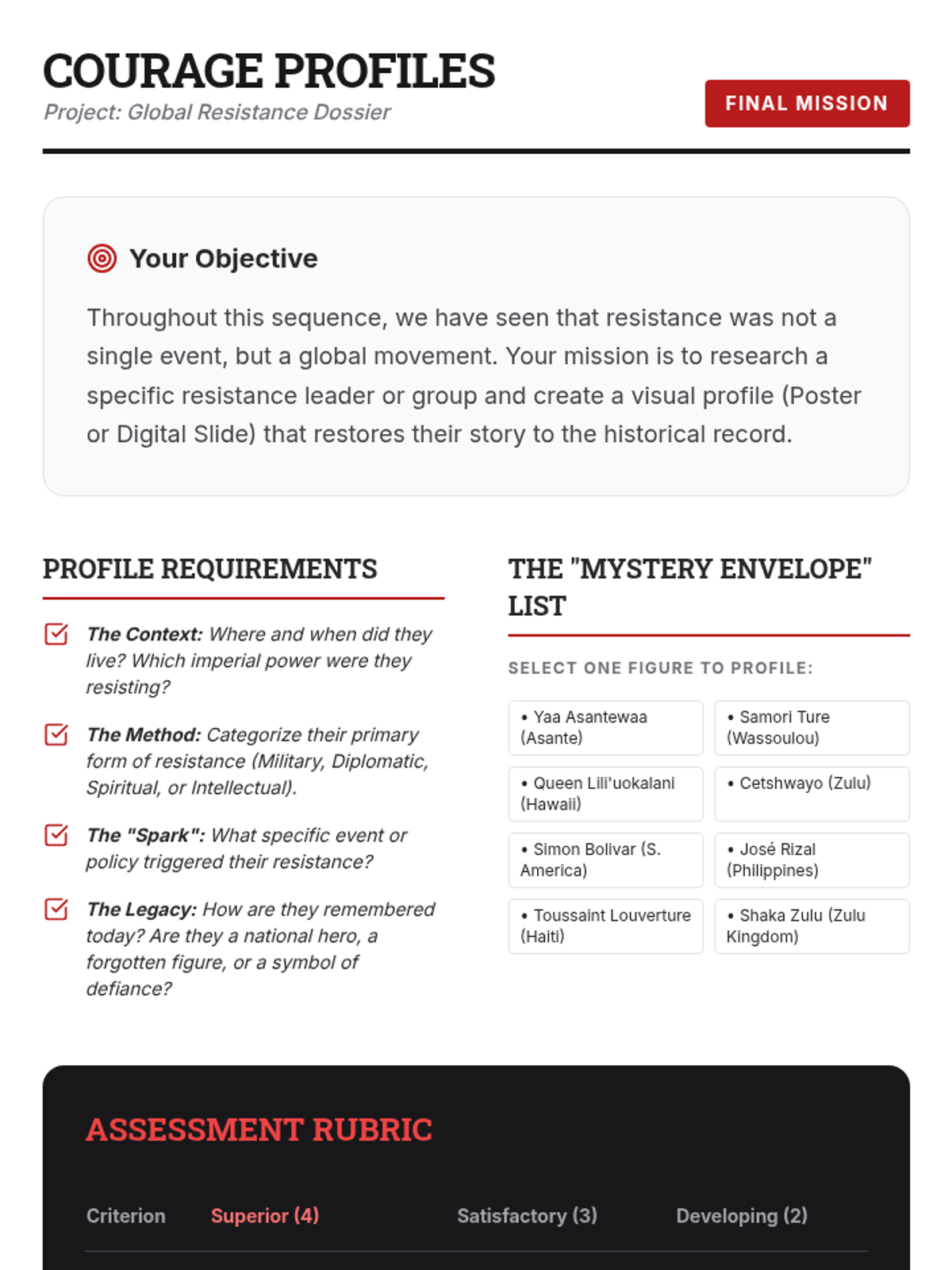 This sequence shifts the focus of imperial history from European expansion to Indigenous agency, exploring how various leaders and movements across Africa, Asia, and the Americas resisted colonial control through military, diplomatic, spiritual, and intellectual means. Students analyze case studies like the Battle of Adwa and the Maji Maji Rebellion to challenge narratives of passive victimhood.