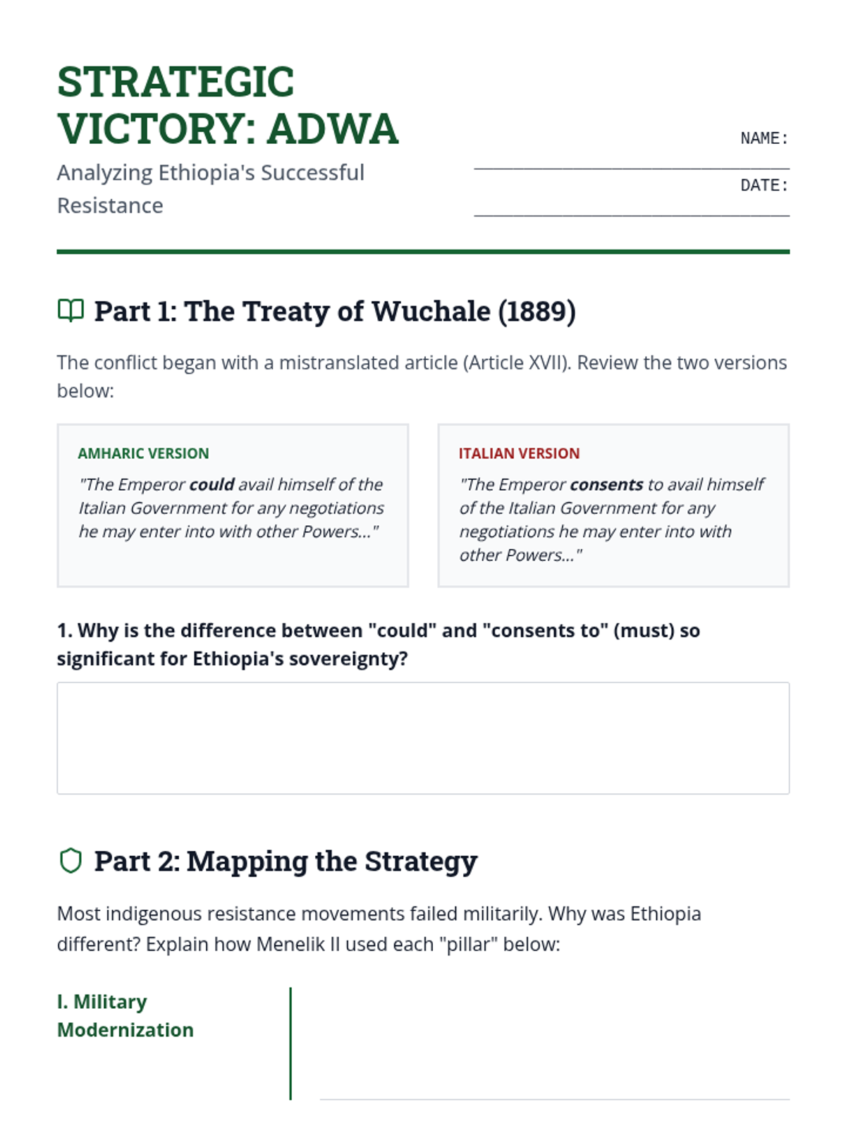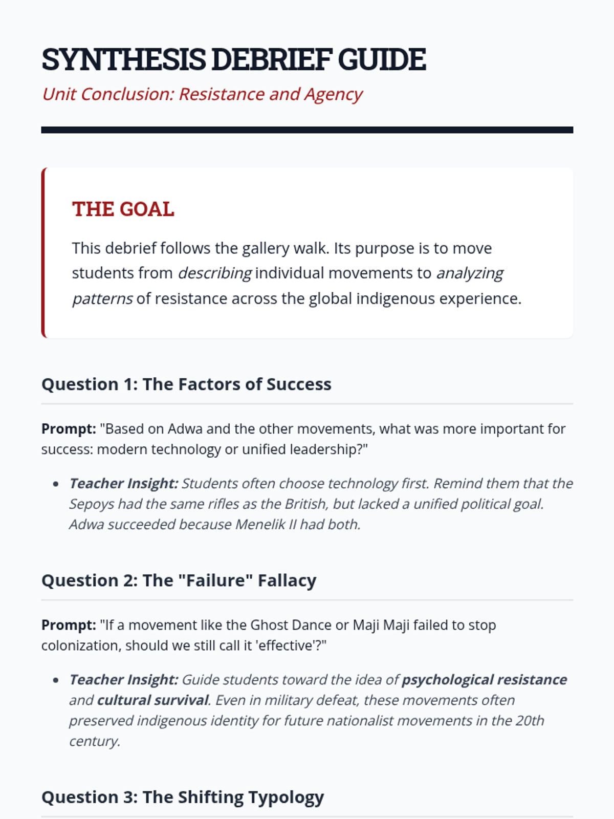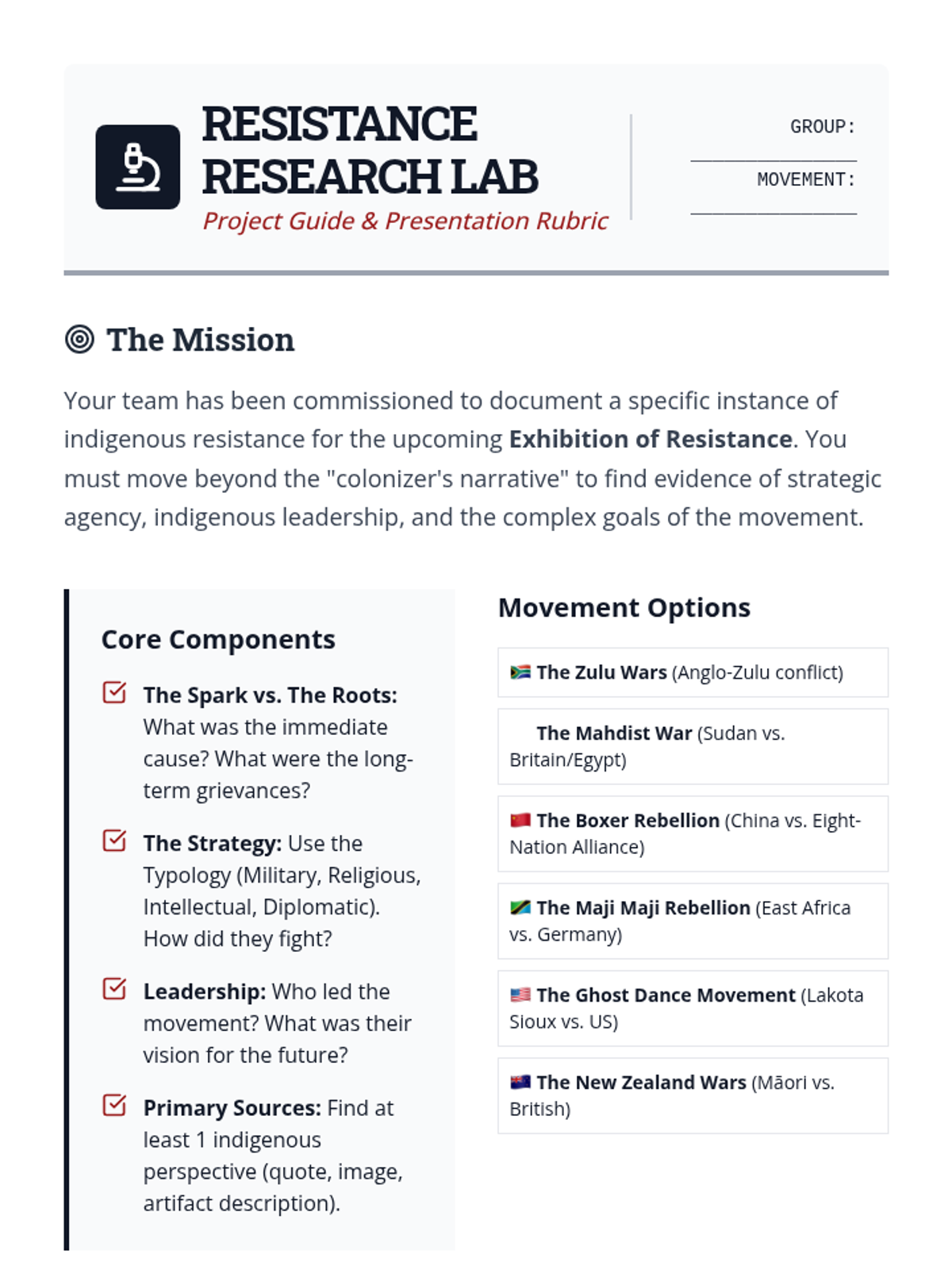 A project-based unit exploring the diverse ways indigenous peoples resisted European imperialism. Students analyze military, religious, and intellectual resistance, culminating in a research exhibition that highlights agency and strategic action.