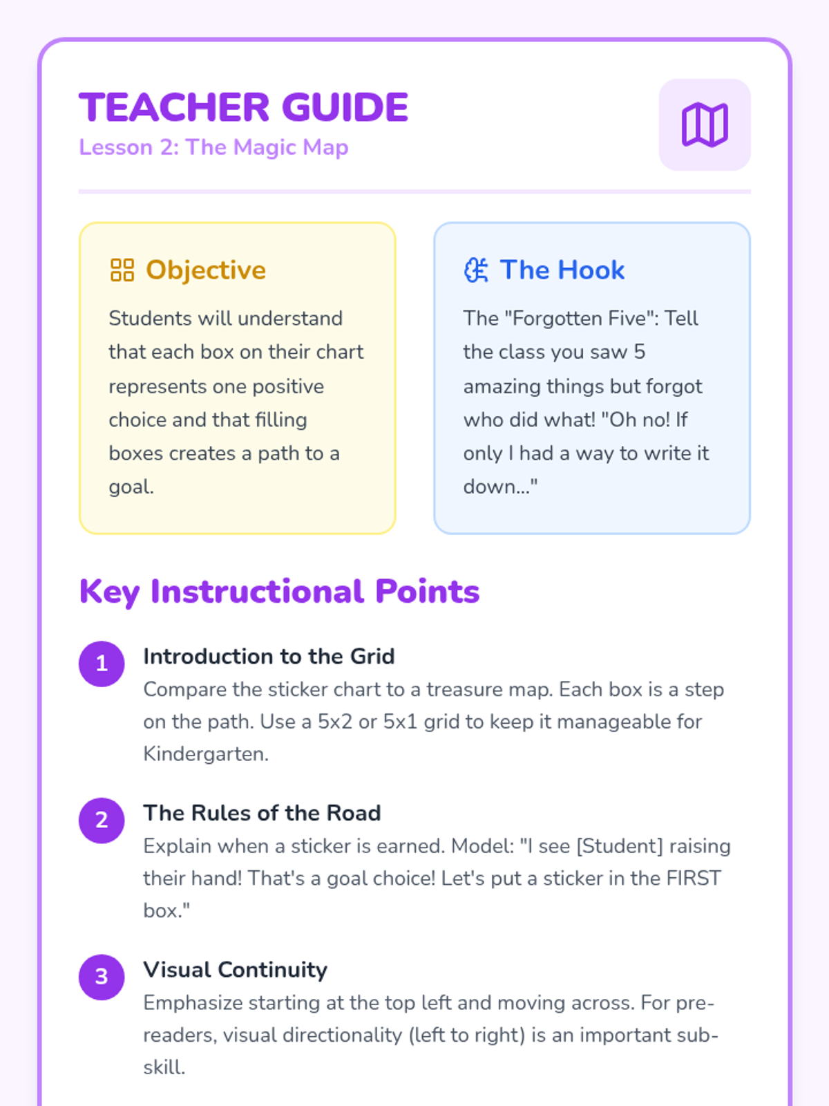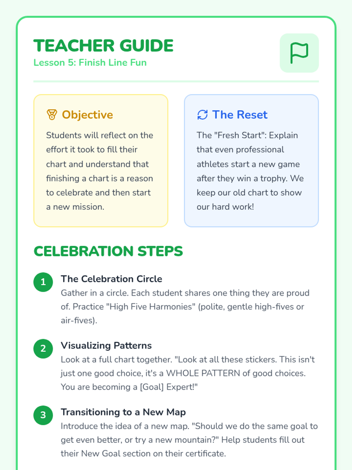 A sequence for Kindergarten students focused on the mechanics of individual positive reinforcement systems. Students learn to set simple goals, use visual tracking tools like sticker charts, practice self-monitoring, and understand the value of patience and consistent effort.