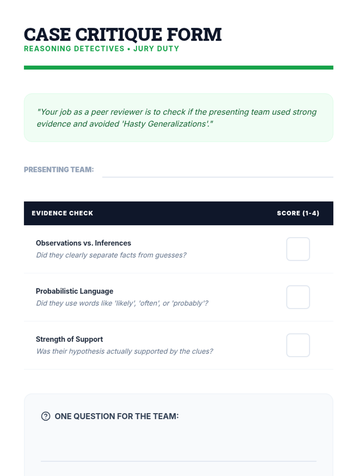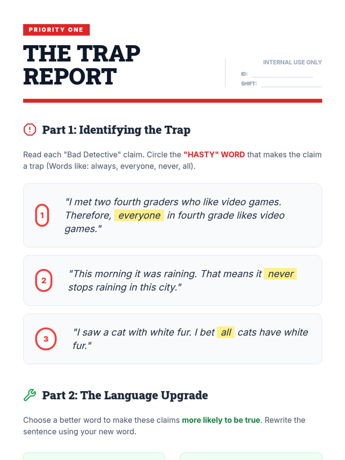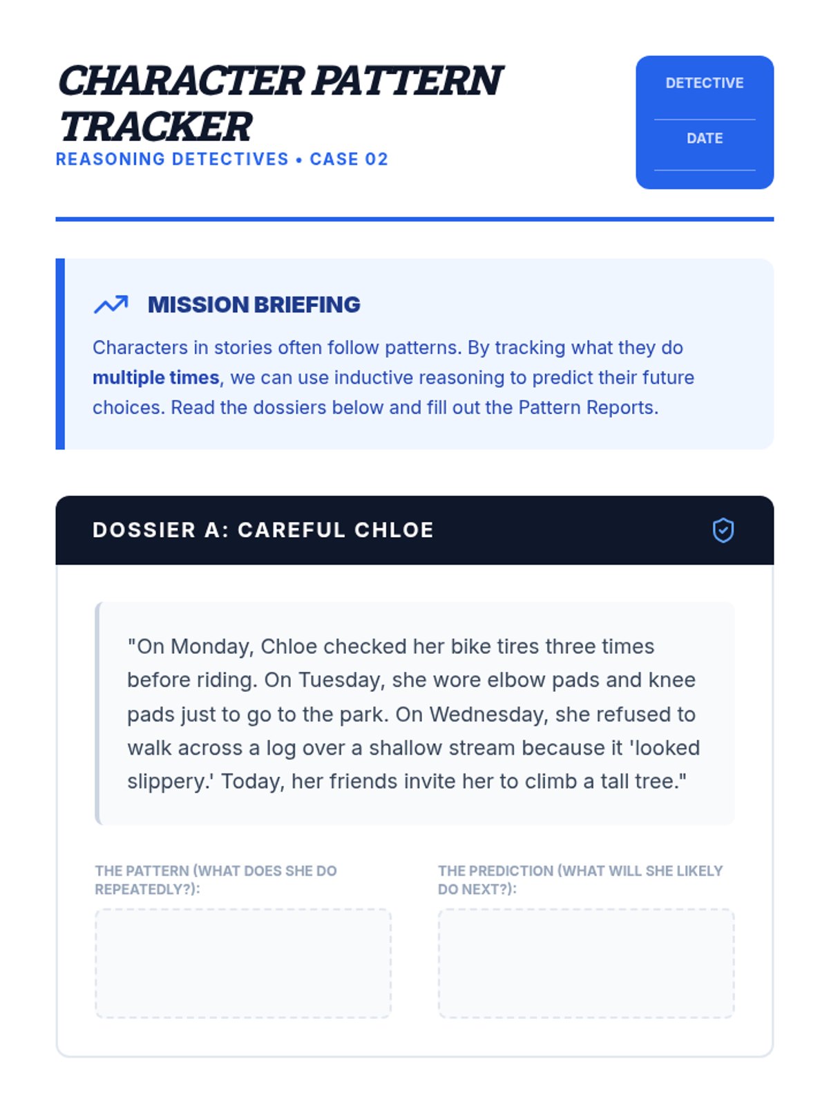 A 4th-grade ELA sequence focused on inductive reasoning, where students progress from making simple observations to constructing complex hypotheses based on evidence patterns. Through a detective-themed lens, students learn to differentiate between what they see and what they think, avoid hasty generalizations, and use probabilistic language to defend their conclusions.