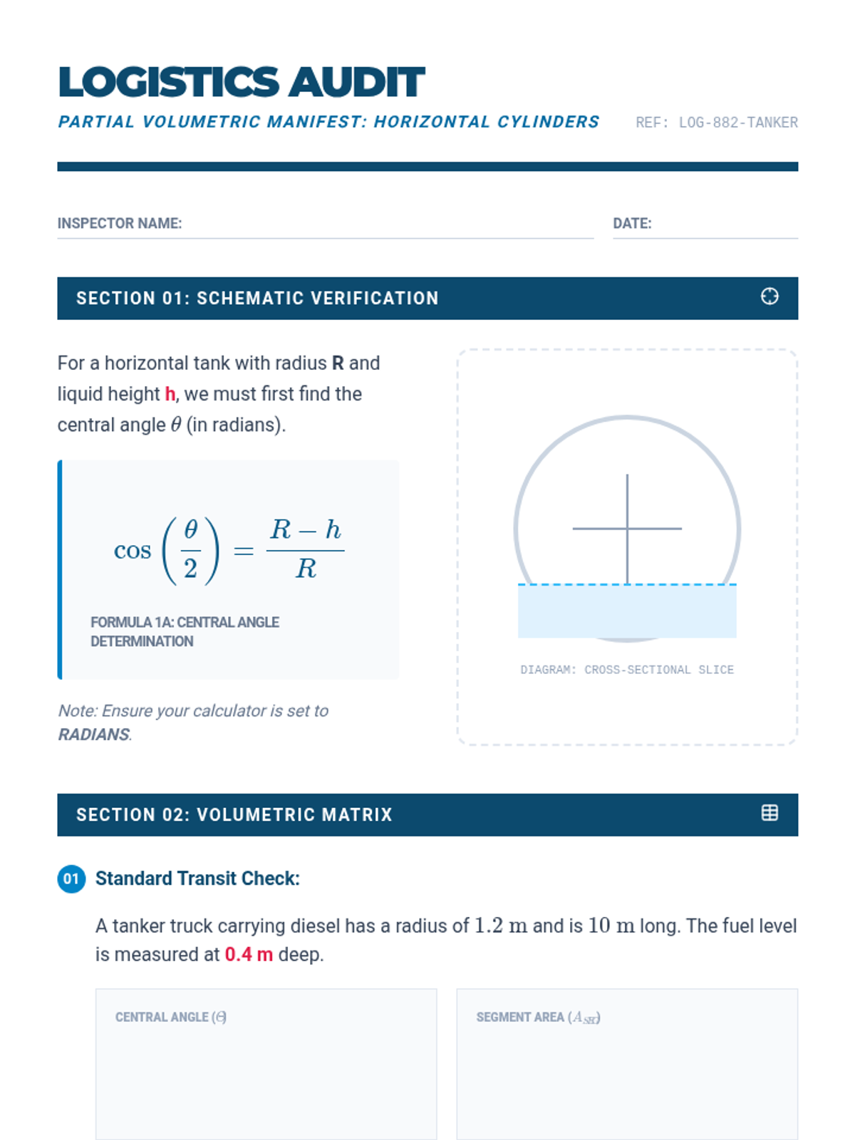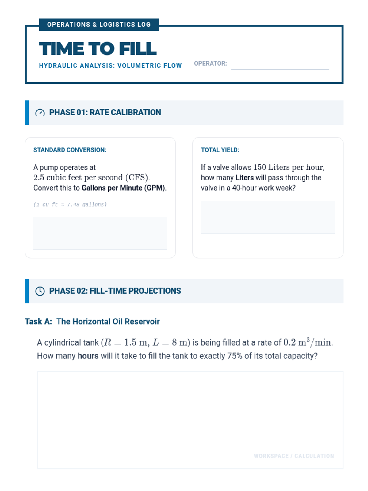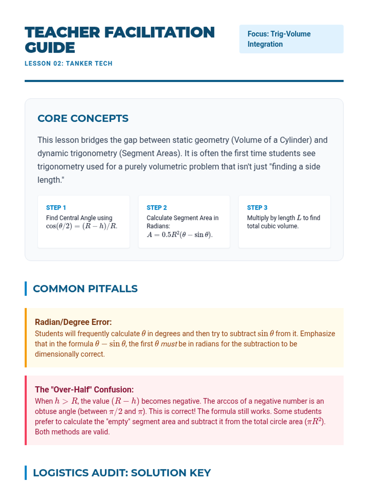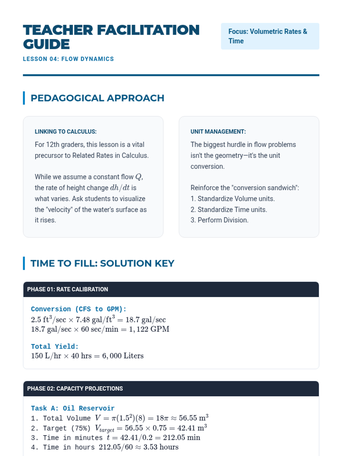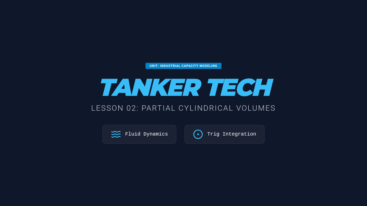 An advanced geometry sequence focusing on industrial applications of volume, including frustums, partial cylindrical volumes, displacement, and flow rates. Students integrate trigonometry and calculus-adjacent concepts to solve real-world engineering challenges.