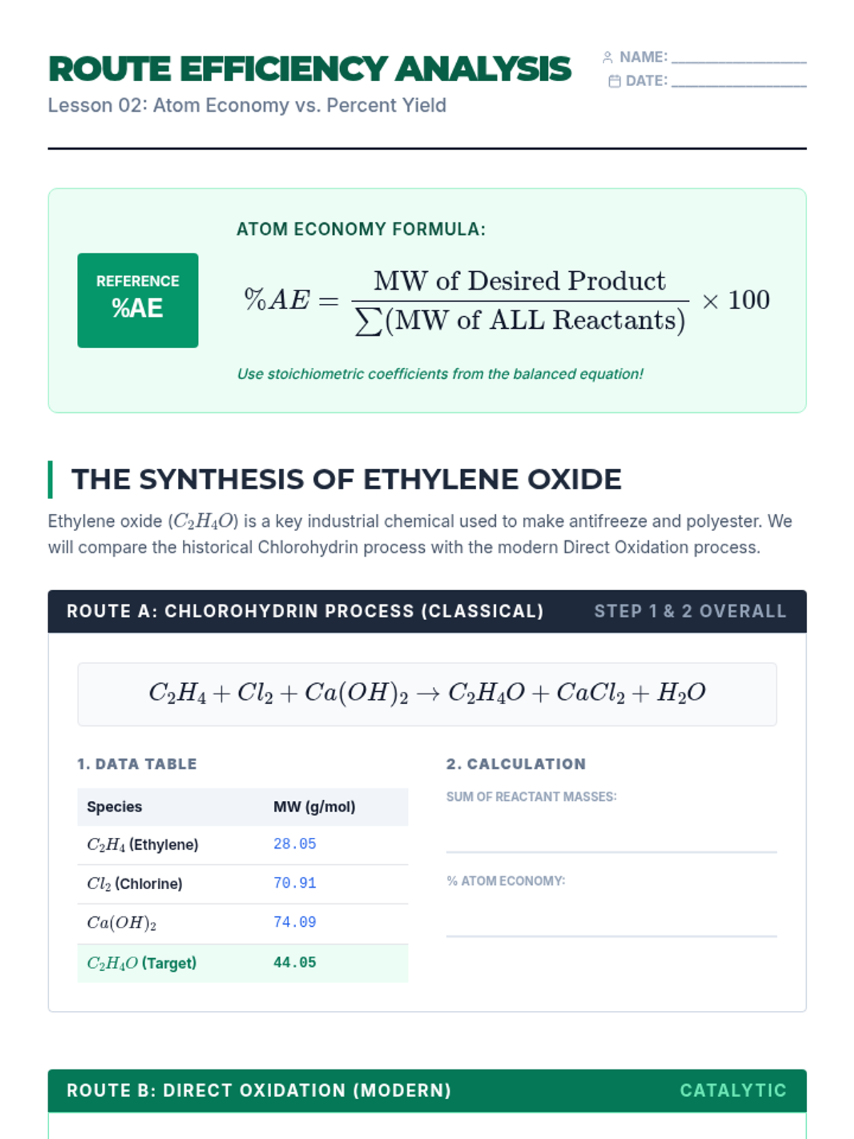 A comprehensive undergraduate chemistry sequence focusing on the intersection of stoichiometric principles, industrial scaling, economic optimization, and green chemistry metrics. Students move from laboratory calculations to large-scale process design, evaluating efficiency through atom economy and E-factor analysis.
