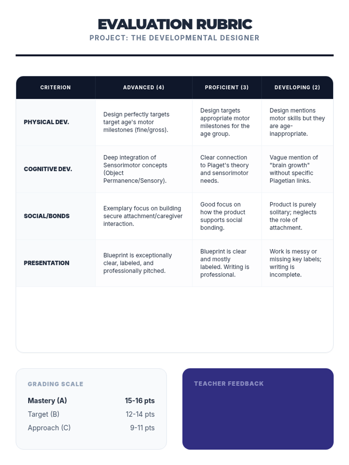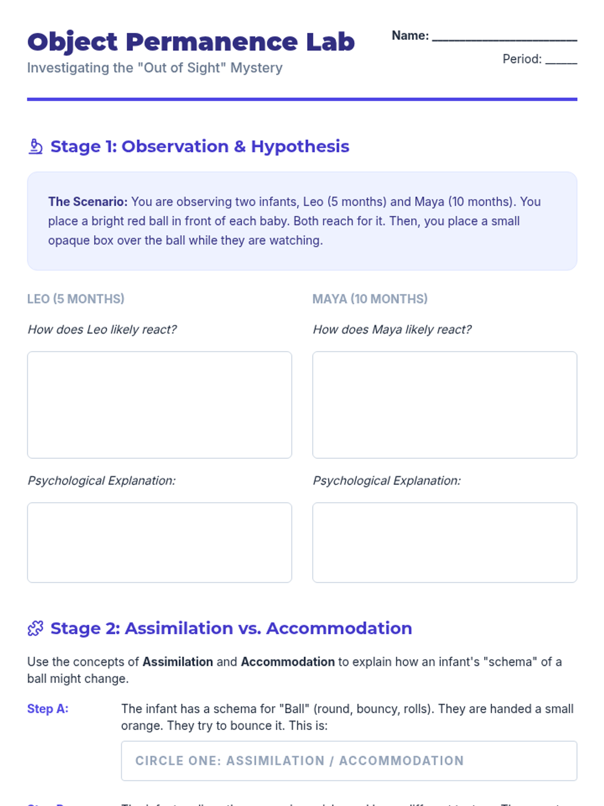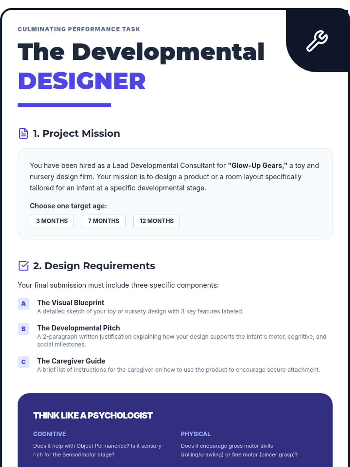 A comprehensive 9th Grade Psychology unit exploring the physical, cognitive, and social development of infants during their first year of life. Students investigate developmental milestones, Piaget's theories, attachment styles, and language acquisition, culminating in a project where they design developmentally appropriate tools for infants.