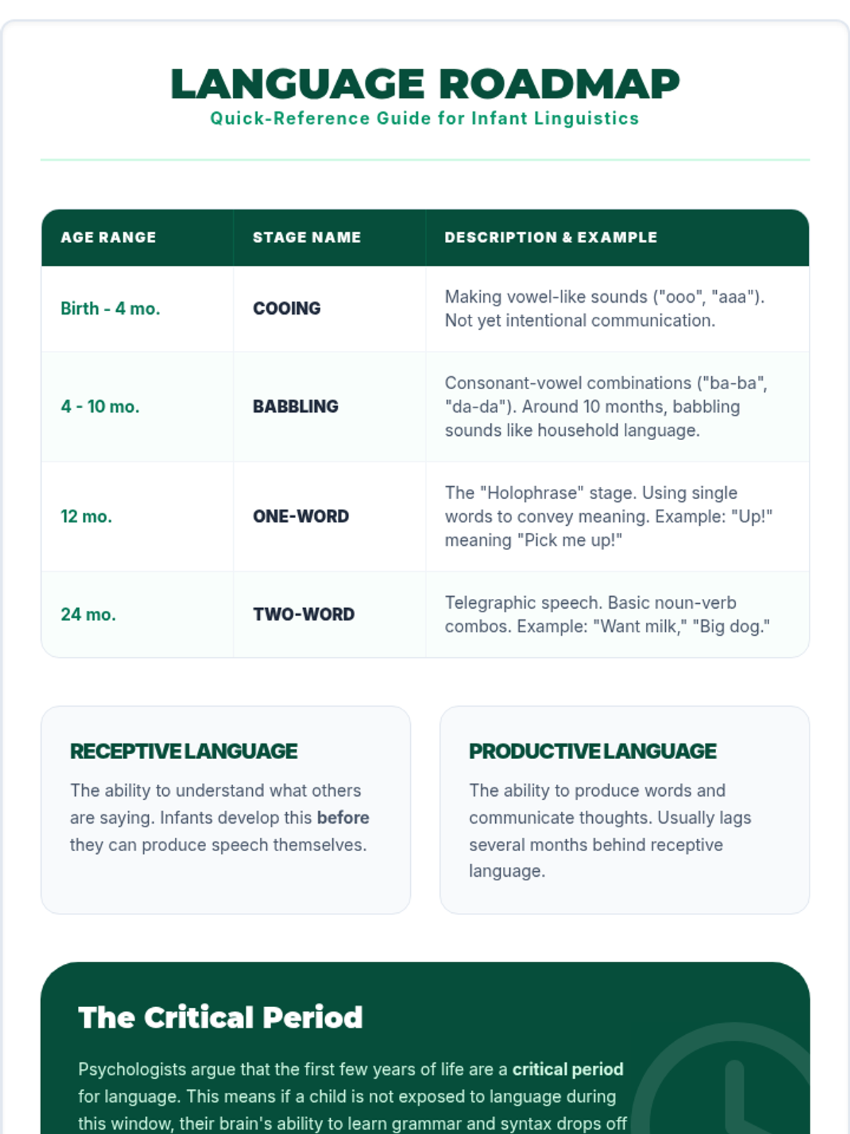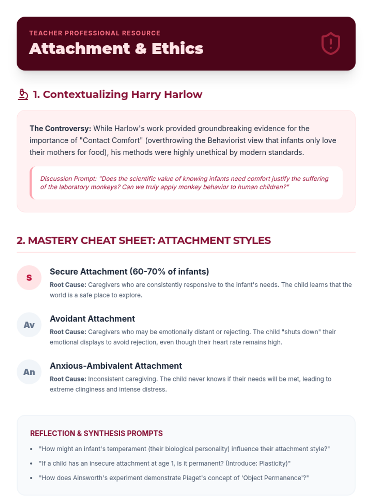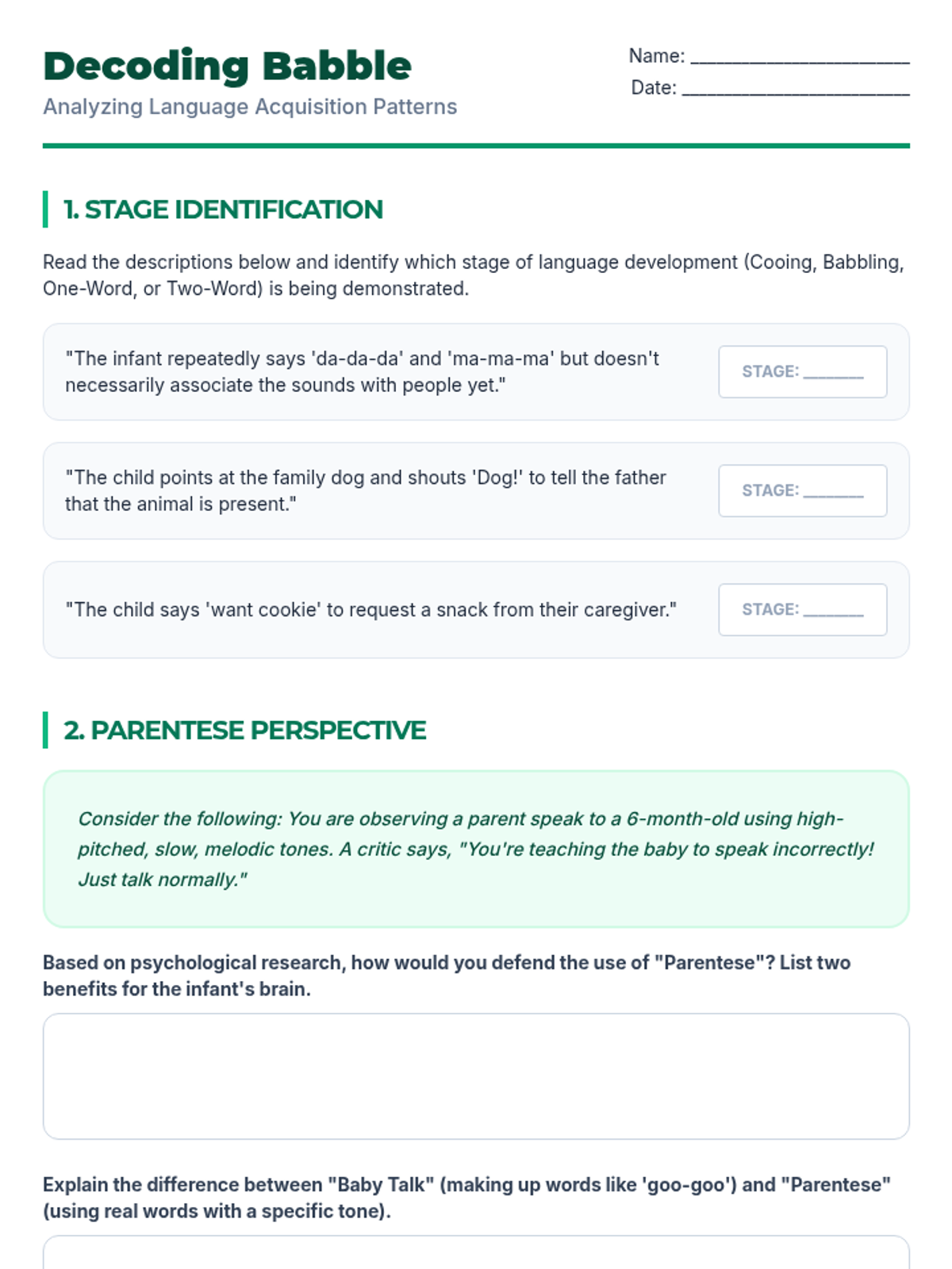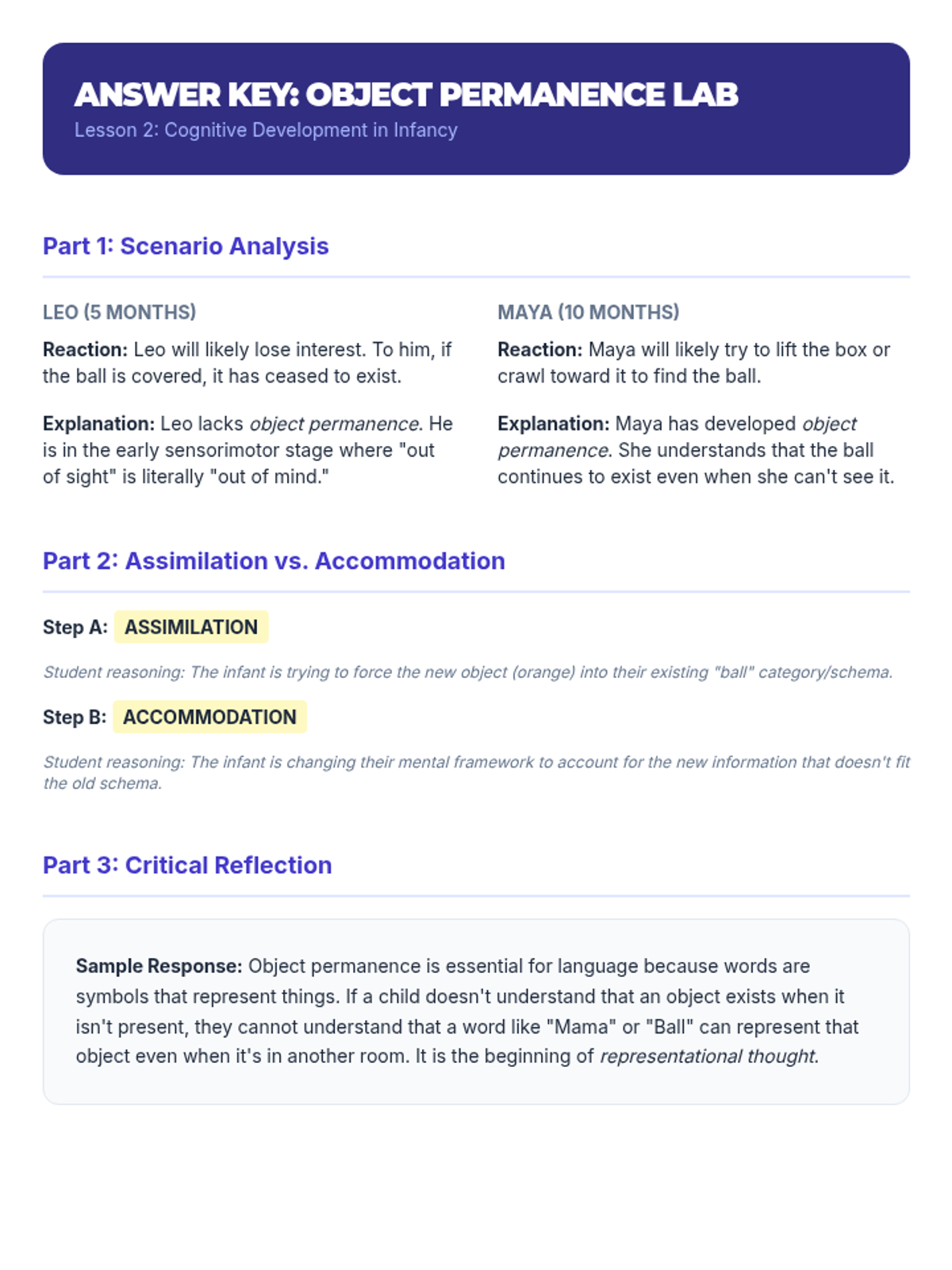 A comprehensive 9th Grade Psychology unit exploring the physical, cognitive, and social development of infants during their first year of life. Students investigate developmental milestones, Piaget's theories, attachment styles, and language acquisition, culminating in a project where they design developmentally appropriate tools for infants.