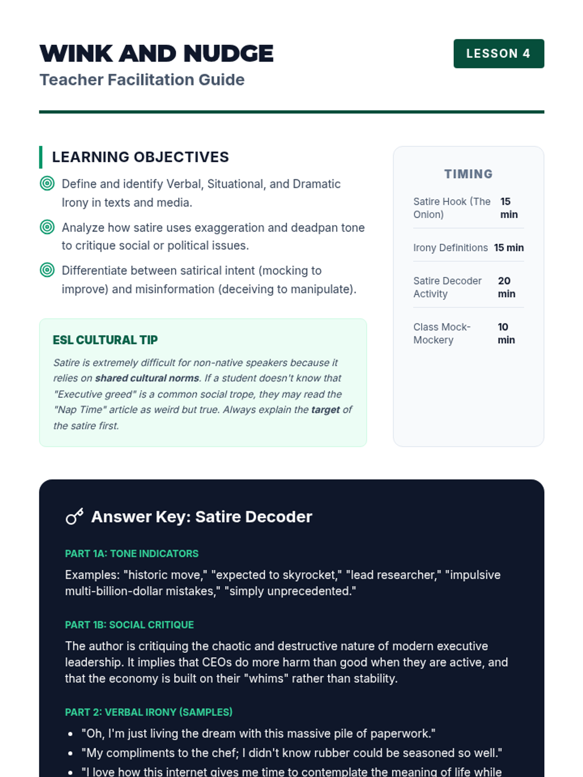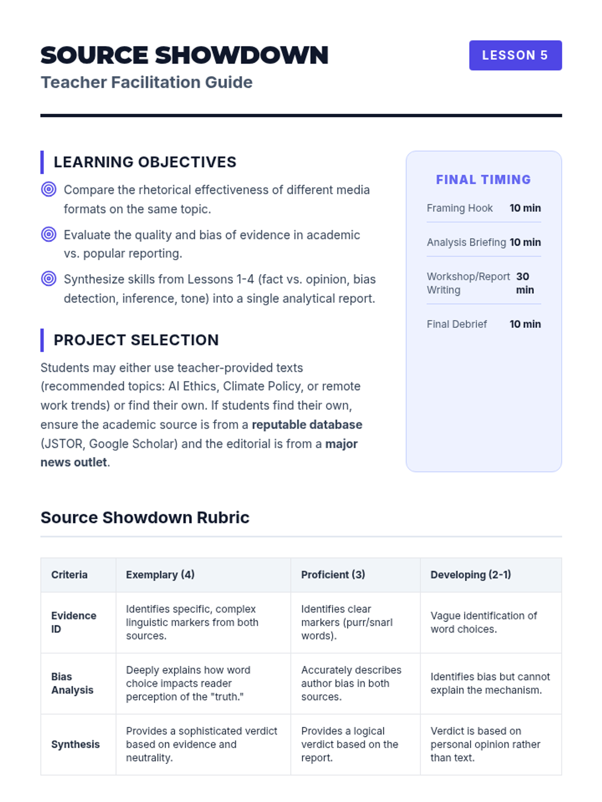 A comprehensive sequence for graduate ESL students focusing on critical reading, tone analysis, and identifying bias in academic and journalistic texts. Students progress from basic fact-checking to sophisticated analysis of irony and comparative source evaluation.