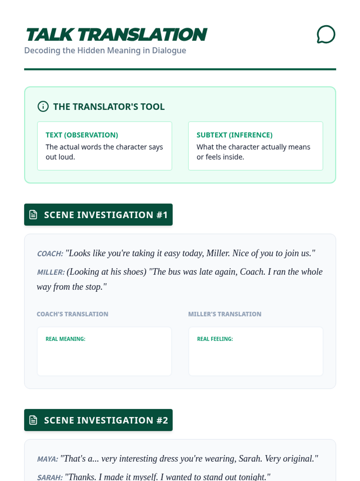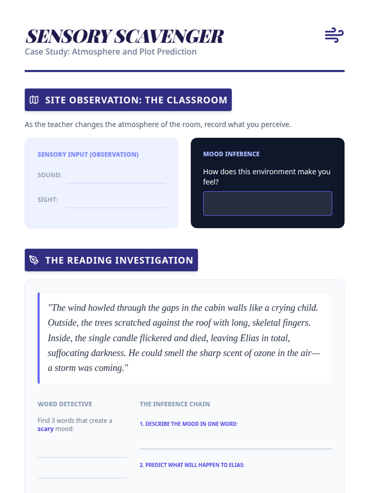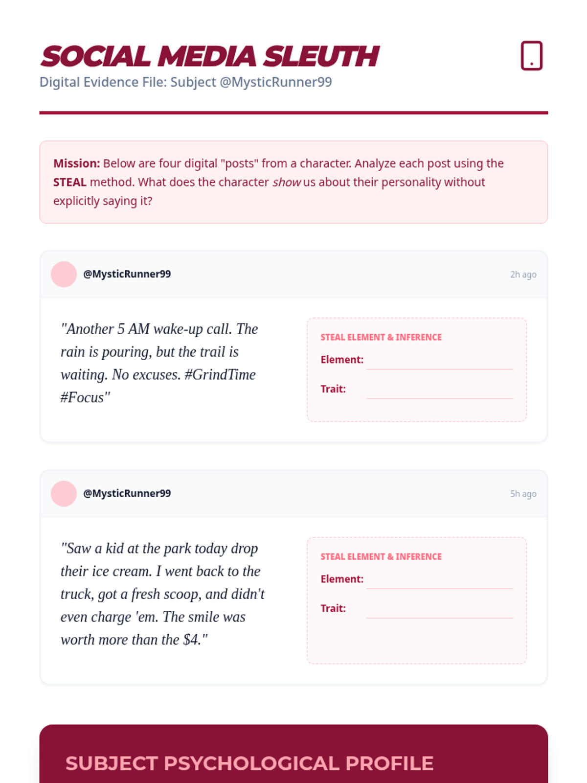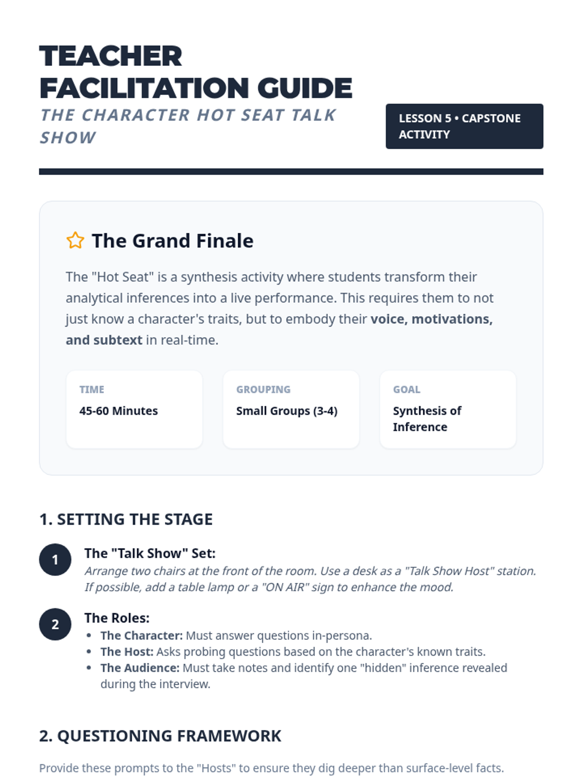 This 5-lesson sequence for 7th grade intermediate English learners focuses on the critical skill of inferring meaning in fiction. Students progress from basic visual inference to complex character analysis using the STEAL method, exploring setting/mood, and decoding subtext in dialogue, culminating in a character interview simulation.