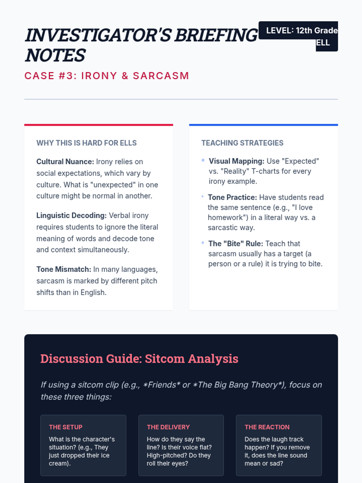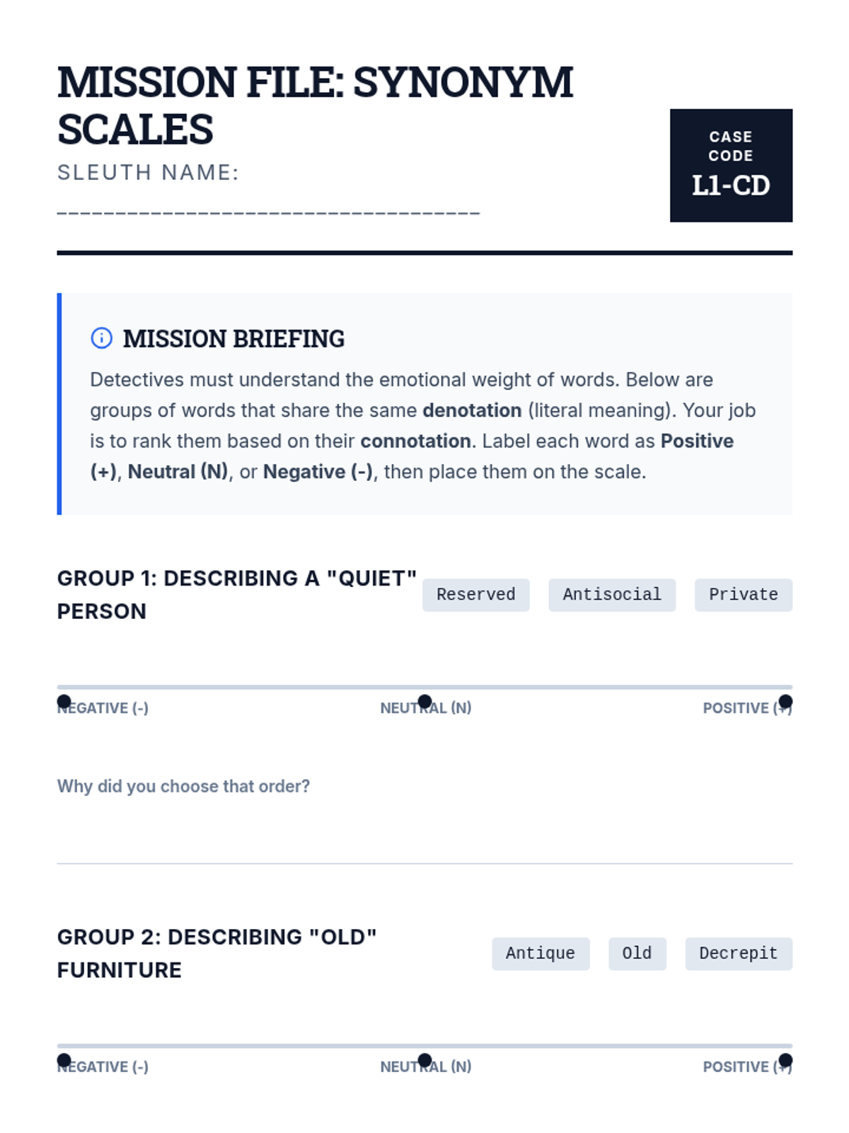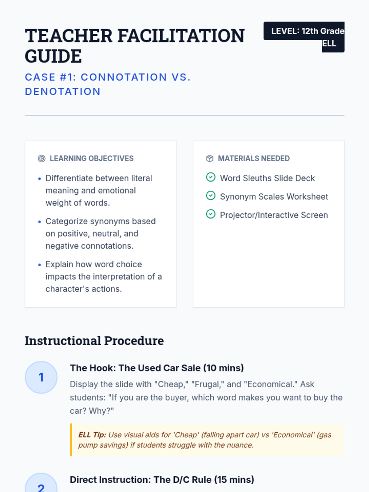 A comprehensive sequence for 12th-grade ELL students focused on identifying implicit meaning, analyzing character motivations, and understanding the emotional architecture of fiction through tone and mood. Students progress from word-level connotation to thematic synthesis using a detective-themed 'Word Sleuth' framework.