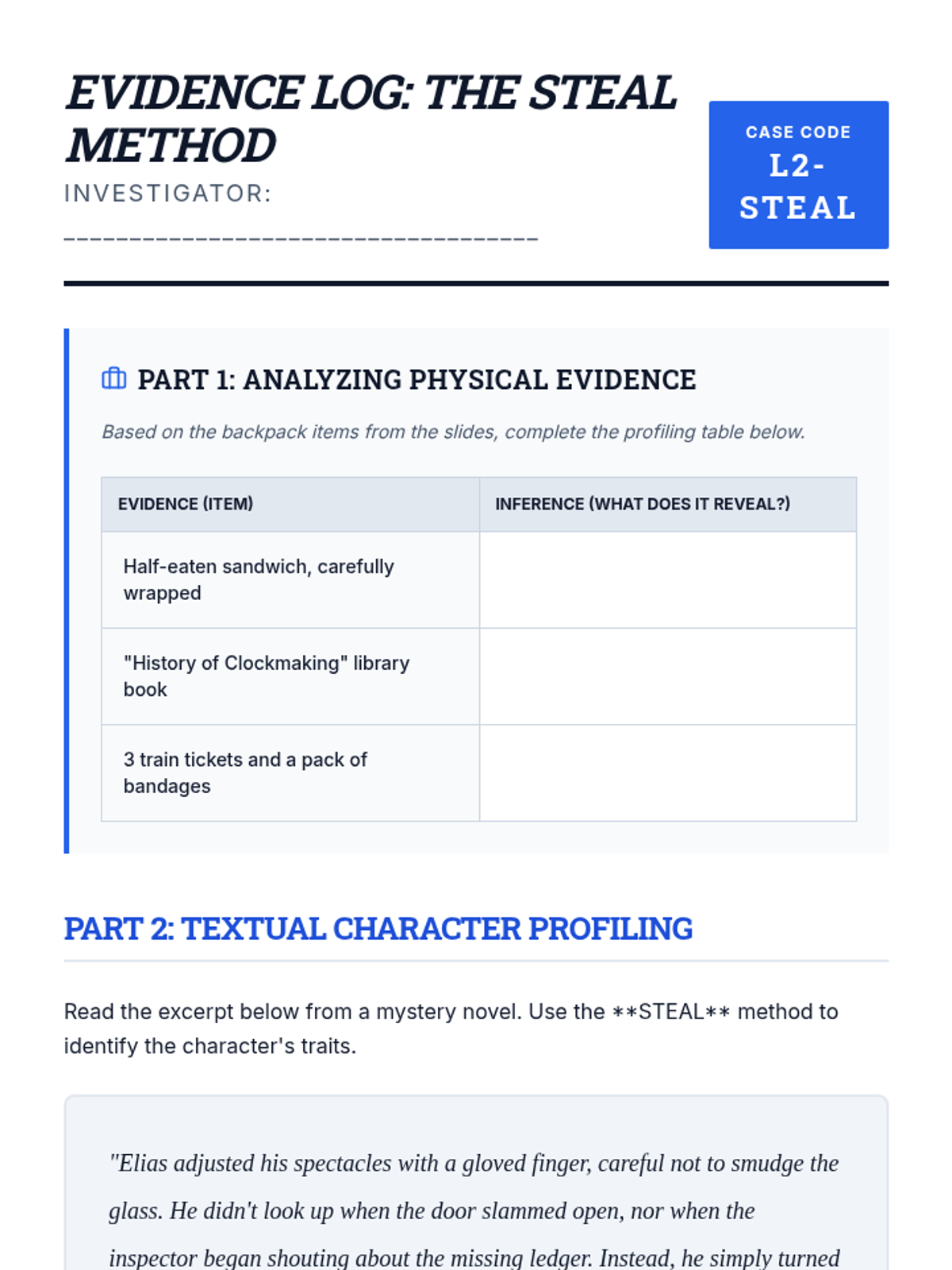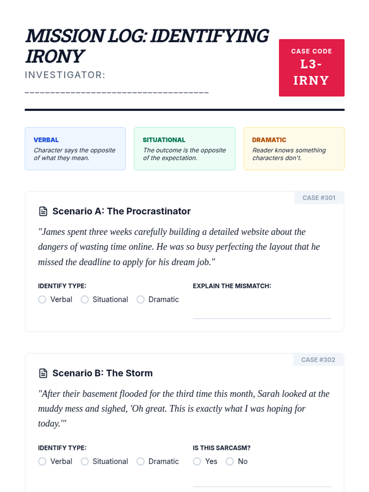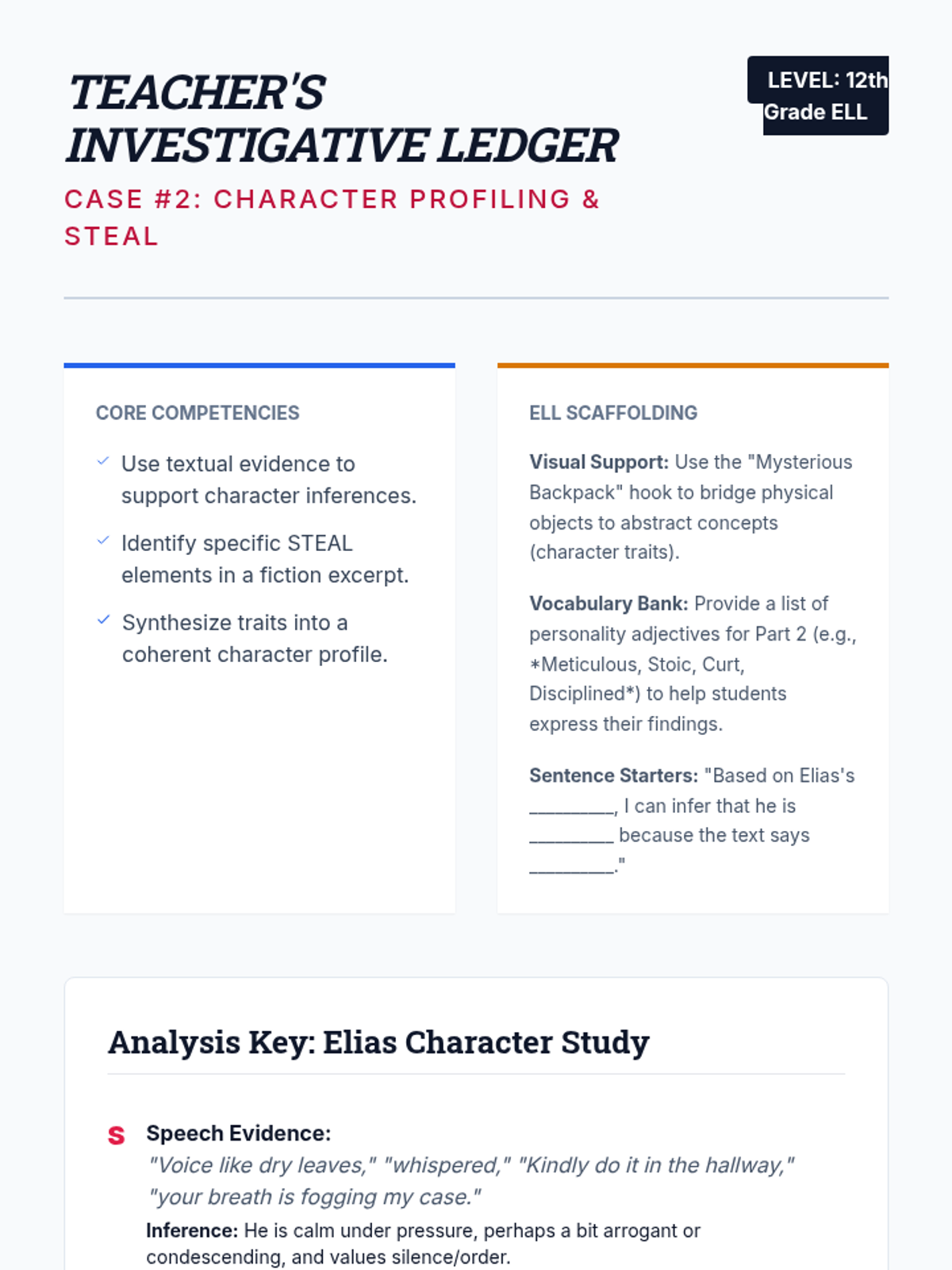A comprehensive sequence for 12th-grade ELL students focused on identifying implicit meaning, analyzing character motivations, and understanding the emotional architecture of fiction through tone and mood. Students progress from word-level connotation to thematic synthesis using a detective-themed 'Word Sleuth' framework.